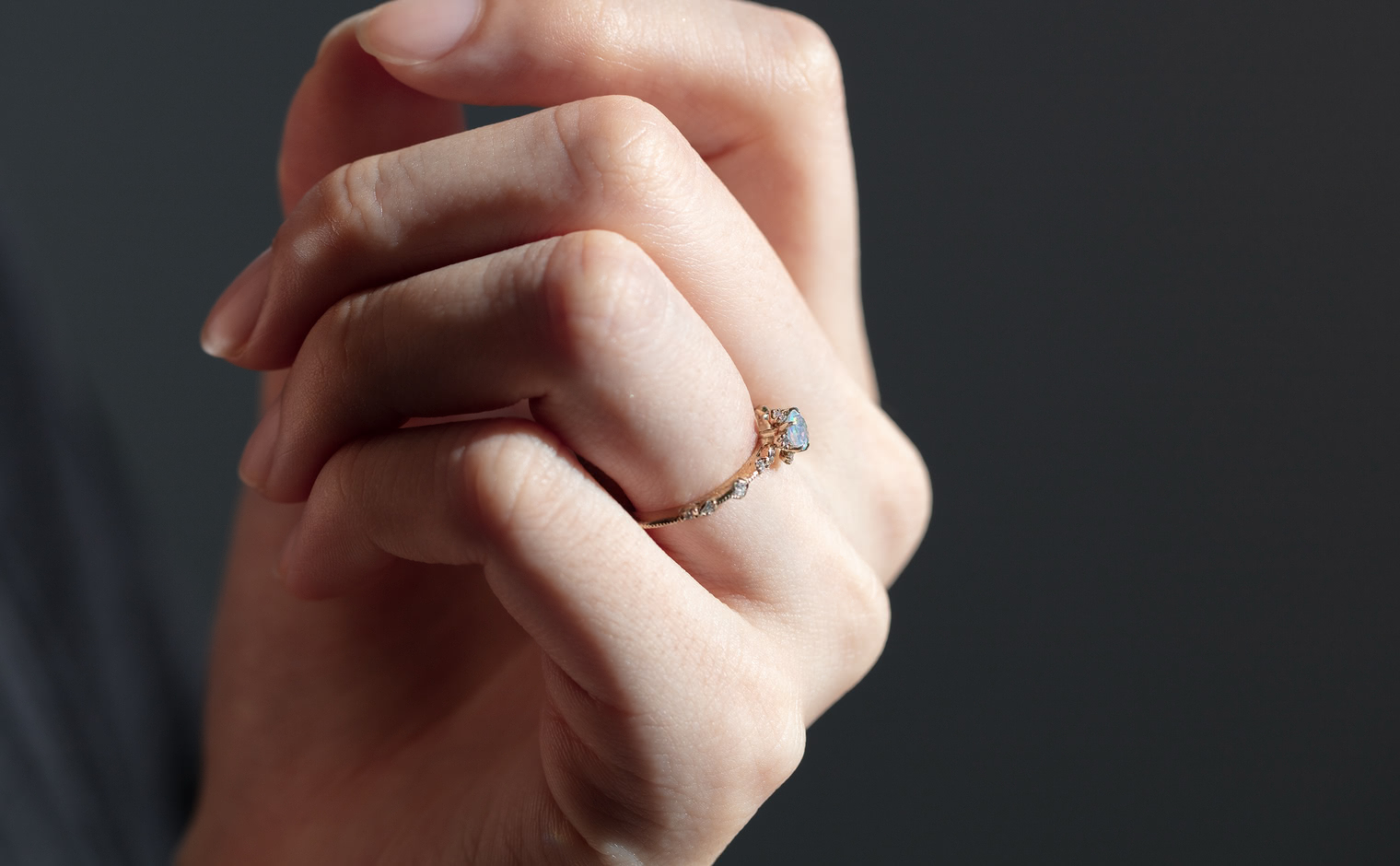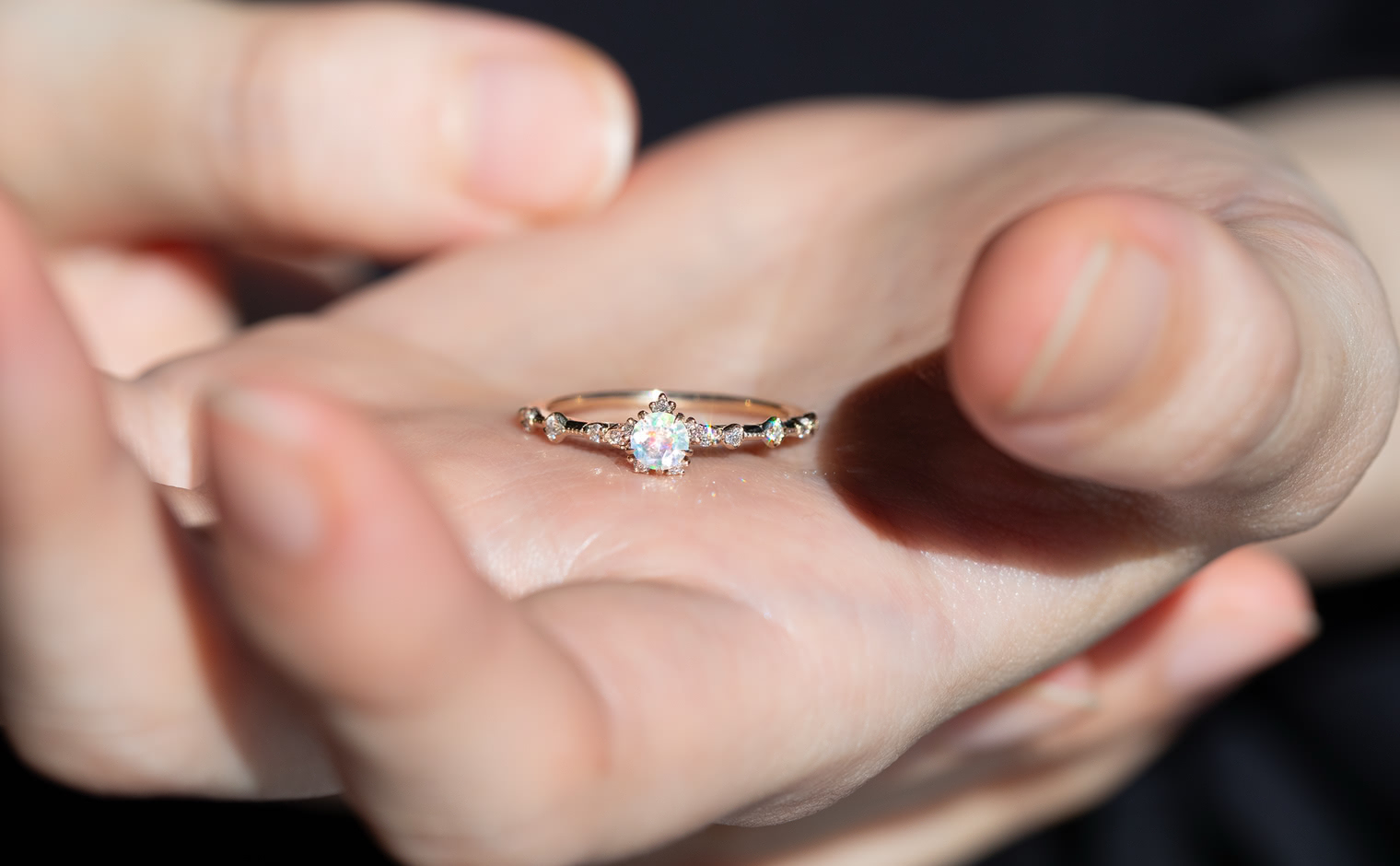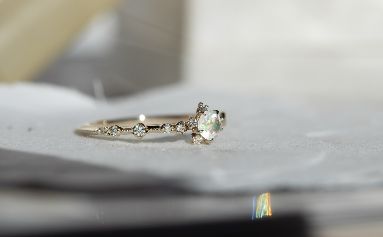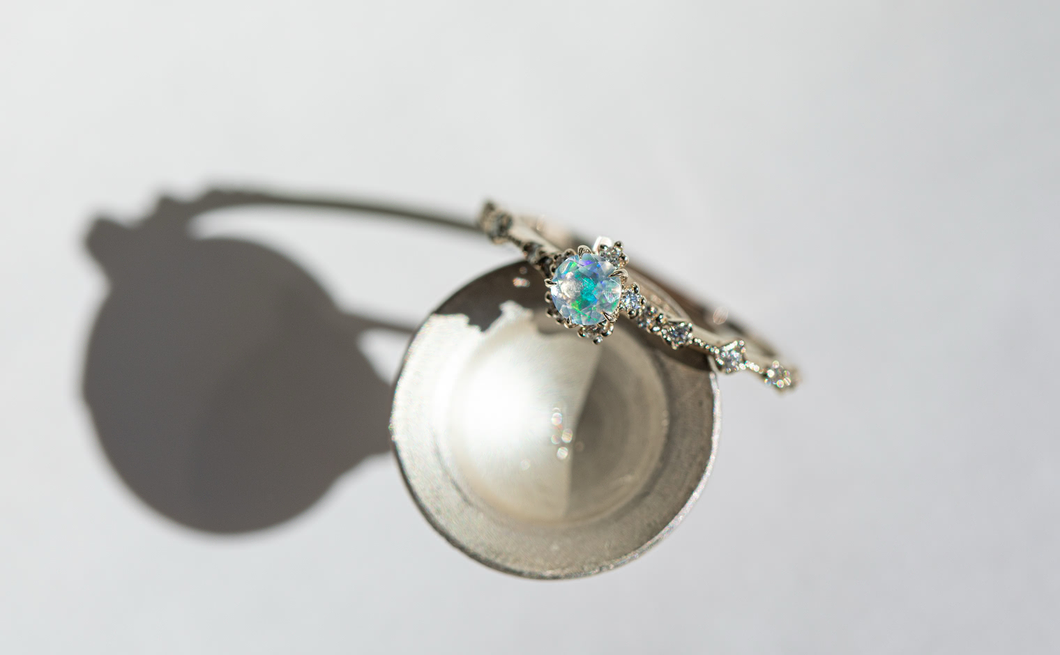 A fleeting shimmer, where opal’s radiance unveils soft depths of color. The Snowflake Ring-Opal captures quiet brilliance, a graceful expression of mystery and light—whispered, luminous, and enduring.