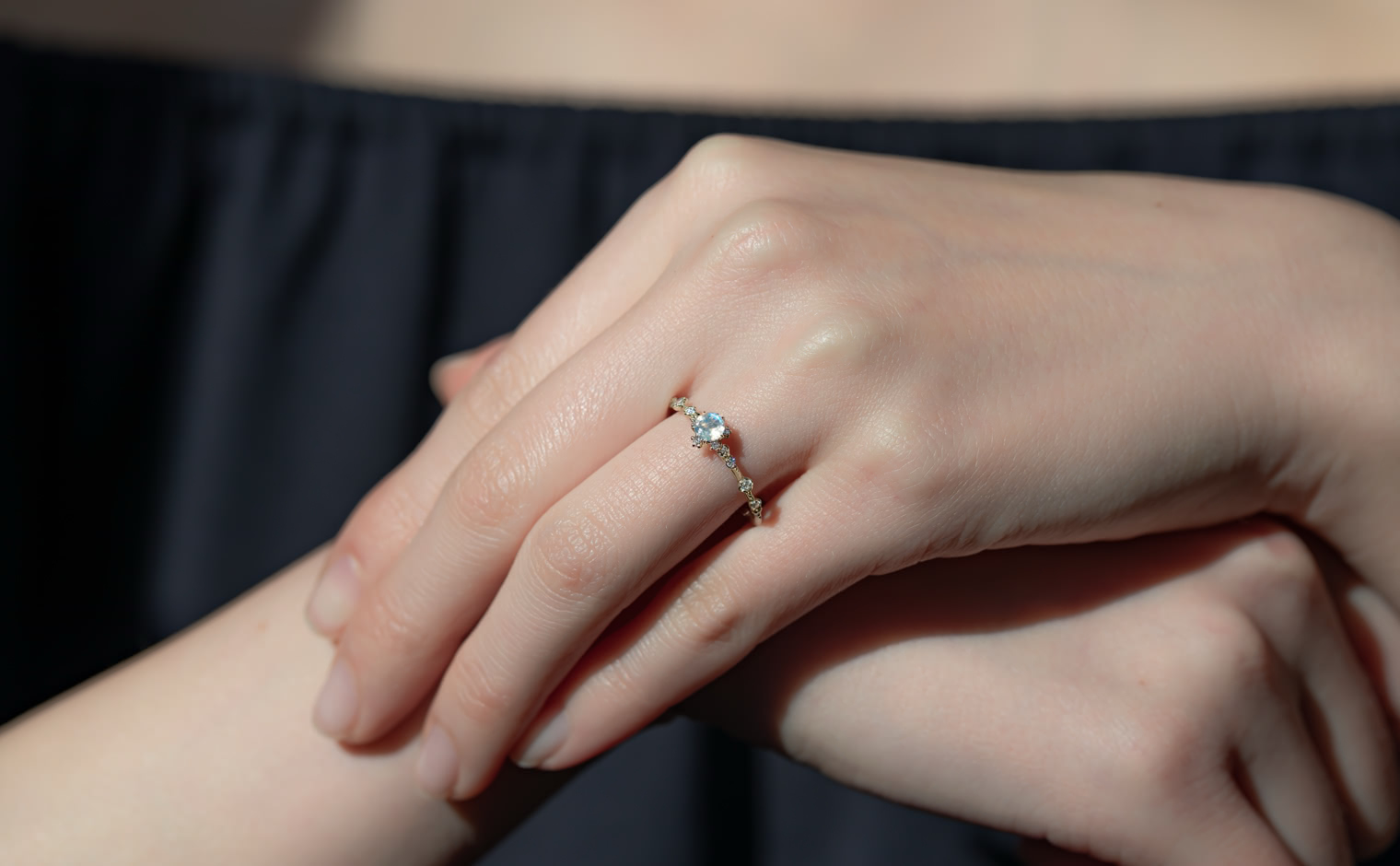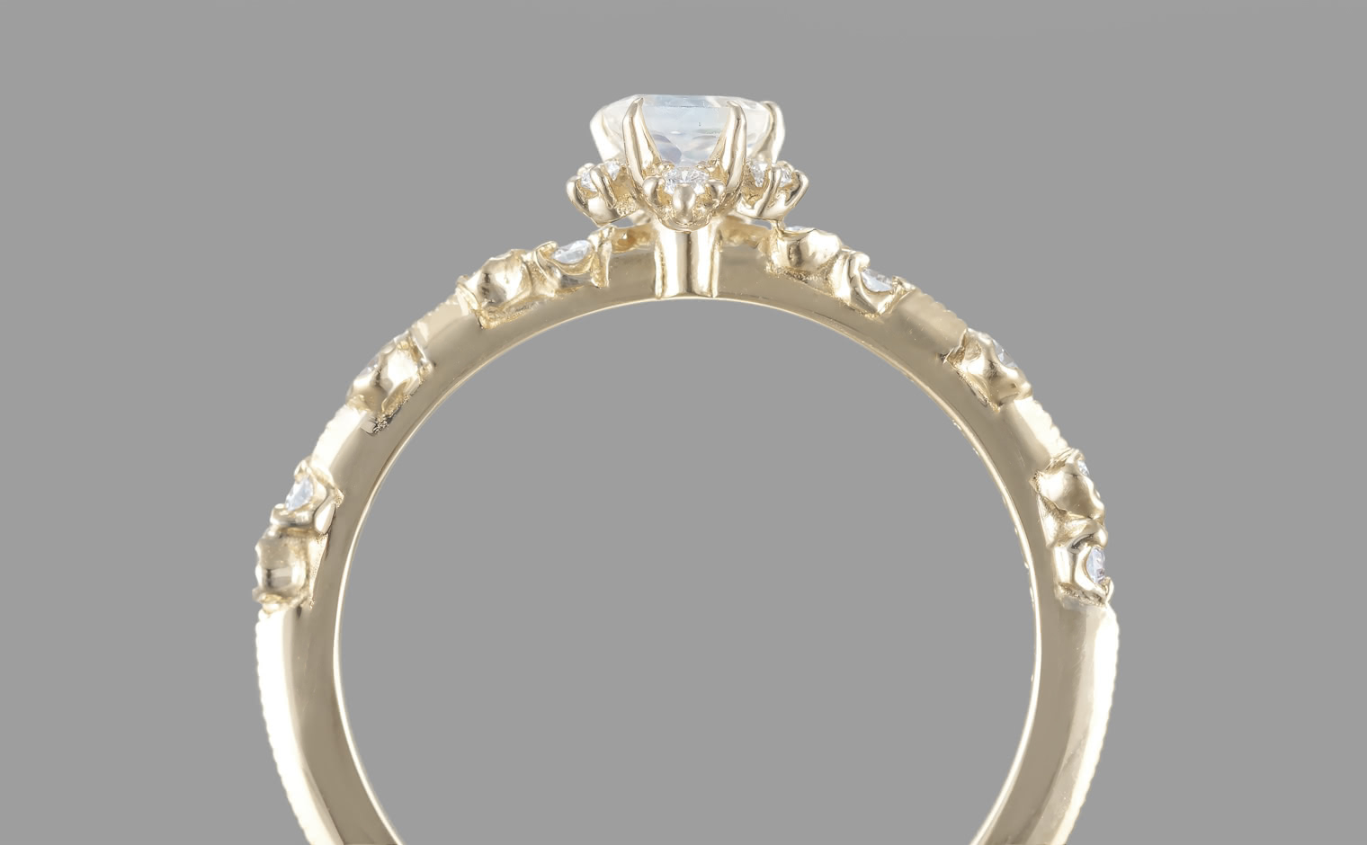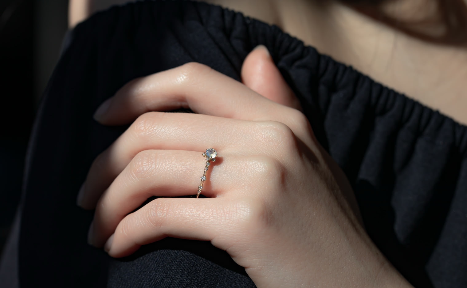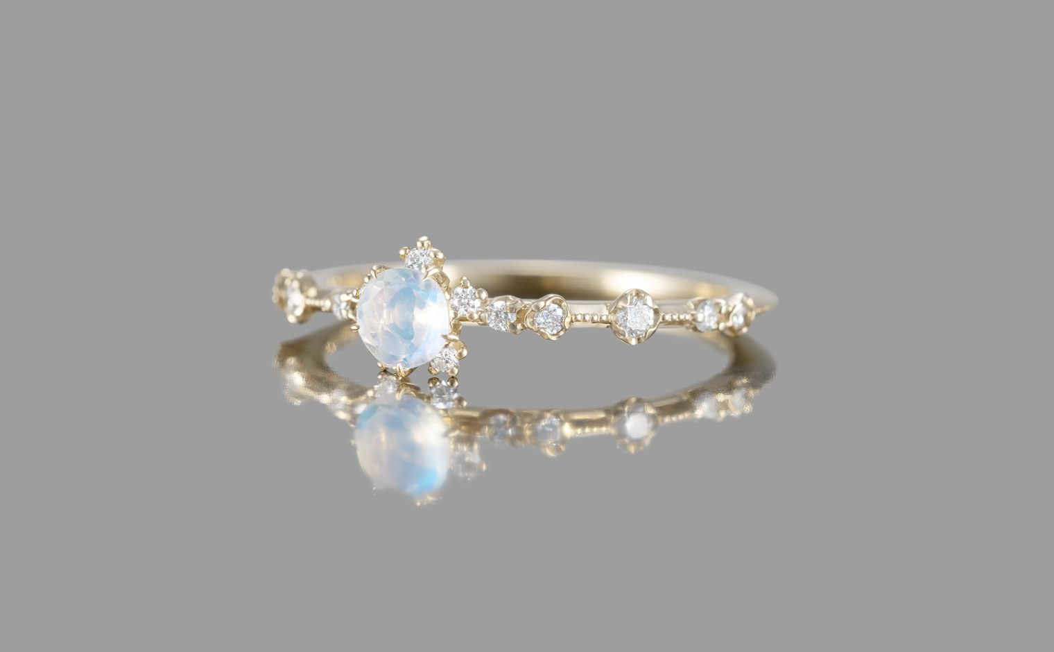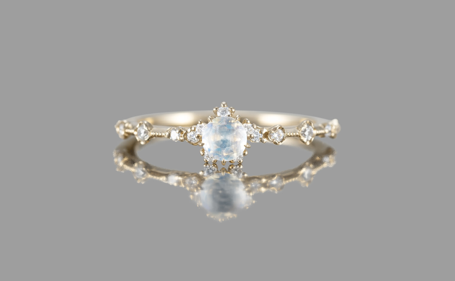 A fleeting radiance, where light drifts in spectral hues. The Snowflake Ring–Rainbow Moonstone reflects celestial artistry, a whispered expression of serene sophistication—luminous, evocative, and infinite.