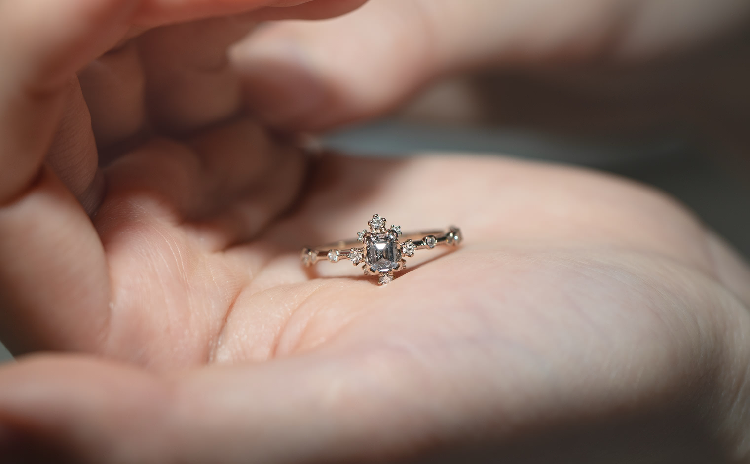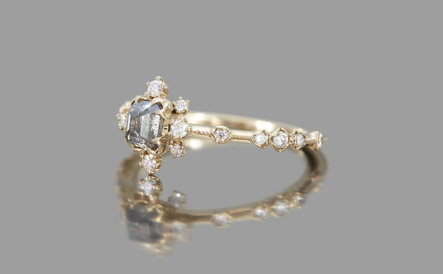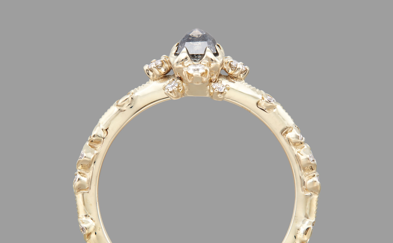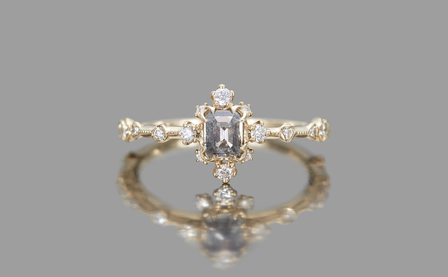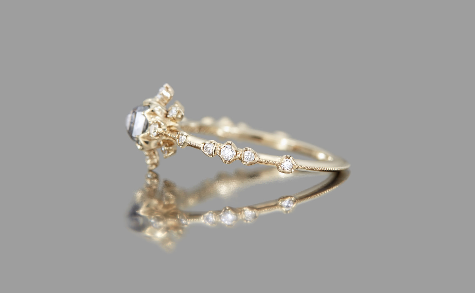 Experience a fairytale fantasy come to life with the Snowflake Ring Supreme-Gray Diamond, expertly crafted to sublime perfection. This rare and exquisite dark gray diamond is nestled within the signature kataoka Snowflake setting, complete with a sweet diamond halo and bright diamond accents. The finely crafted custom-metal slim band is finished with delicate milgrain edging.
