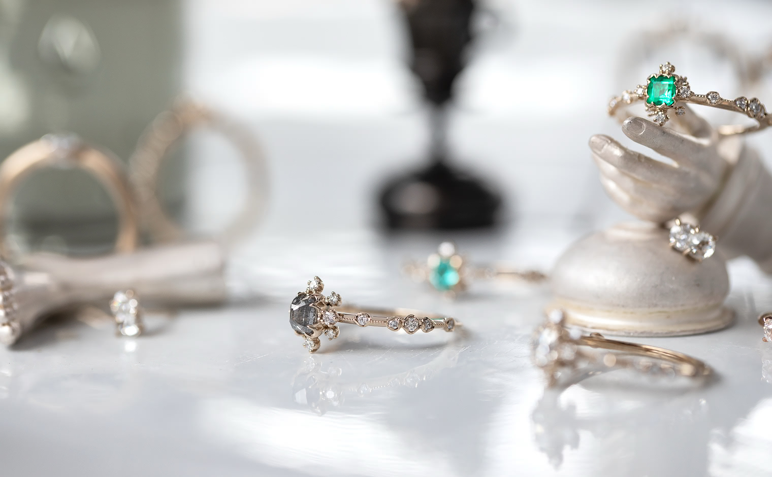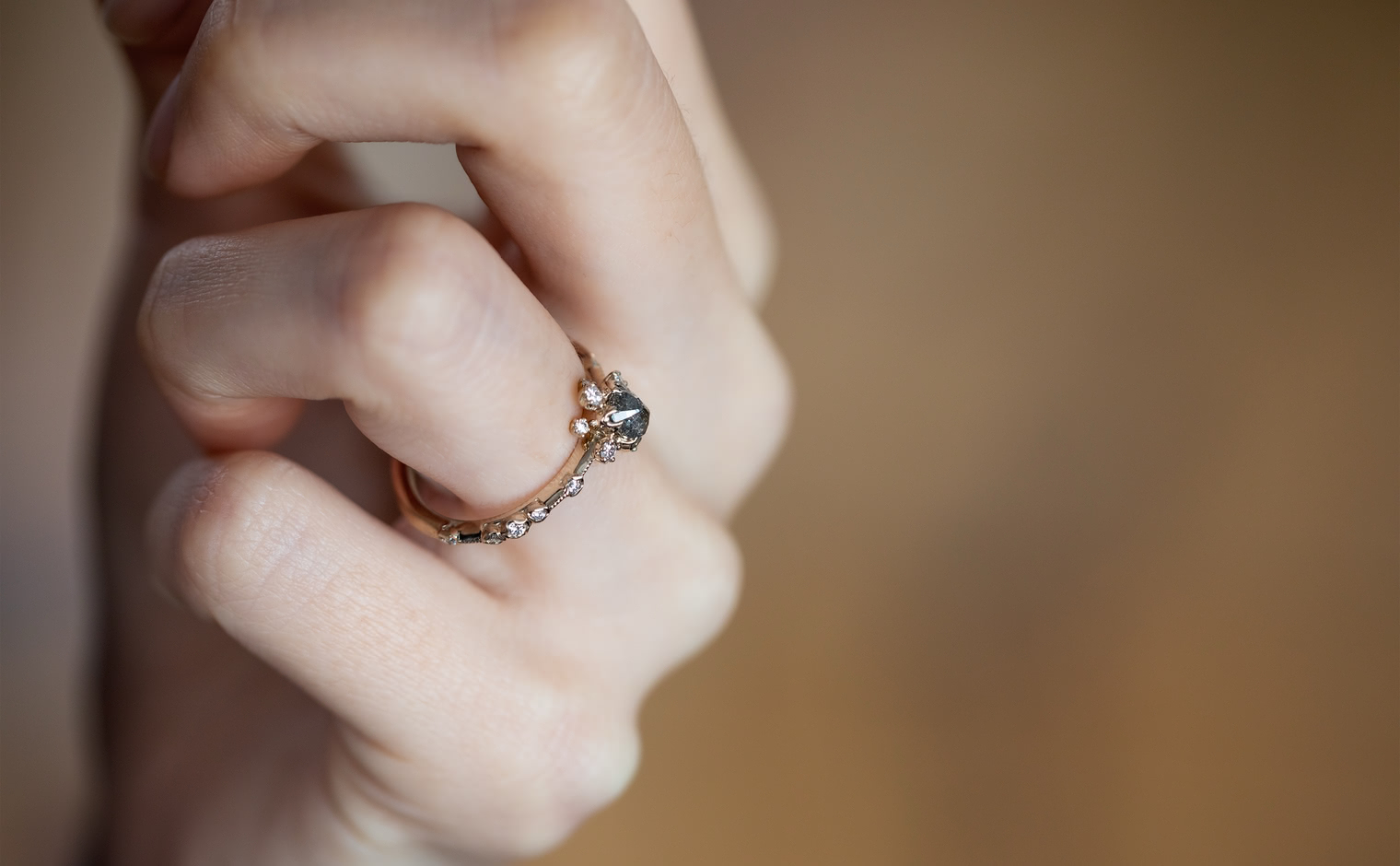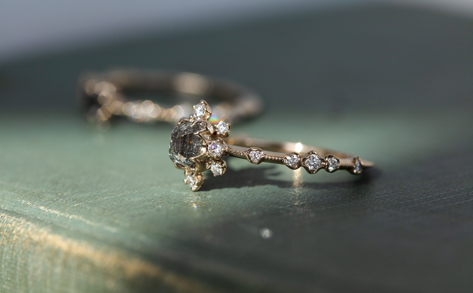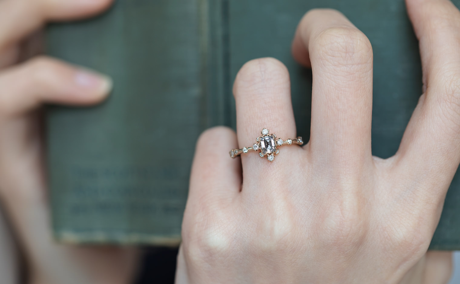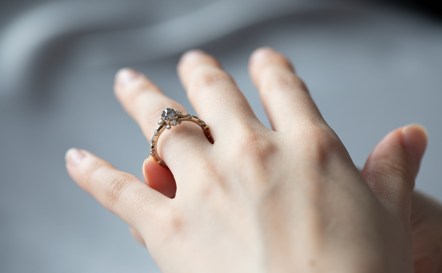 Experience a fairytale fantasy come to life with the Snowflake Ring Supreme-Gray Diamond, expertly crafted to sublime perfection. This rare and exquisite dark gray diamond is nestled within the signature kataoka Snowflake setting, complete with a sweet diamond halo and bright diamond accents. The finely crafted custom-metal slim band is finished with delicate milgrain edging.