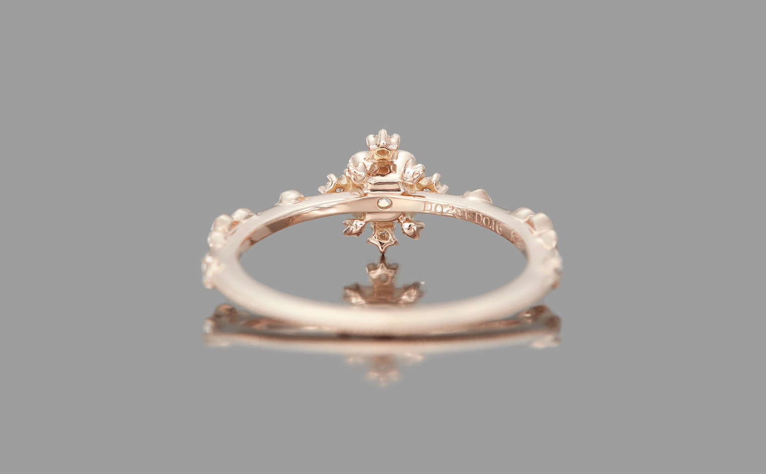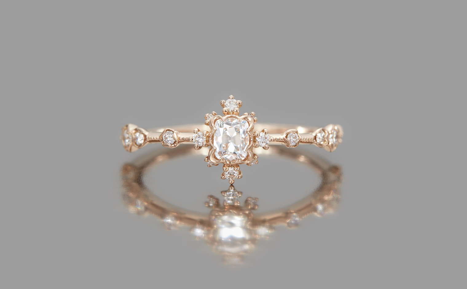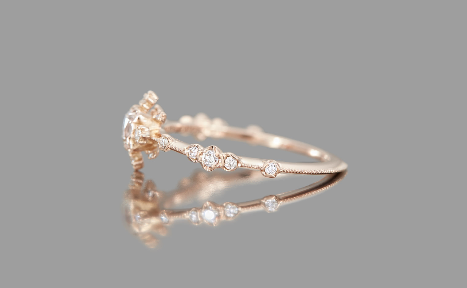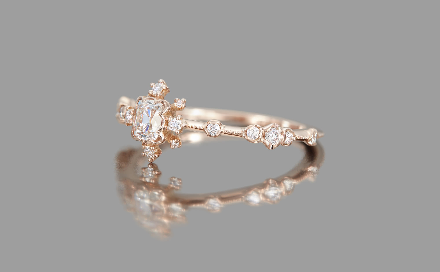 Experience the Shade of Love with the Snowflake Ring Supreme-Old Mine. This exquisite ring features an immaculate diamond star held in place by rose gold prongs and surrounded by a fractal of snowy diamonds and glowing accents. The refined milgrain-edged rose gold band adds a touch of elegance to the design.