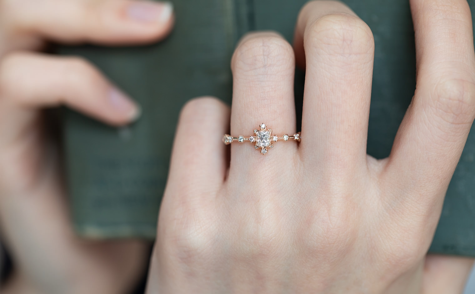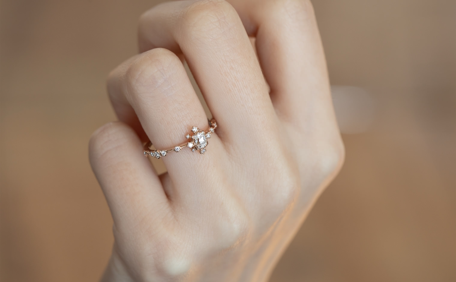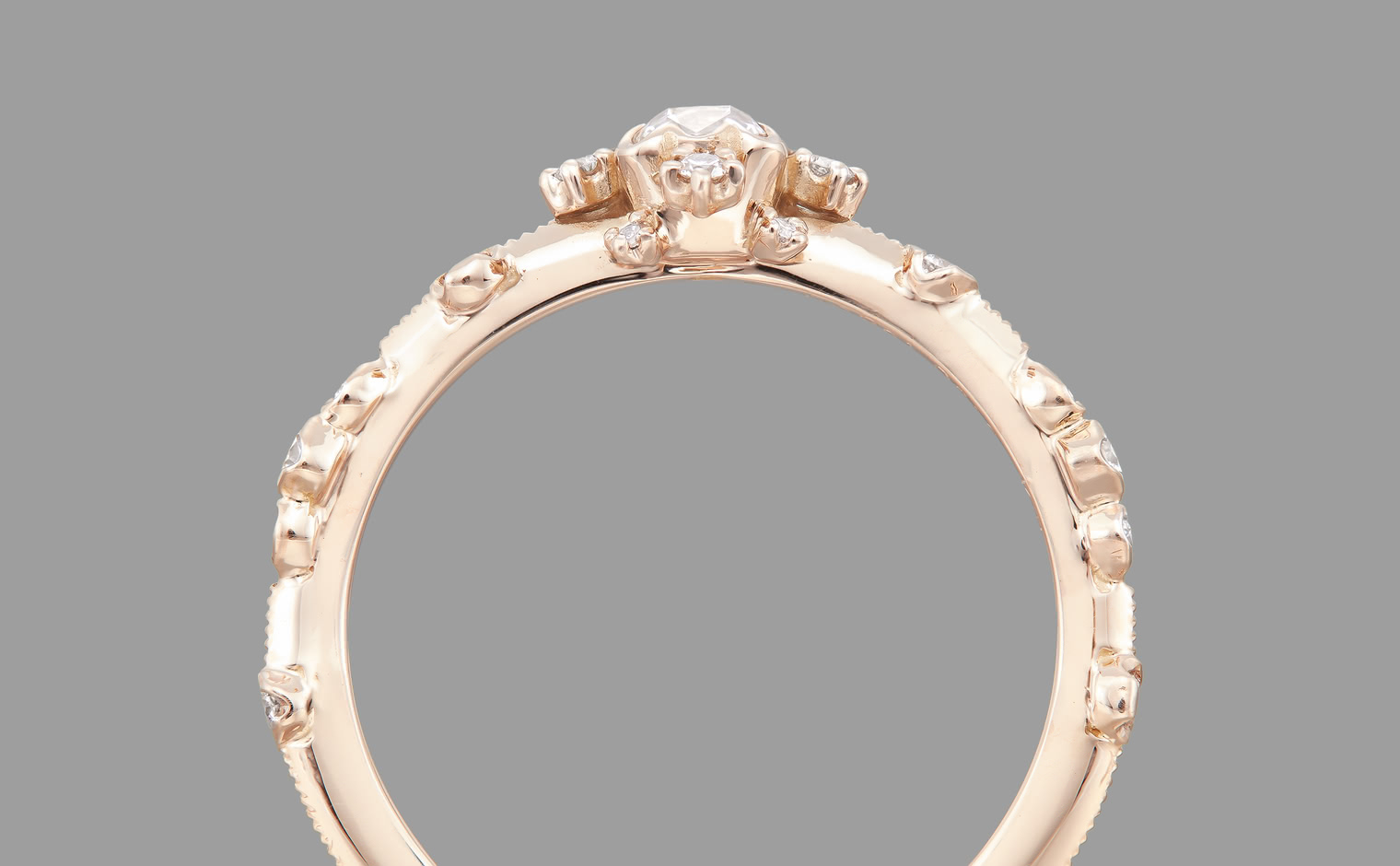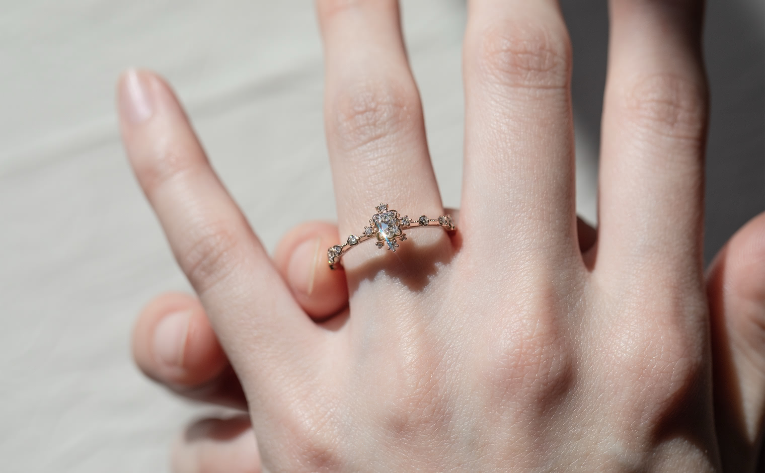 Experience the Shade of Love with the Snowflake Ring Supreme-Old Mine. This exquisite ring features an immaculate diamond star held in place by rose gold prongs and surrounded by a fractal of snowy diamonds and glowing accents. The refined milgrain-edged rose gold band adds a touch of elegance to the design.