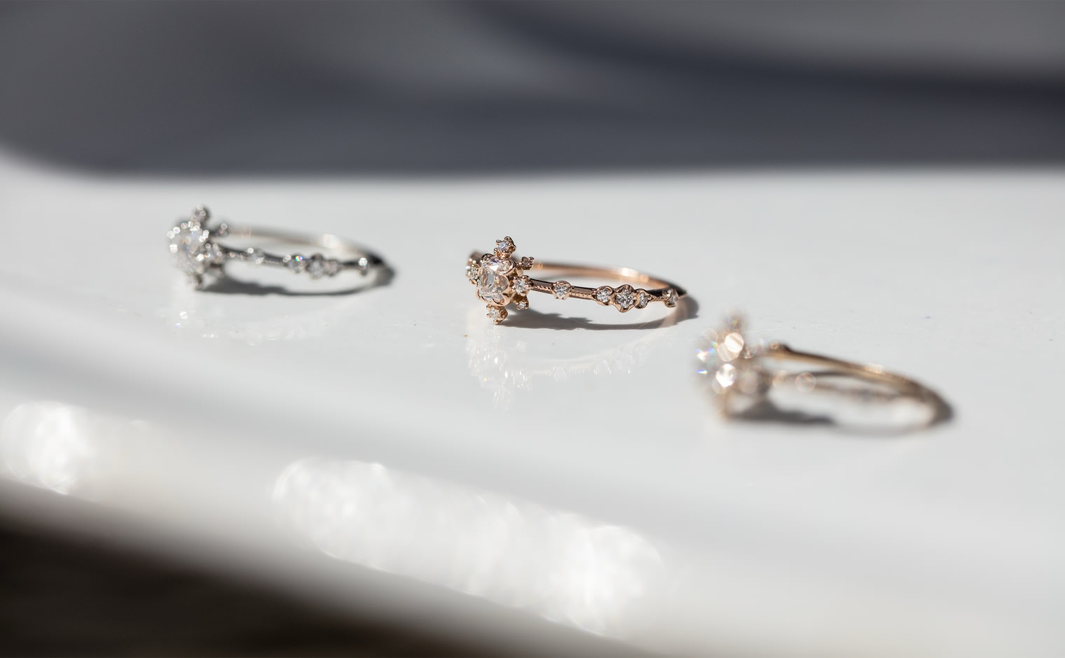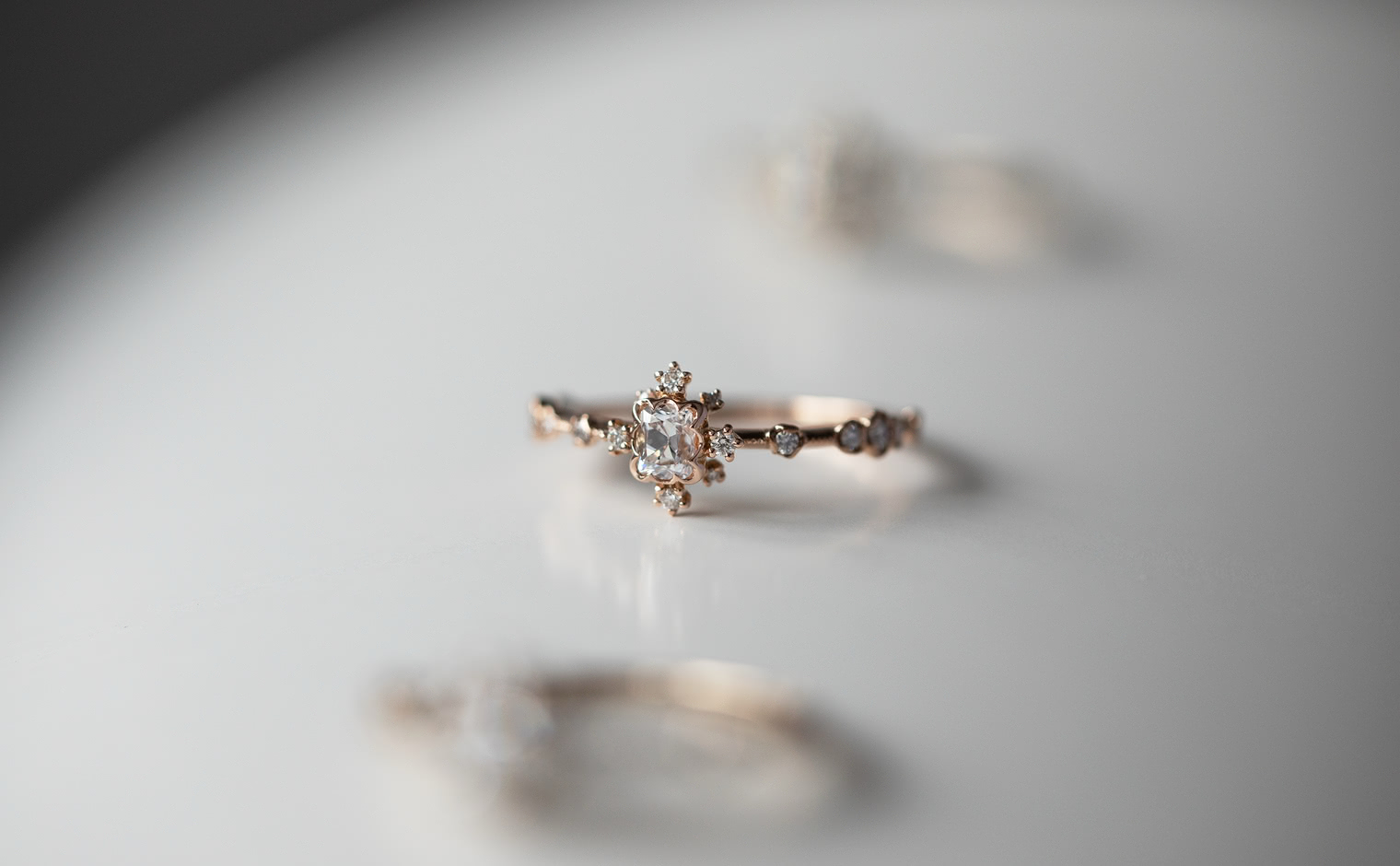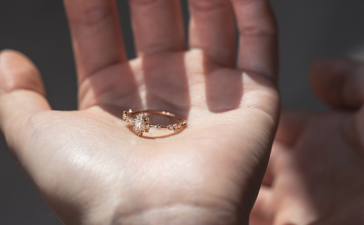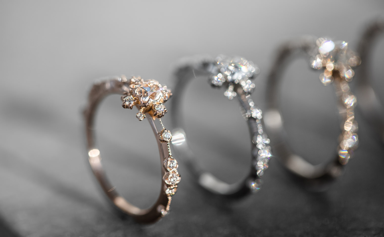 Experience the Shade of Love with the Snowflake Ring Supreme-Old Mine. This exquisite ring features an immaculate diamond star held in place by rose gold prongs and surrounded by a fractal of snowy diamonds and glowing accents. The refined milgrain-edged rose gold band adds a touch of elegance to the design.
