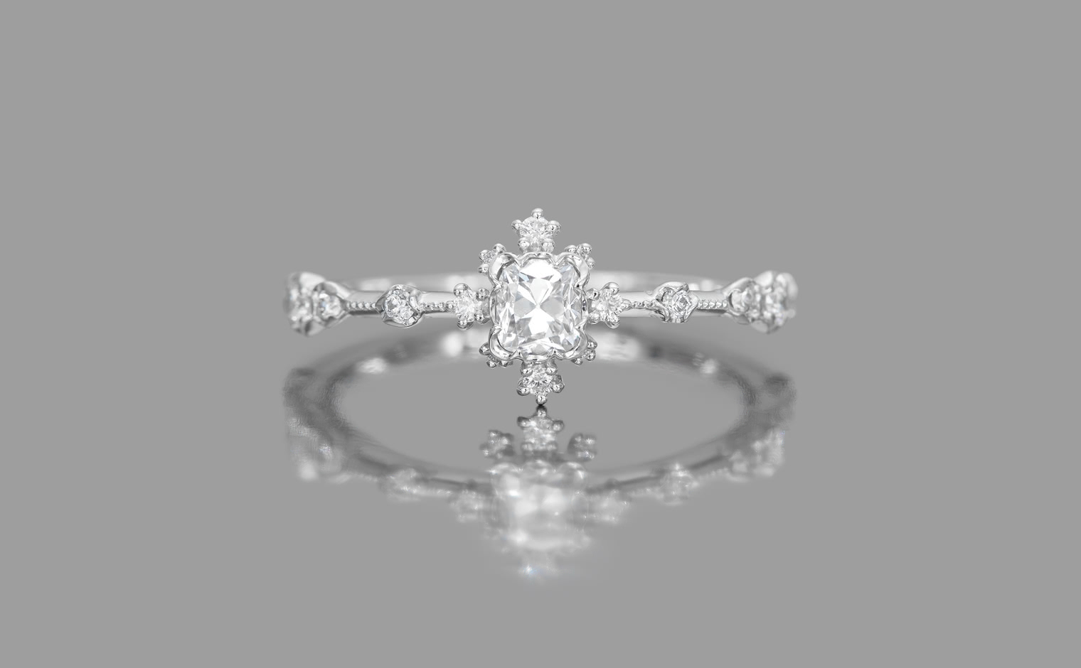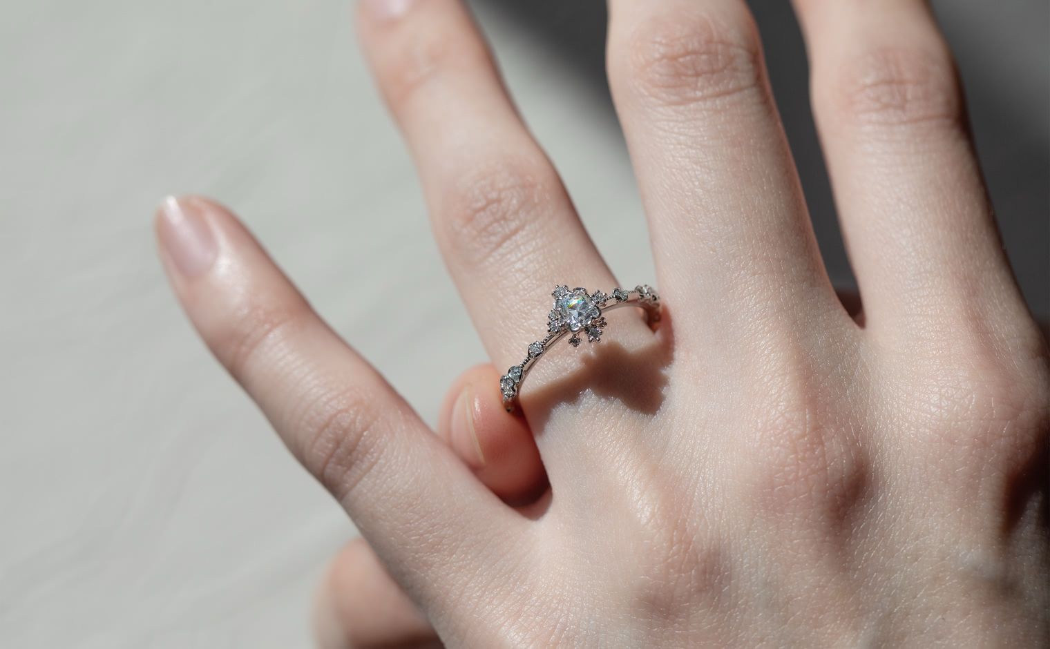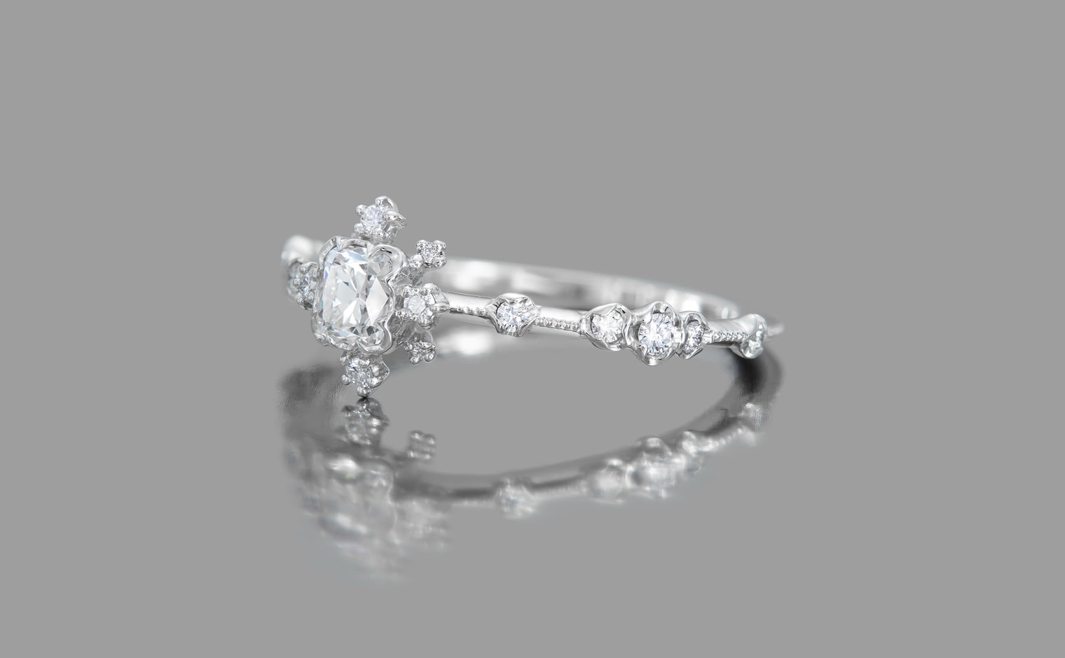 A soft shimmer, where light lingers in delicate formation. The Snowflake Ring Supreme–Old Mine embodies quiet sophistication, a whispered expression of grace and timeless elegance.