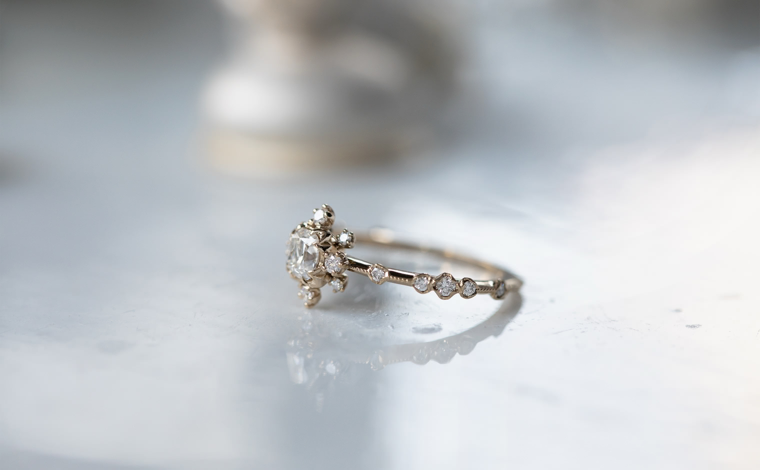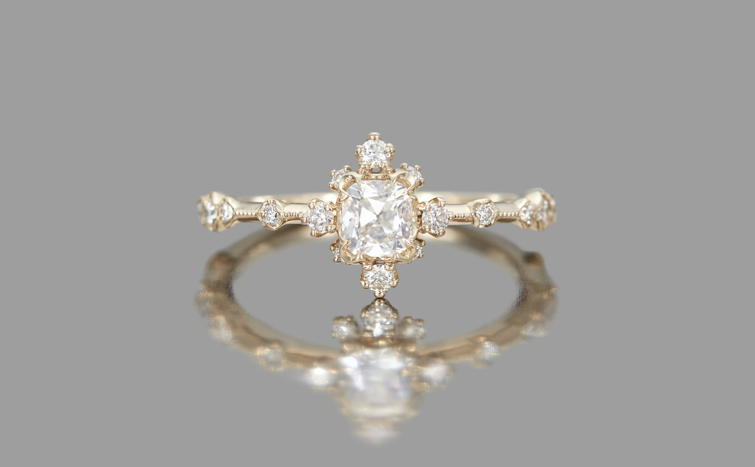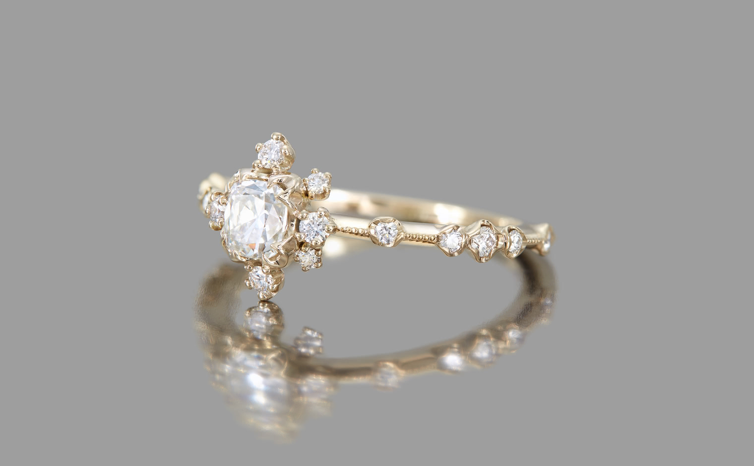 The Snowflake Ring Supreme-Old Mine encapsulates fleeting moments and ageless memories. Its centerpiece, an old mine cut diamond, is surrounded by a dance of gems, reminiscent of secret winter promises and pristine snow-draped mornings. The delicate milgrain-edged beige gold band adds a touch of timeless elegance, bridging the past and the present.