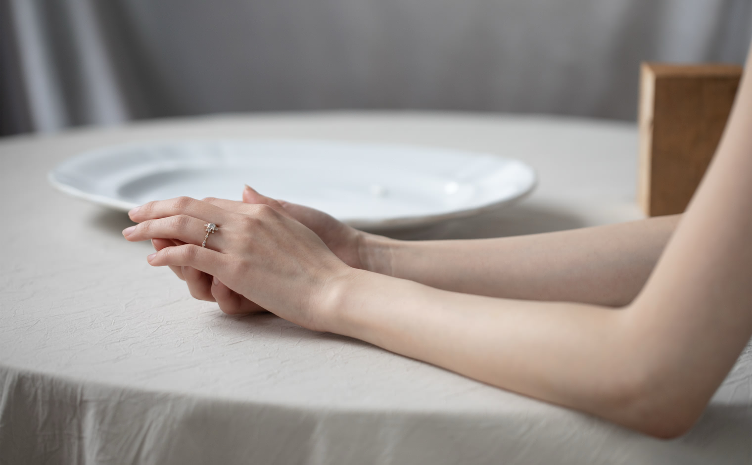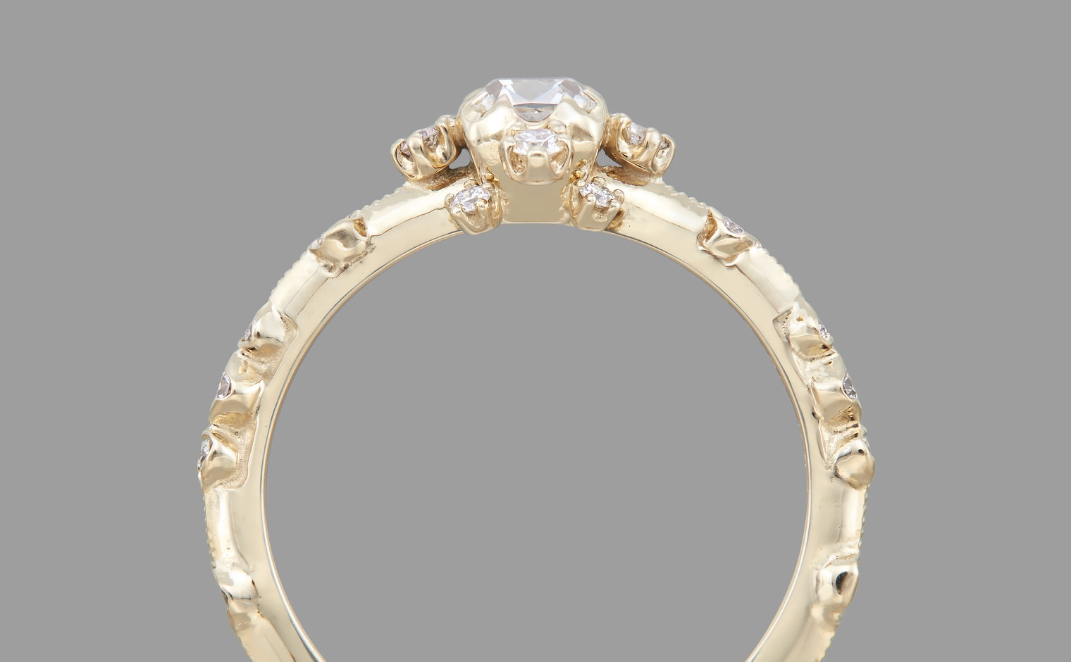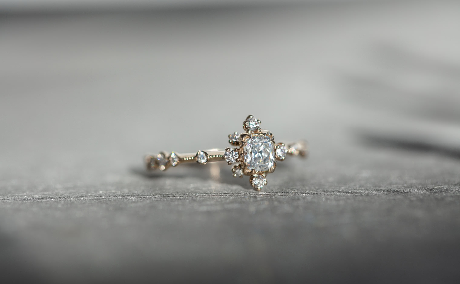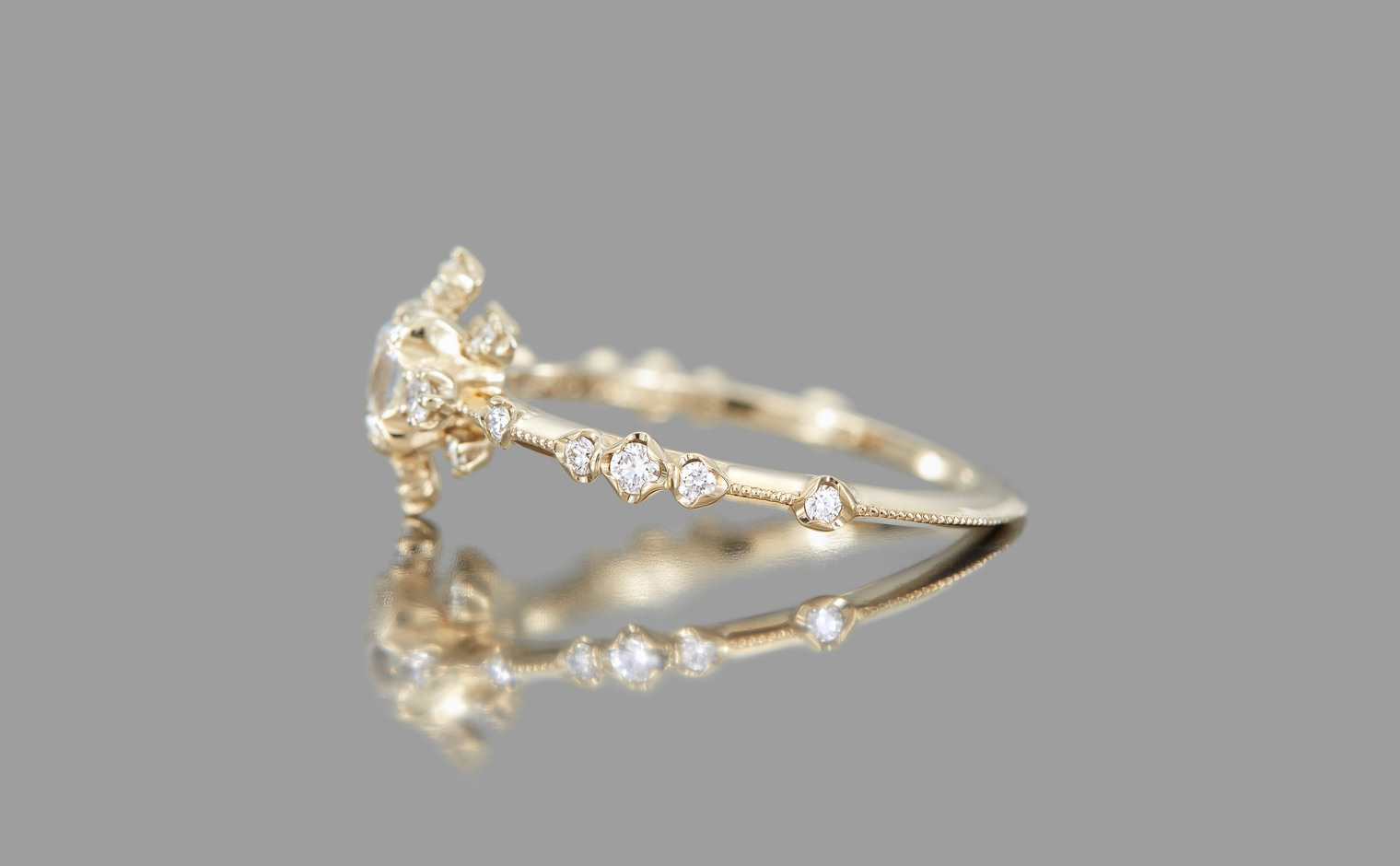 The Snowflake Ring Supreme-Old Mine encapsulates fleeting moments and ageless memories. Its centerpiece, an old mine cut diamond, is surrounded by a dance of gems, reminiscent of secret winter promises and pristine snow-draped mornings. The delicate milgrain-edged beige gold band adds a touch of timeless elegance, bridging the past and the present.