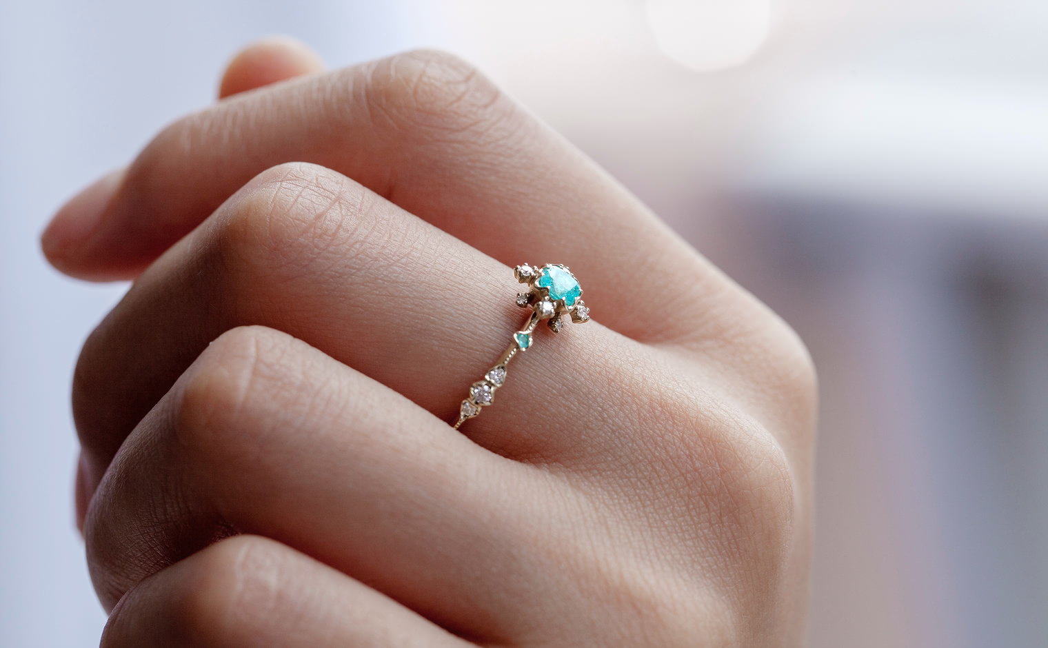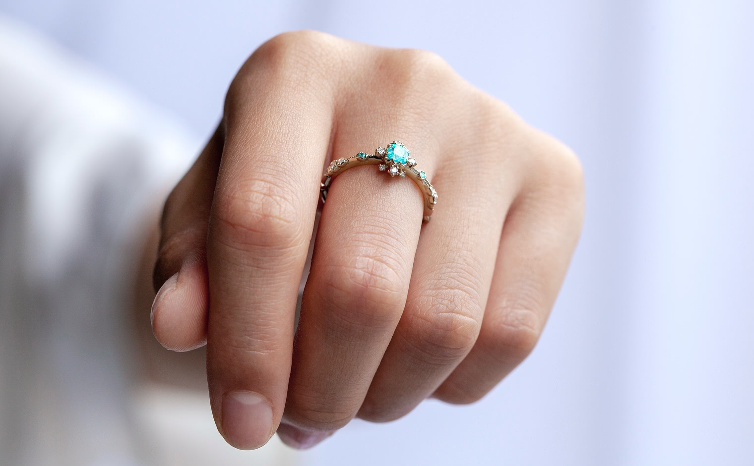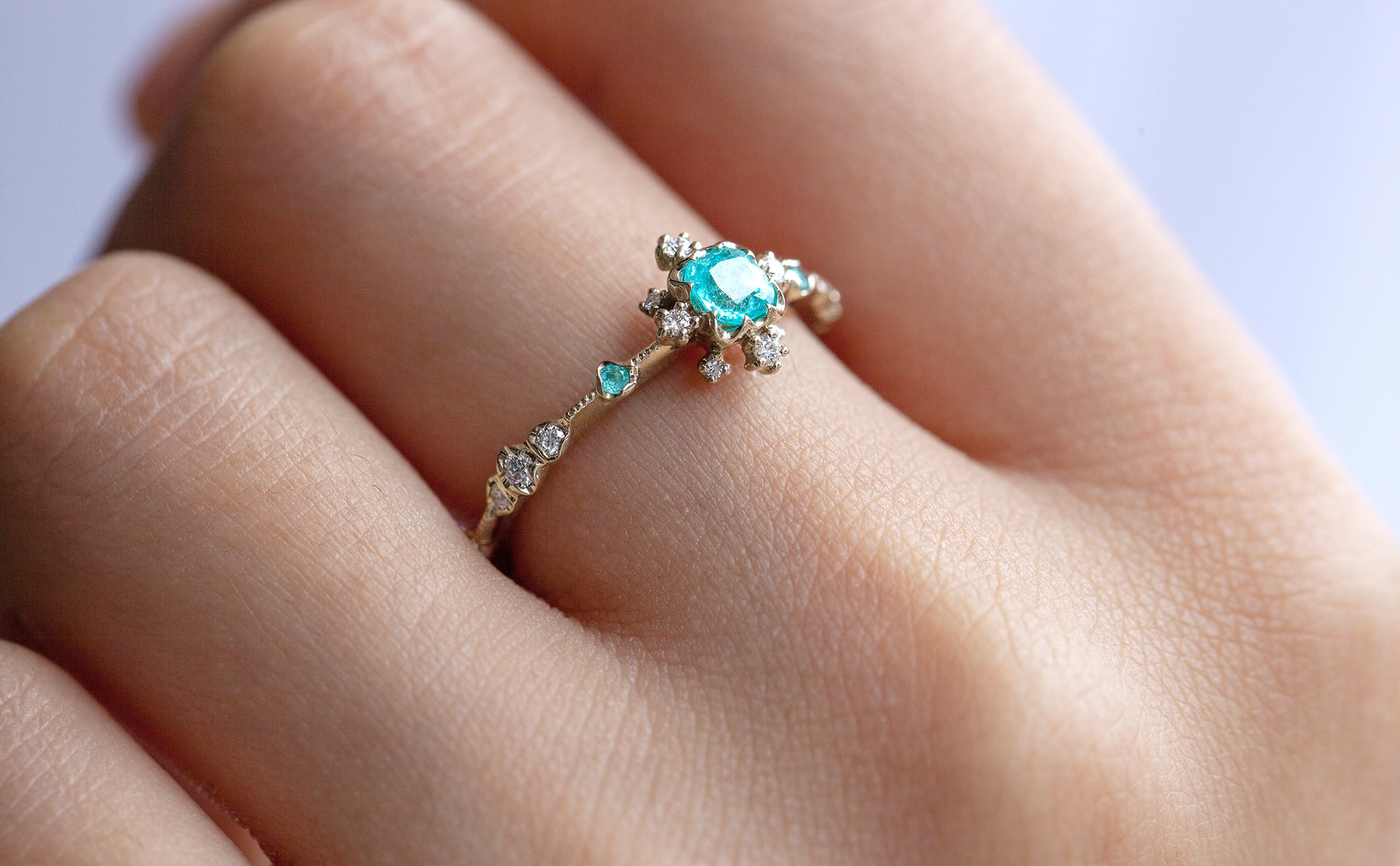 An everlasting divine winter creation. With its gloriously radiant glowing aqua-hued Paraiba tourmaline sitting atop a carefully handcrafted snowflake setting surrounded by the sweeping beauty of icy accent diamonds, the Snowflake Ring-Paraiba captures an enchanting blissful winter paradise on your finger.