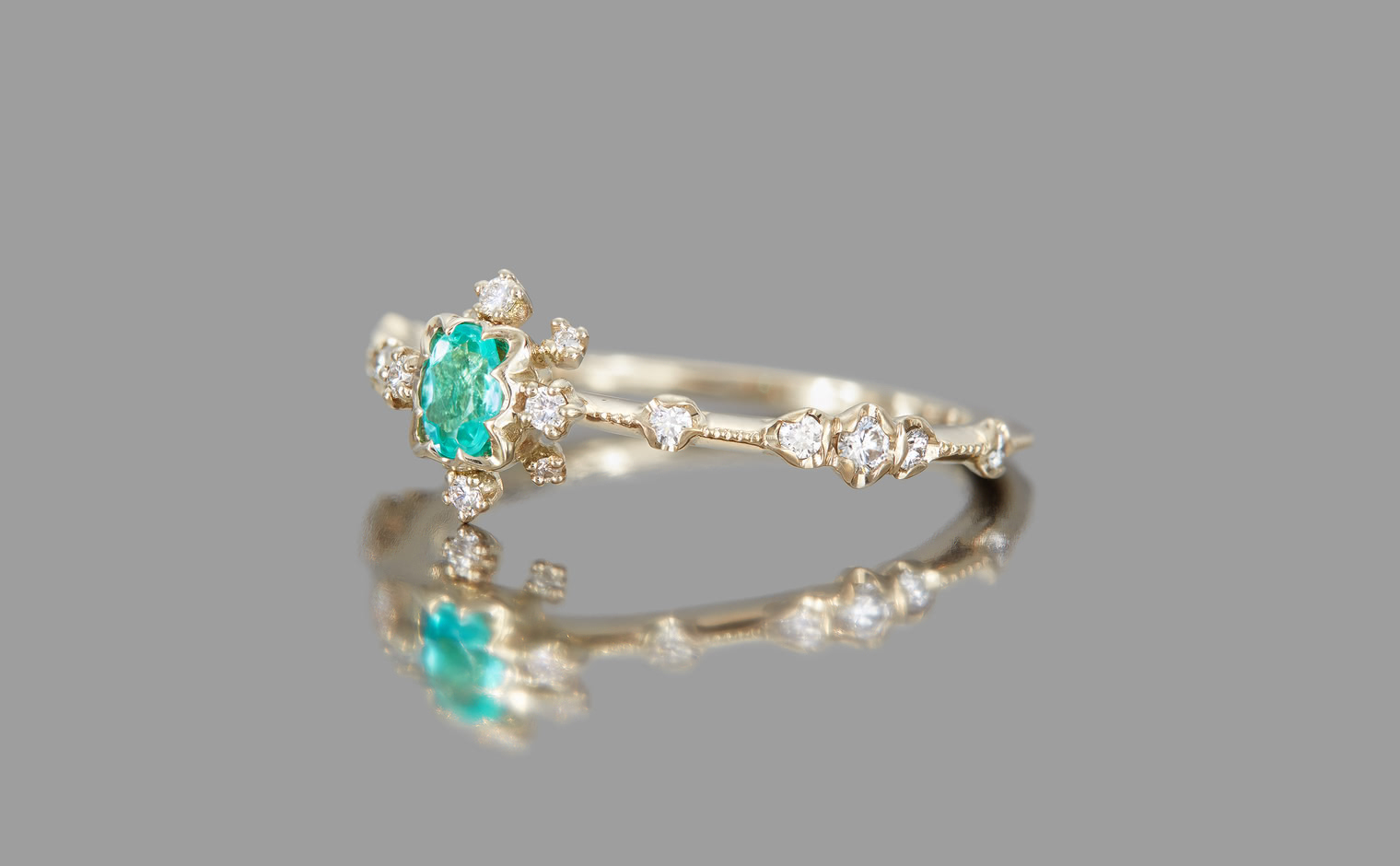 Immerse yourself in the natural beauty of the Snowflake Ring Supreme-Paraiba, reminiscent of a glowing crystal lake on an icy winter day. This exquisite ring features a select Paraiba tourmaline set atop a corona of dazzling icy white diamonds and sparkling accents, all on a slim custom-metal band with a delicate hand-applied milgrain finish.