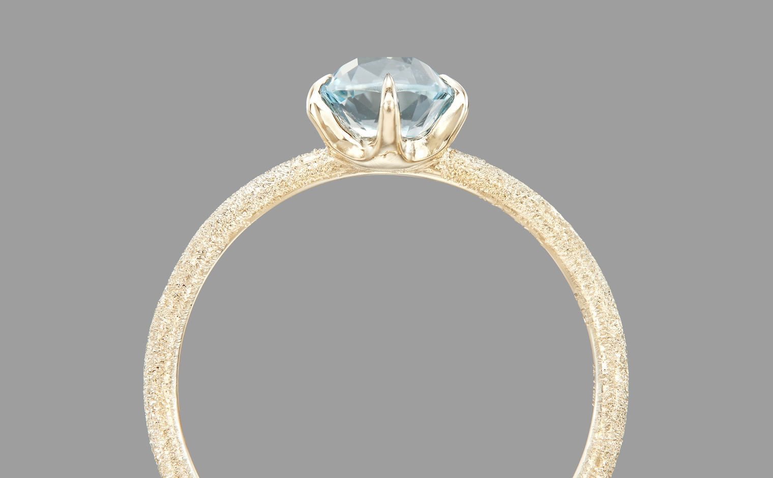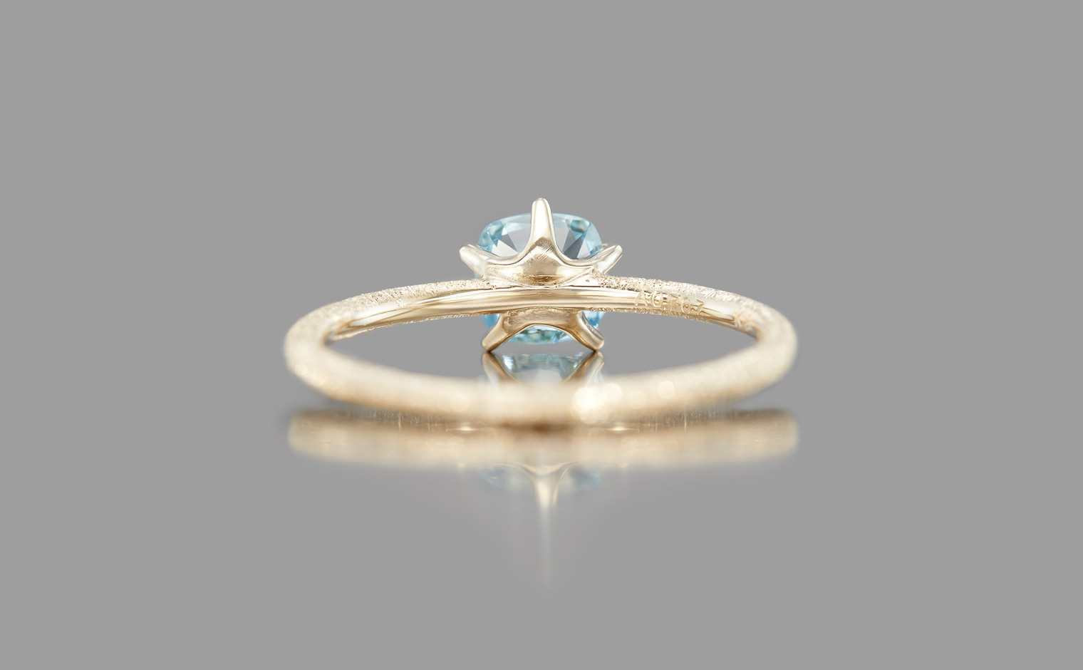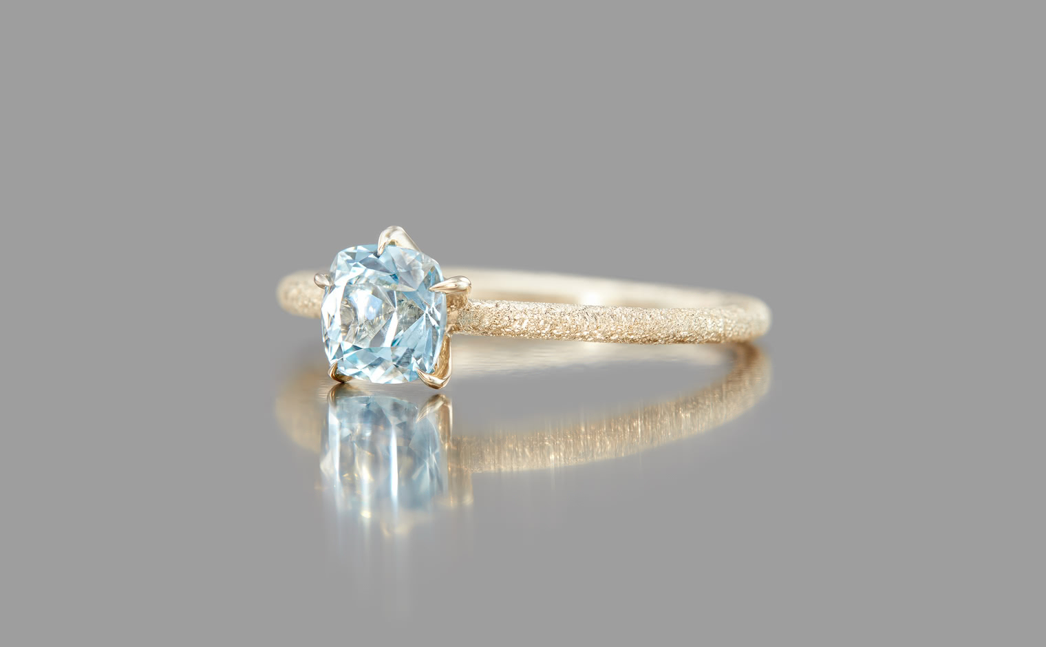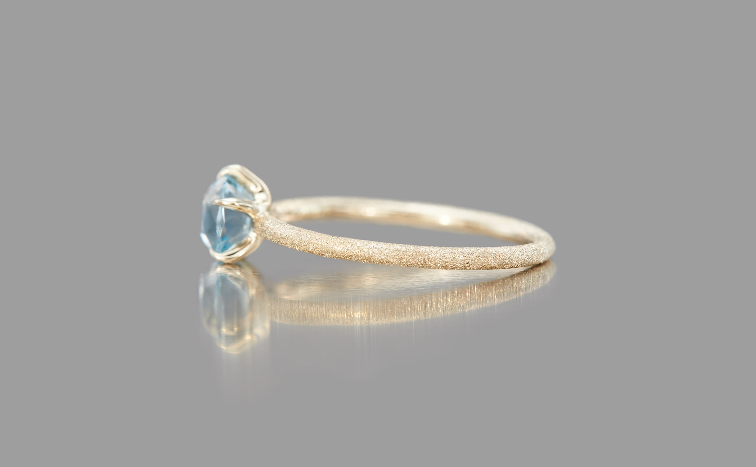 Fantasize of floating away with this delicate masterpiece where the sky-blue horizon meets the twinkling night stars. With its gleaming soft blue Aquamarine set expertly on a handcrafted slender stardust-polished beige gold band, the magical Stardust Ring-Aquamarine will whisk you away where dreams run forevermore.