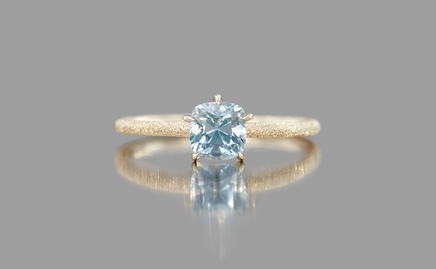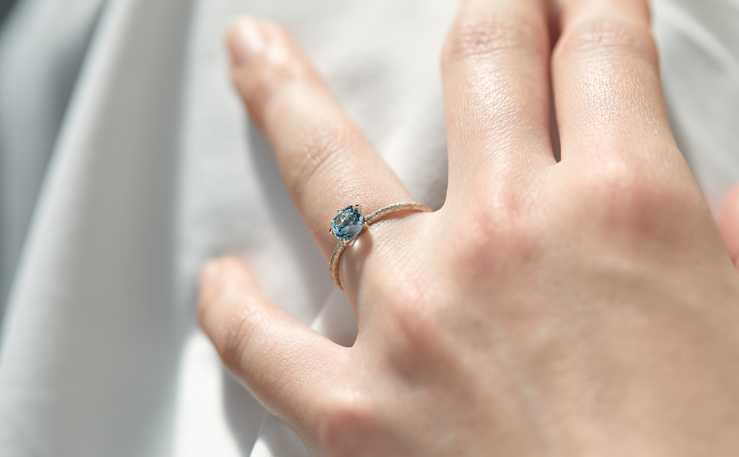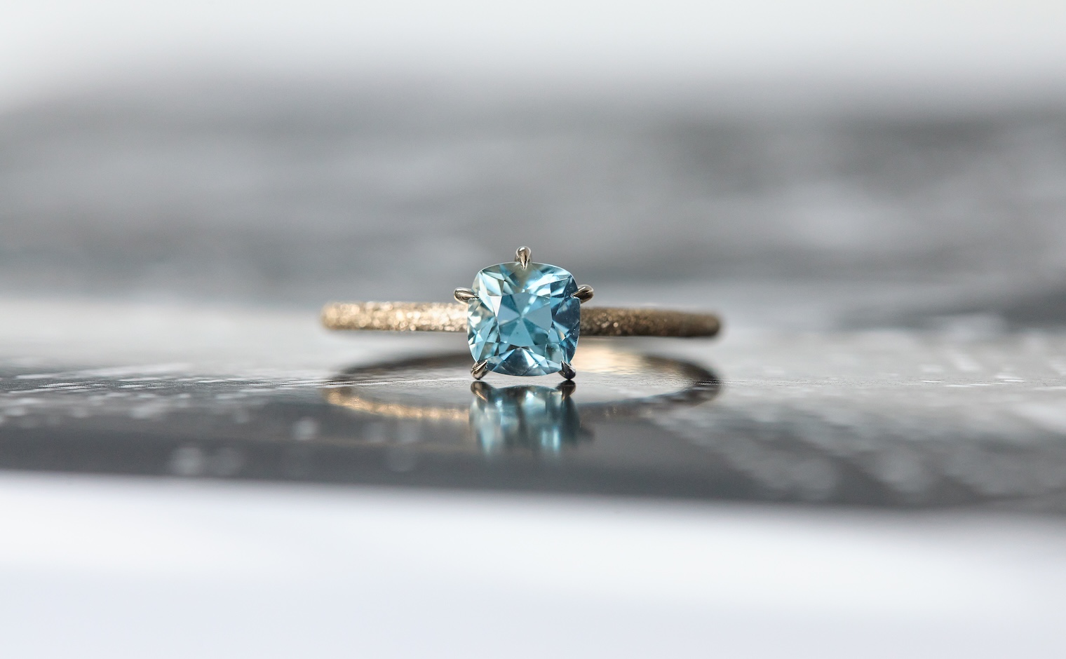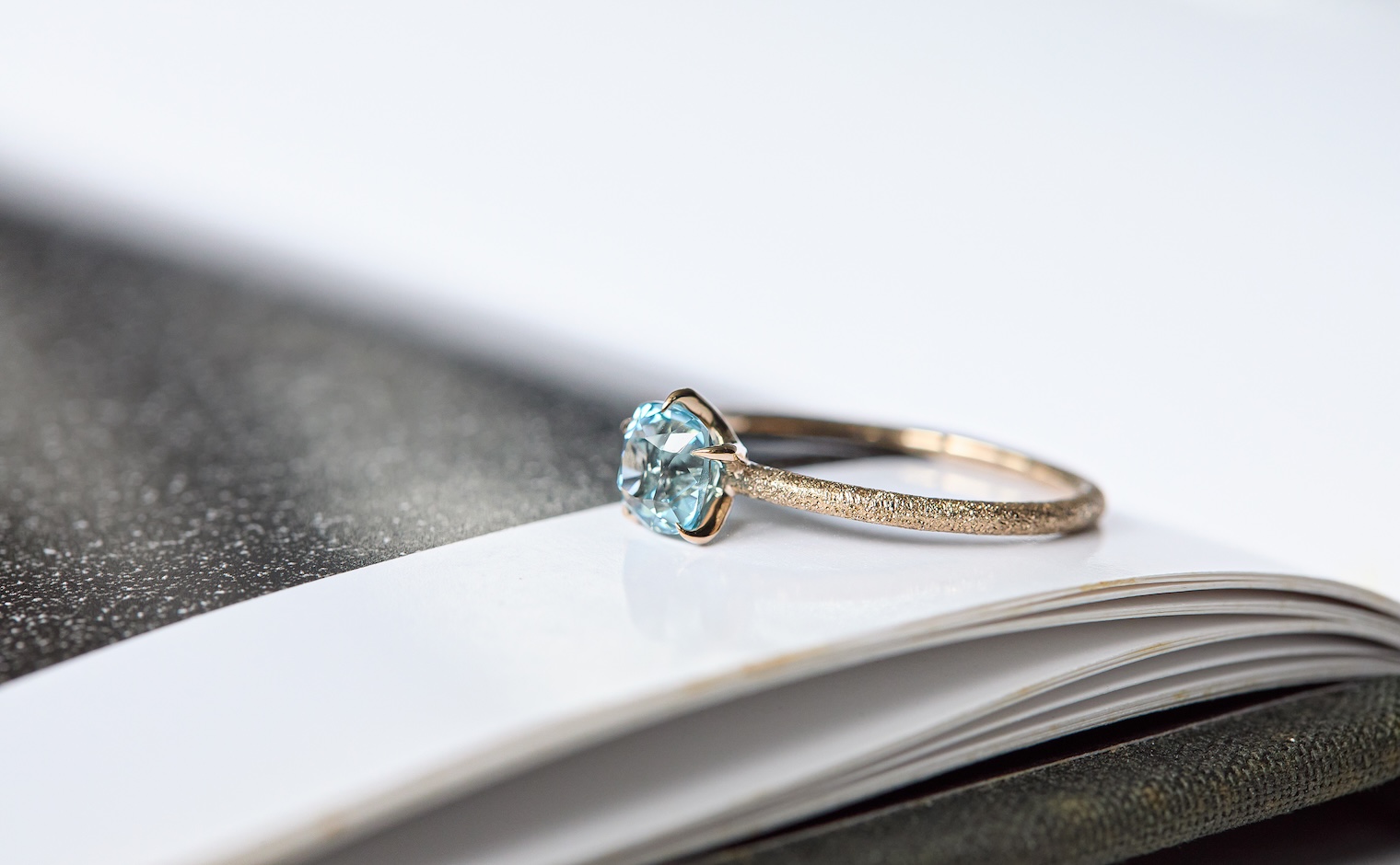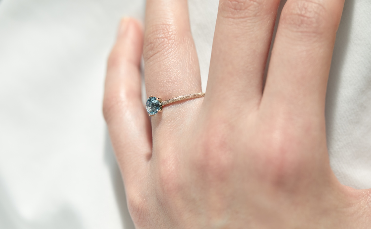 Fantasize of floating away with this delicate masterpiece where the sky-blue horizon meets the twinkling night stars. With its gleaming soft blue Aquamarine set expertly on a handcrafted slender stardust-polished beige gold band, the magical Stardust Ring-Aquamarine will whisk you away where dreams run forevermore.