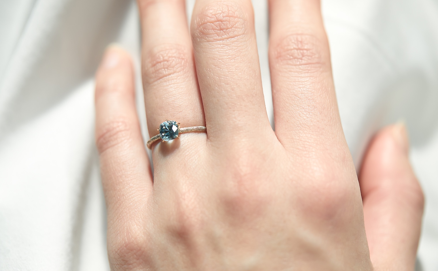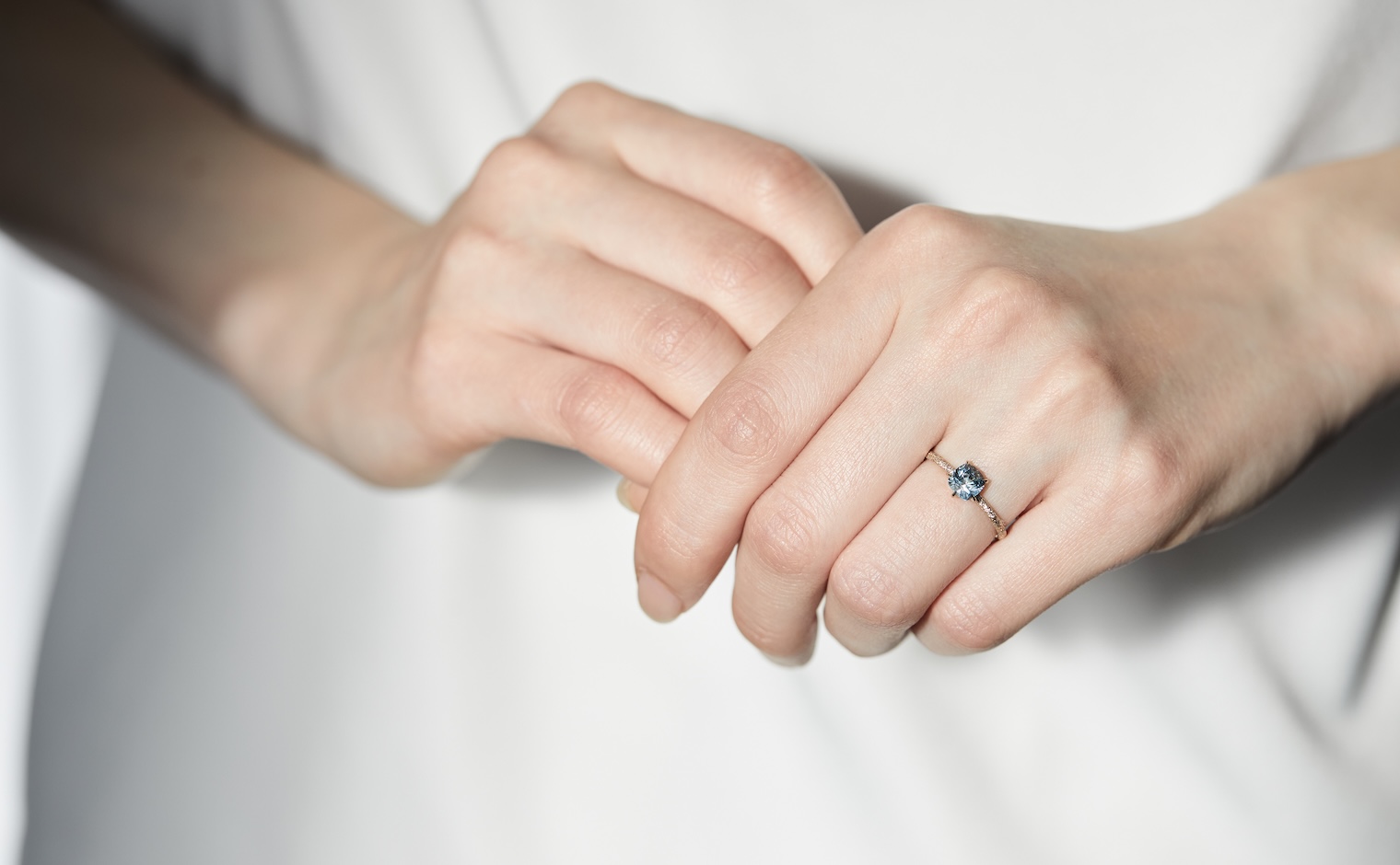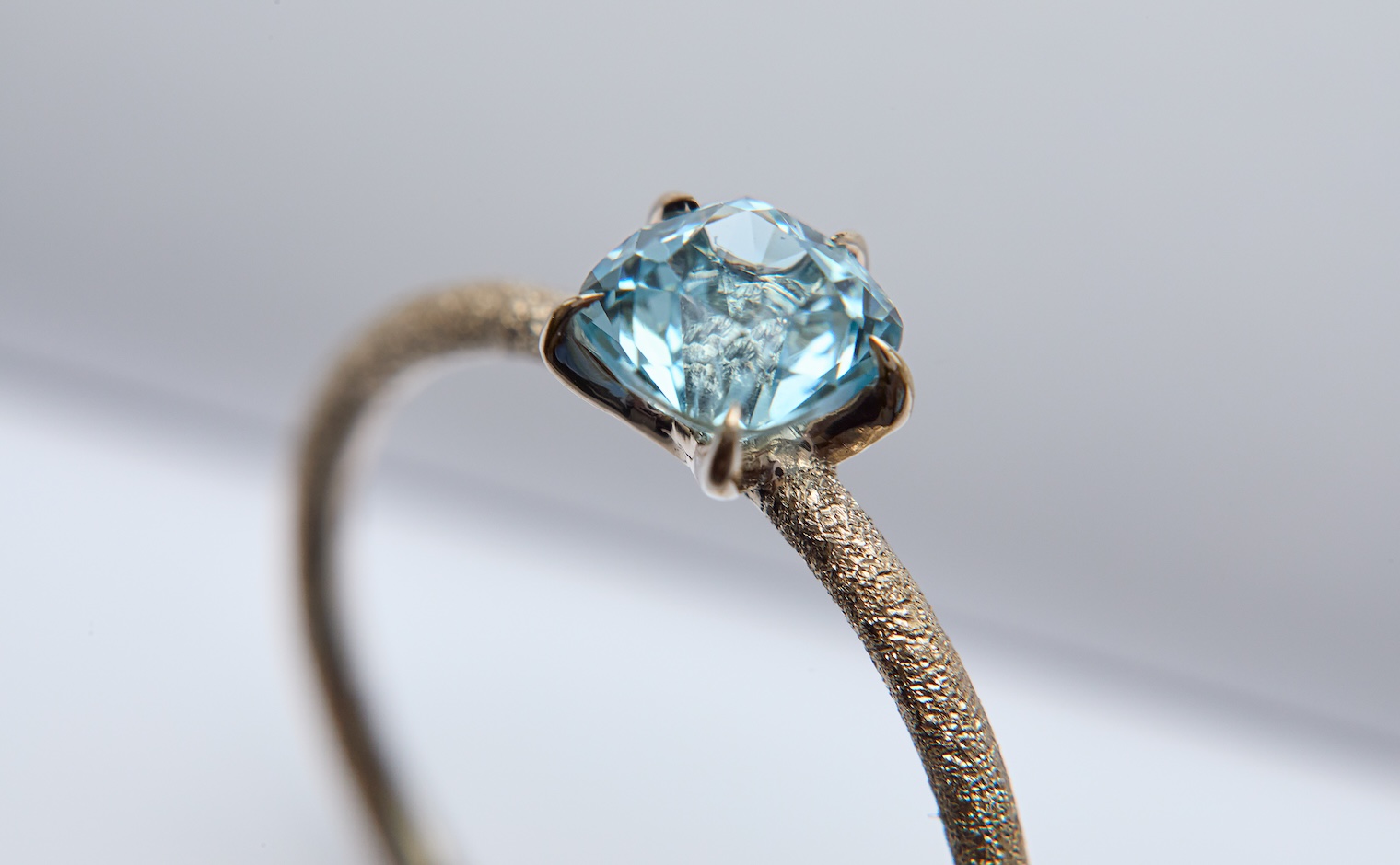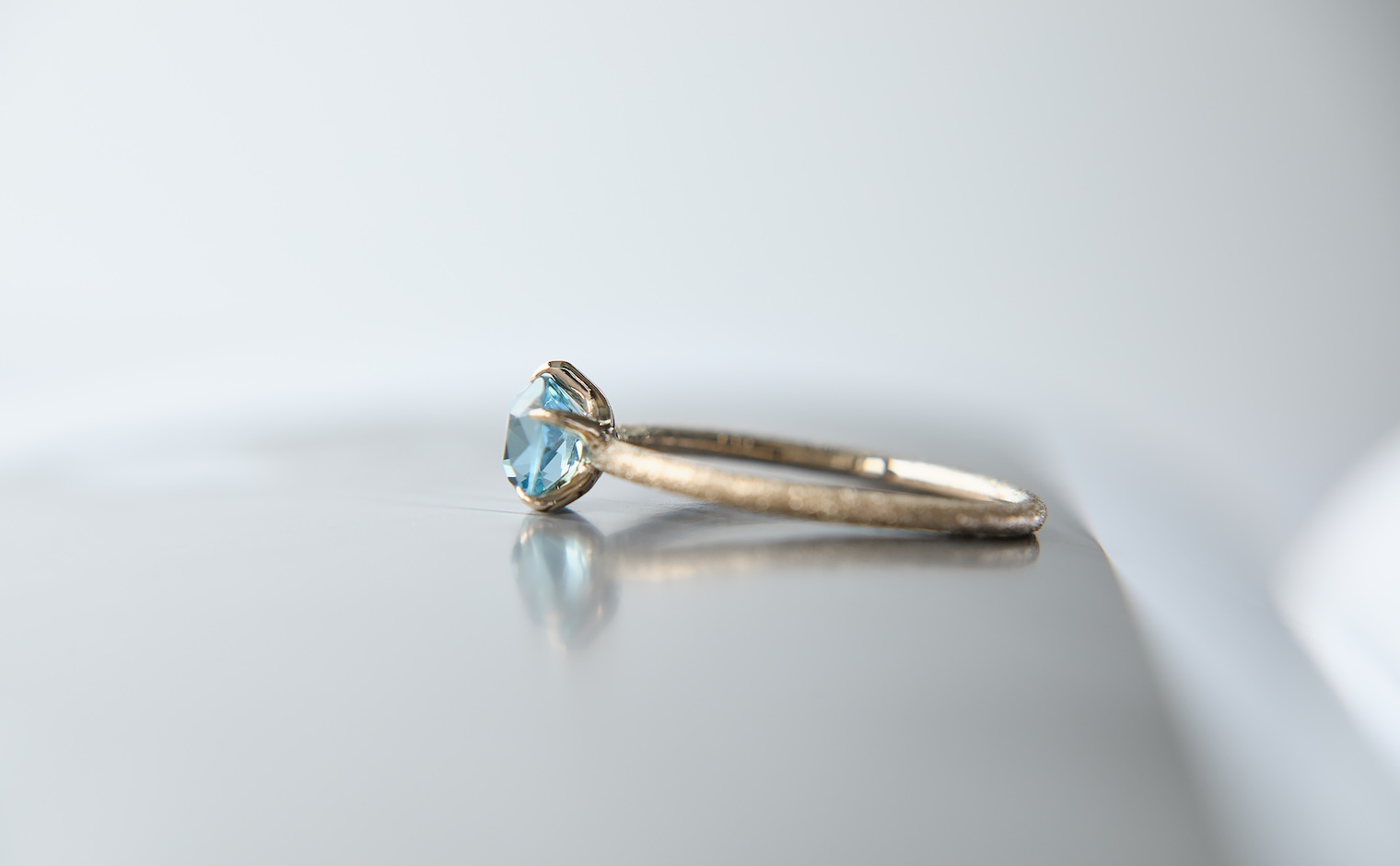 Fantasize of floating away with this delicate masterpiece where the sky-blue horizon meets the twinkling night stars. With its gleaming soft blue Aquamarine set expertly on a handcrafted slender stardust-polished beige gold band, the magical Stardust Ring-Aquamarine will whisk you away where dreams run forevermore.
