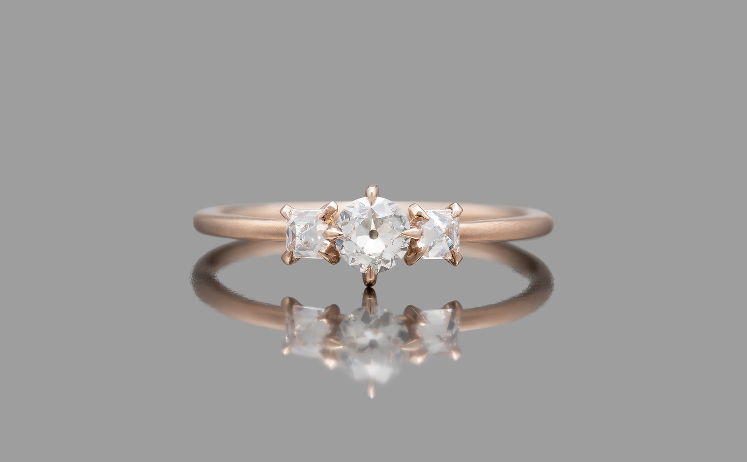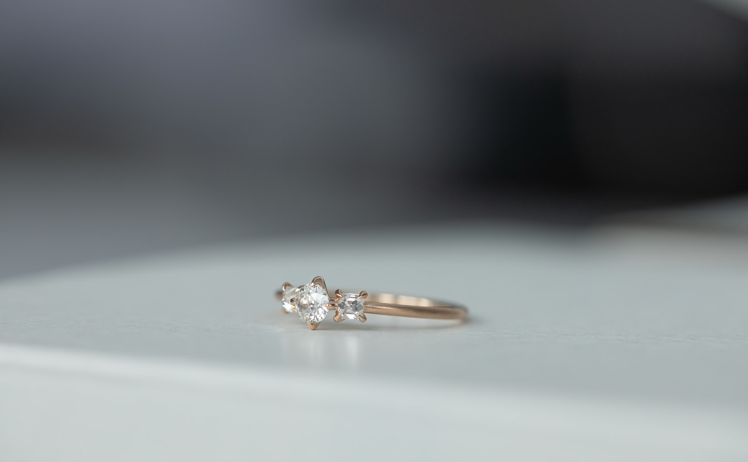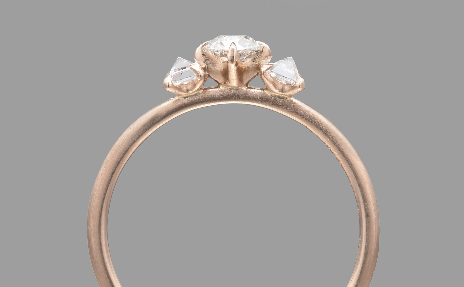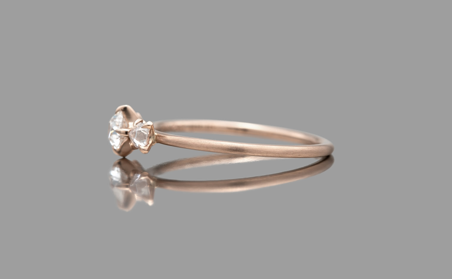 All three wishes came true. A true, one-of-a-kind masterpiece. With its large lustrous white diamond in the middle bordered on both sides by gleaming smaller diamonds, all held together by thin prongs on a lovely handmade slim rose gold band, the Triplets Iceberg Ring captures the essence of beauty untouched.