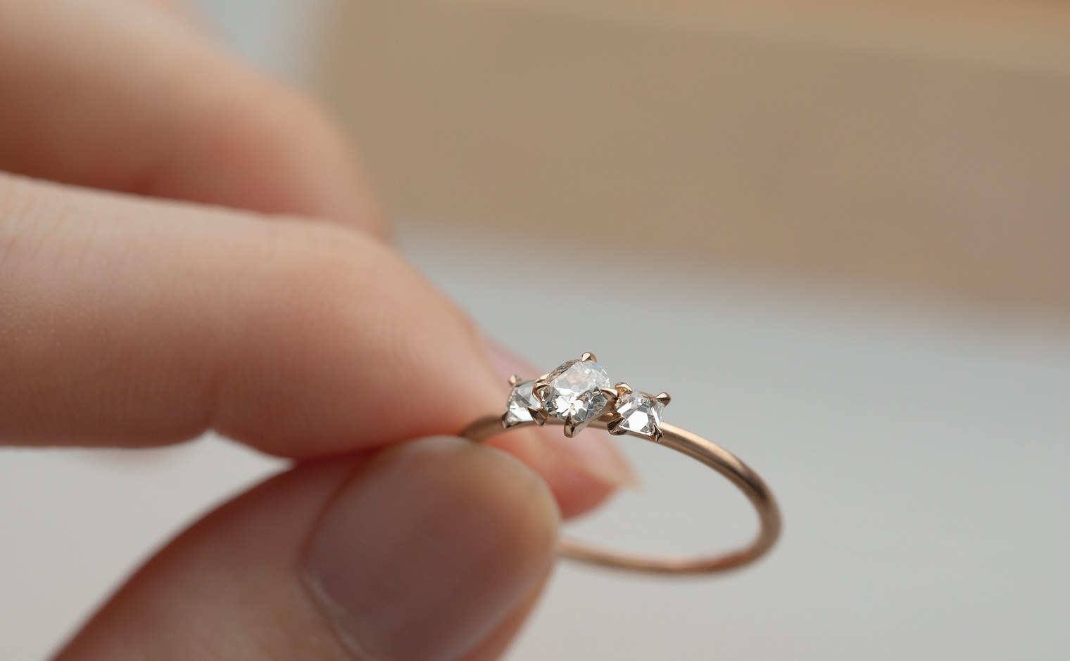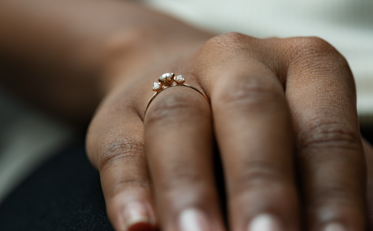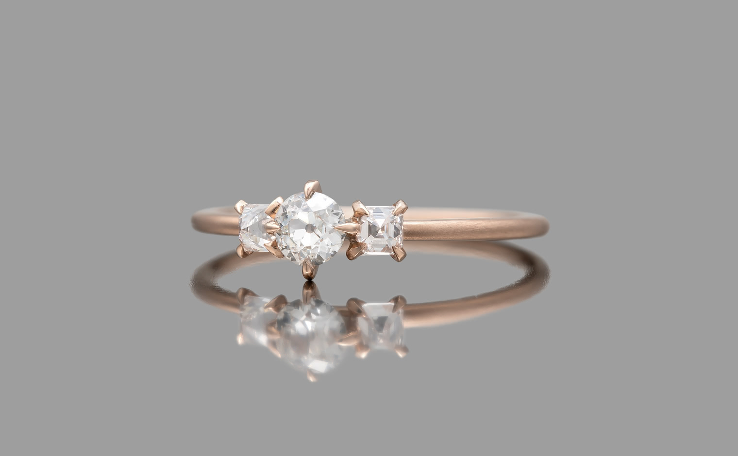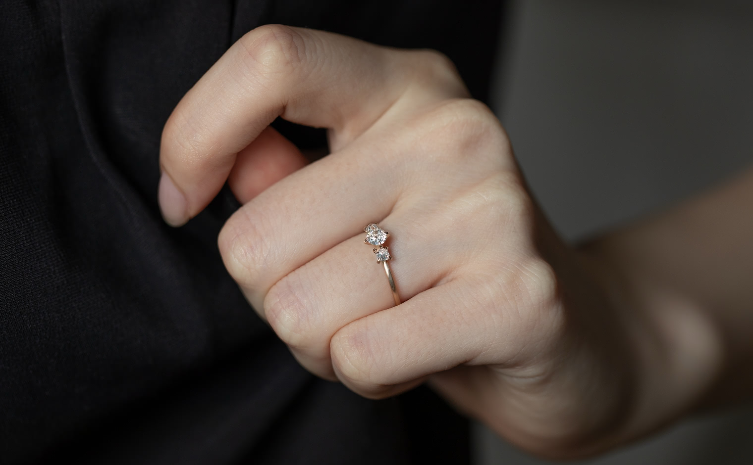 All three wishes came true. A true, one-of-a-kind masterpiece. With its large lustrous white diamond in the middle bordered on both sides by gleaming smaller diamonds, all held together by thin prongs on a lovely handmade slim rose gold band, the Triplets Iceberg Ring captures the essence of beauty untouched.