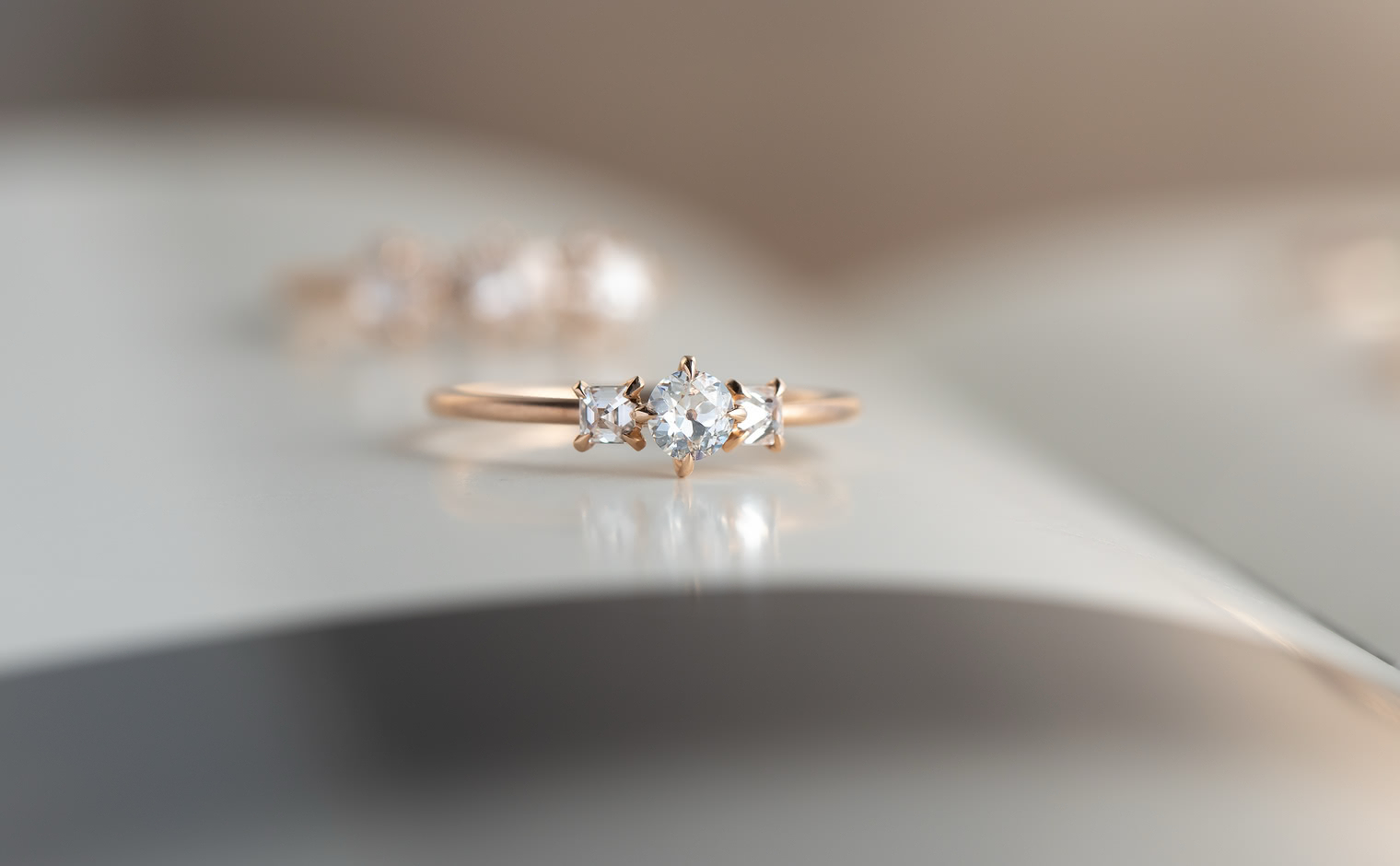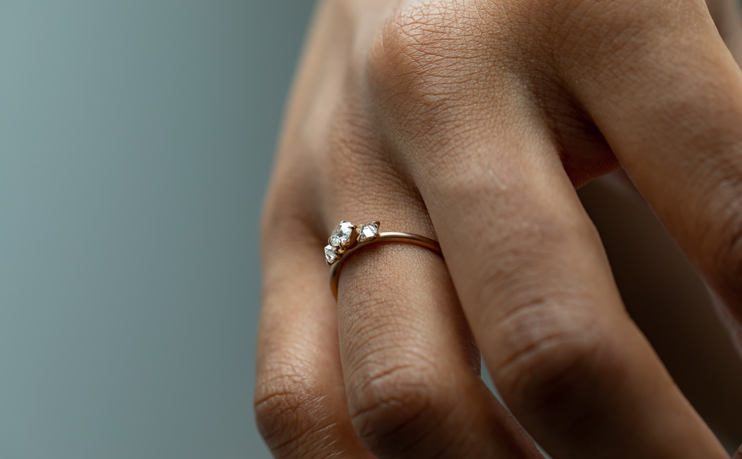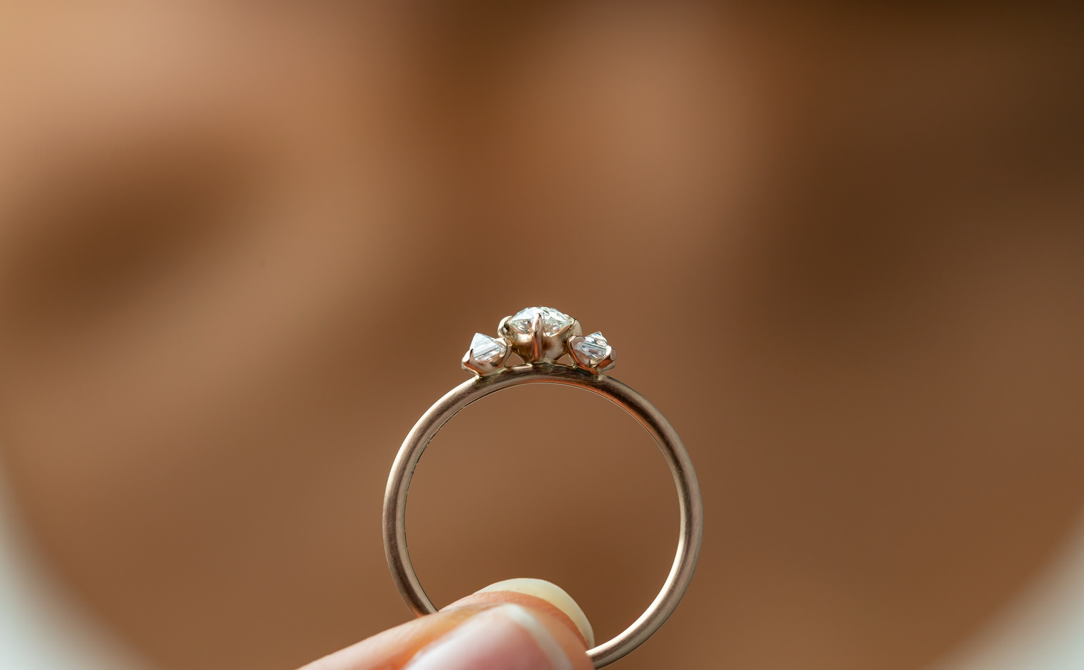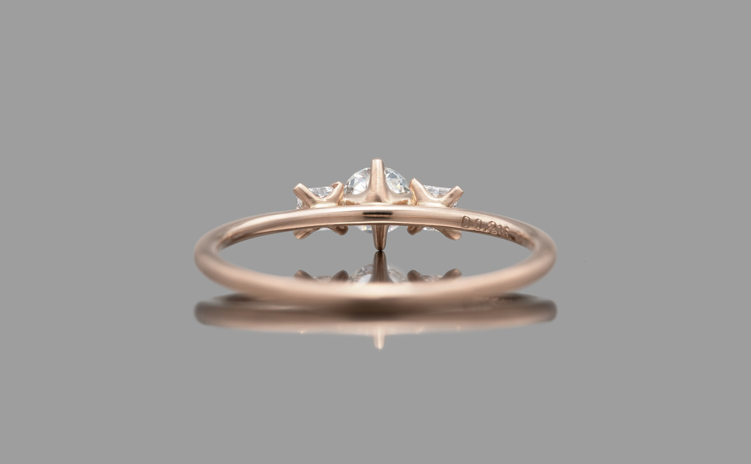 All three wishes came true. A true, one-of-a-kind masterpiece. With its large lustrous white diamond in the middle bordered on both sides by gleaming smaller diamonds, all held together by thin prongs on a lovely handmade slim rose gold band, the Triplets Iceberg Ring captures the essence of beauty untouched.