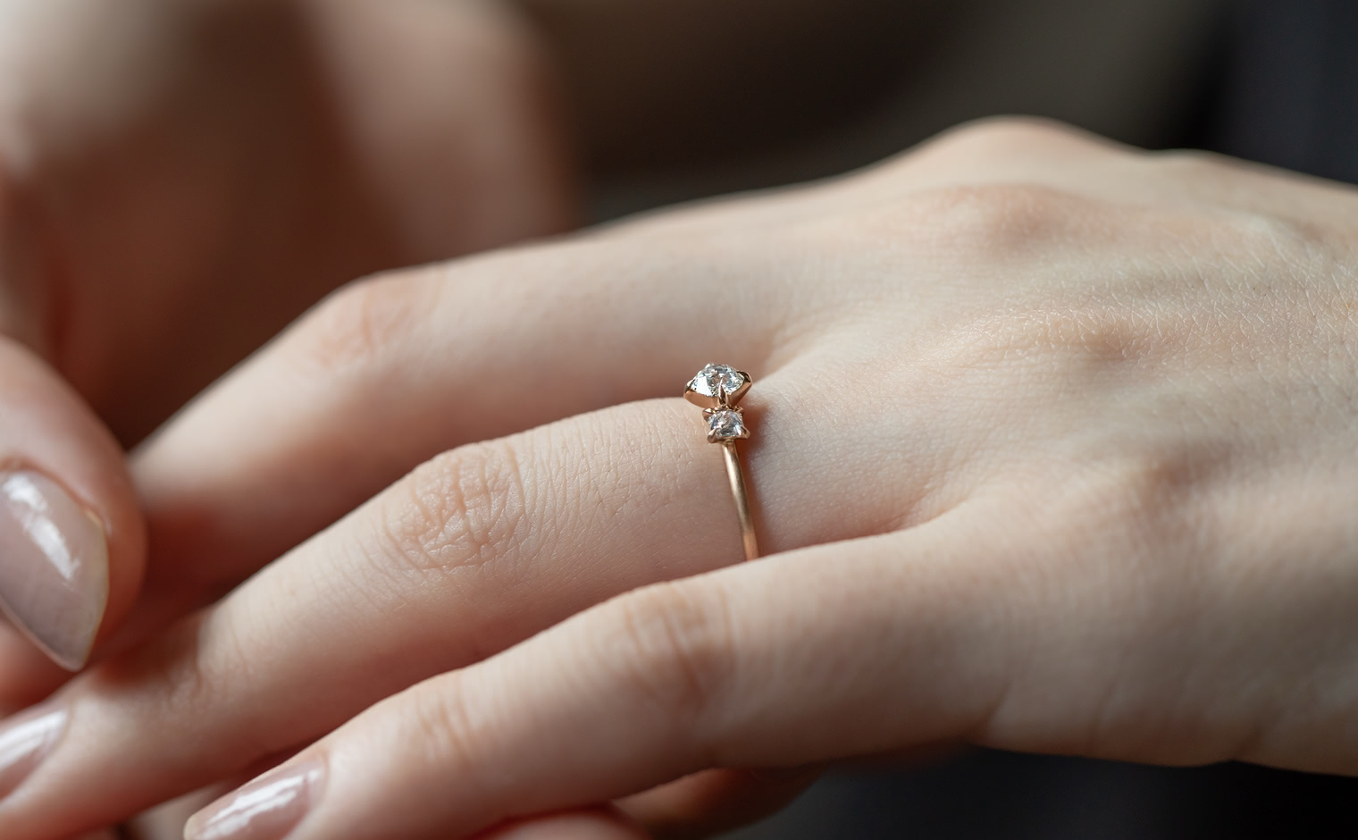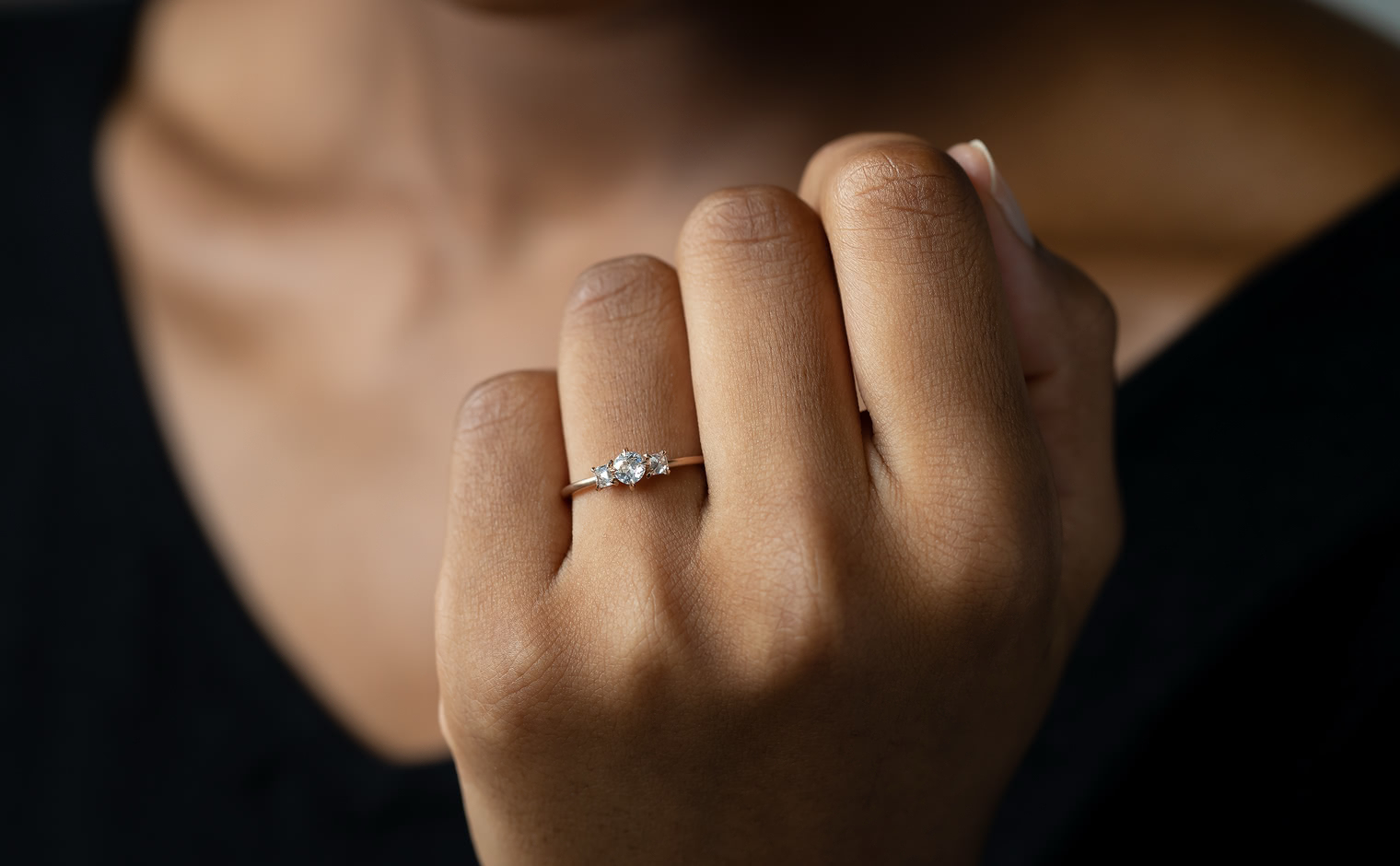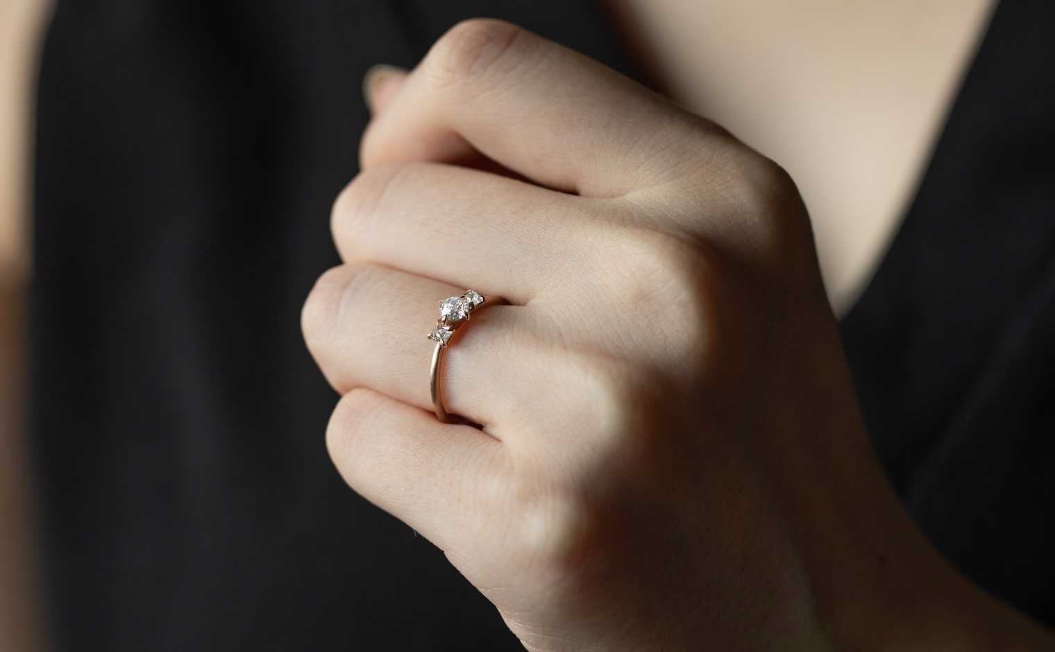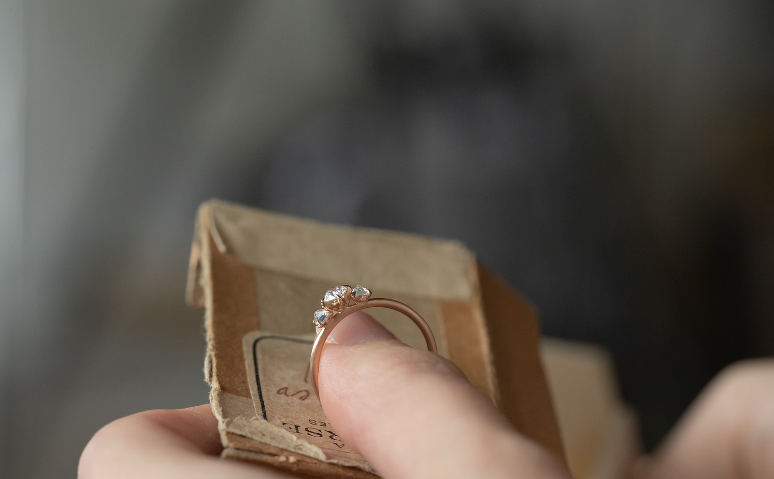 All three wishes came true. A true, one-of-a-kind masterpiece. With its large lustrous white diamond in the middle bordered on both sides by gleaming smaller diamonds, all held together by thin prongs on a lovely handmade slim rose gold band, the Triplets Iceberg Ring captures the essence of beauty untouched.