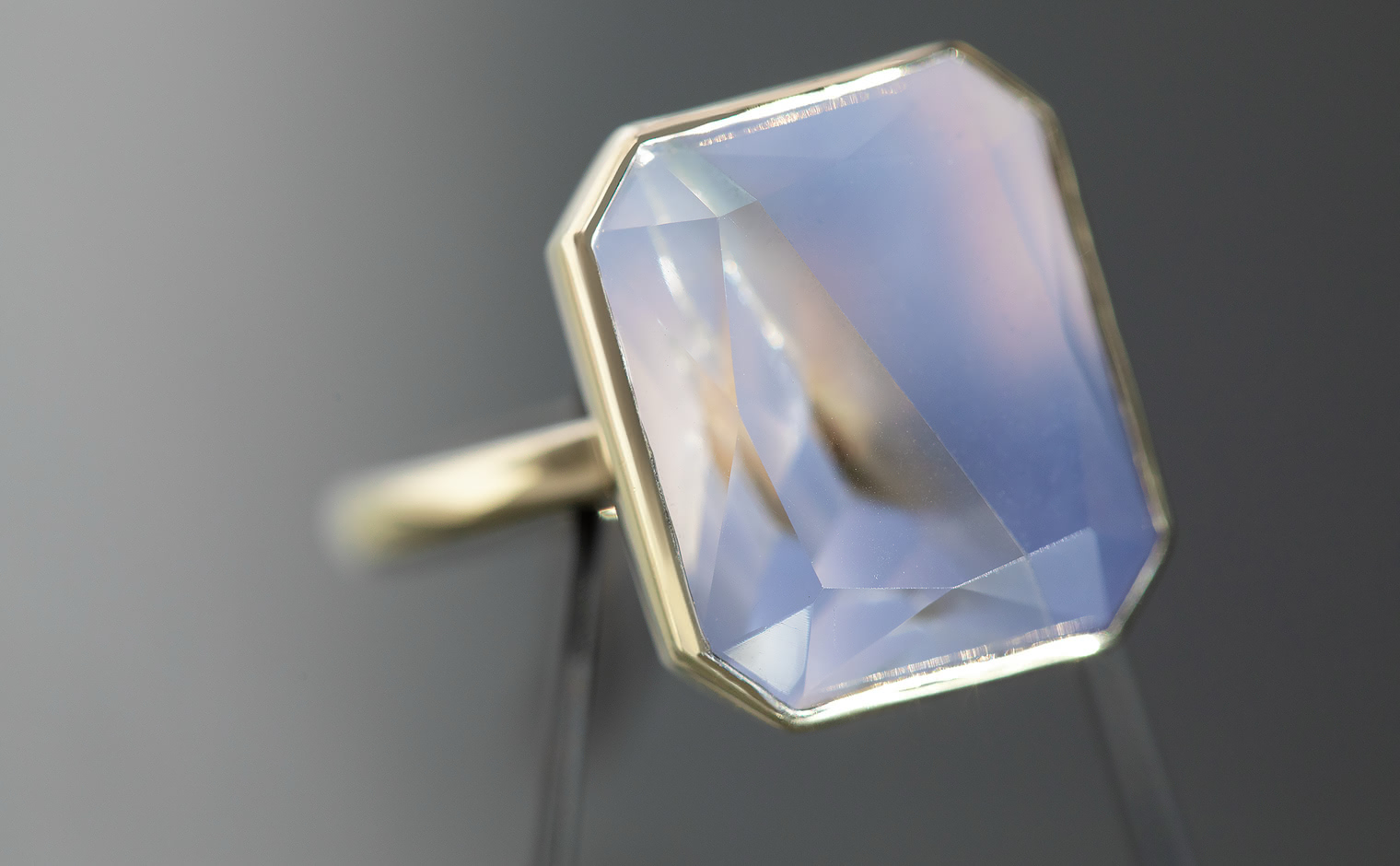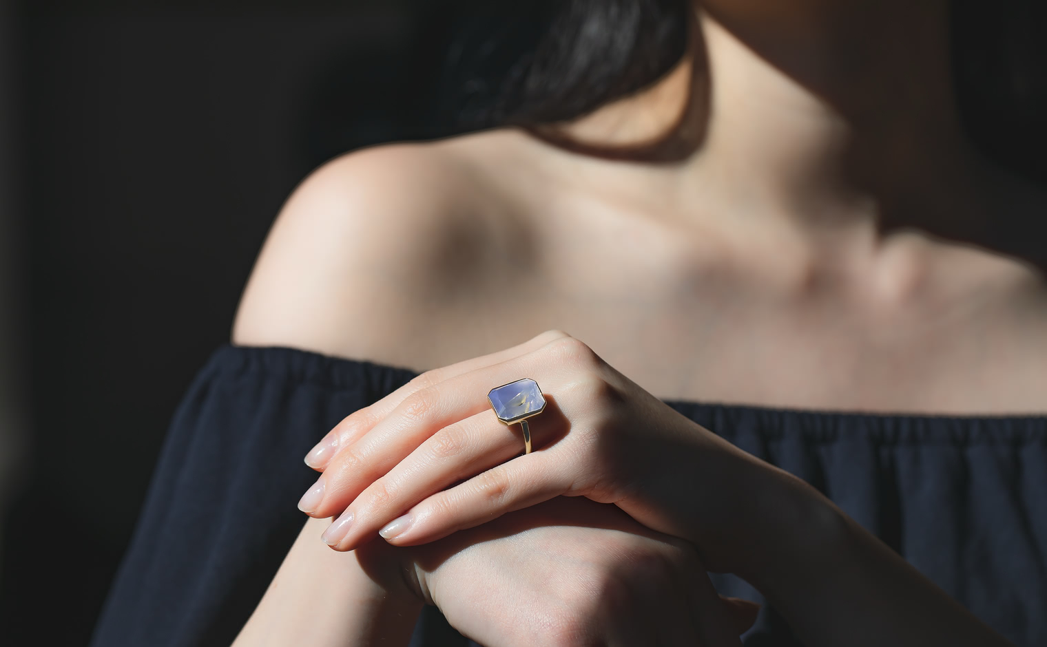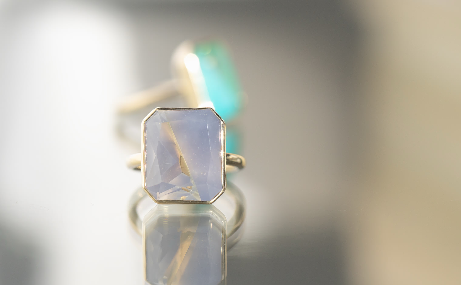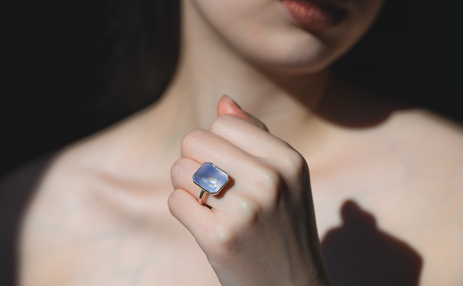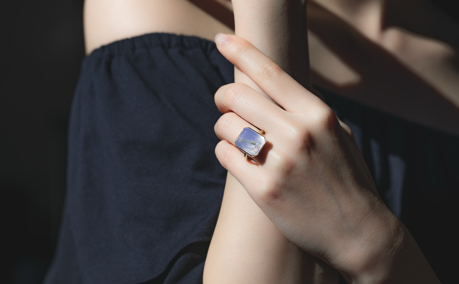 With its periwinkle colored quartz and chalcedony, one clear and one opaque, carefully set on a handcrafted custom metal band, the Twilight Ring creates an enchanting illusion with its two-toned light-capturing that elusive romantic twilight evening perfect for an intimate moment together.