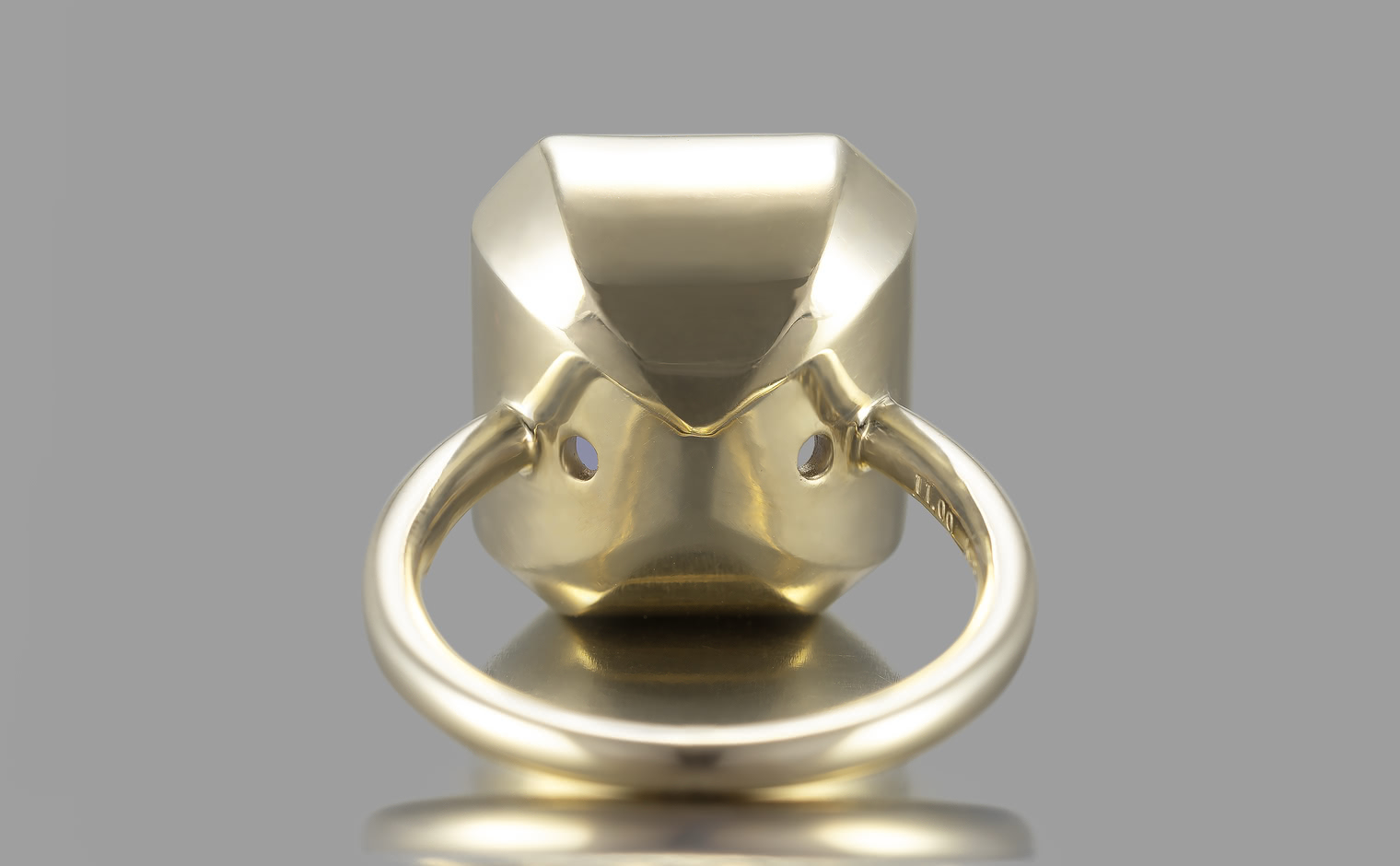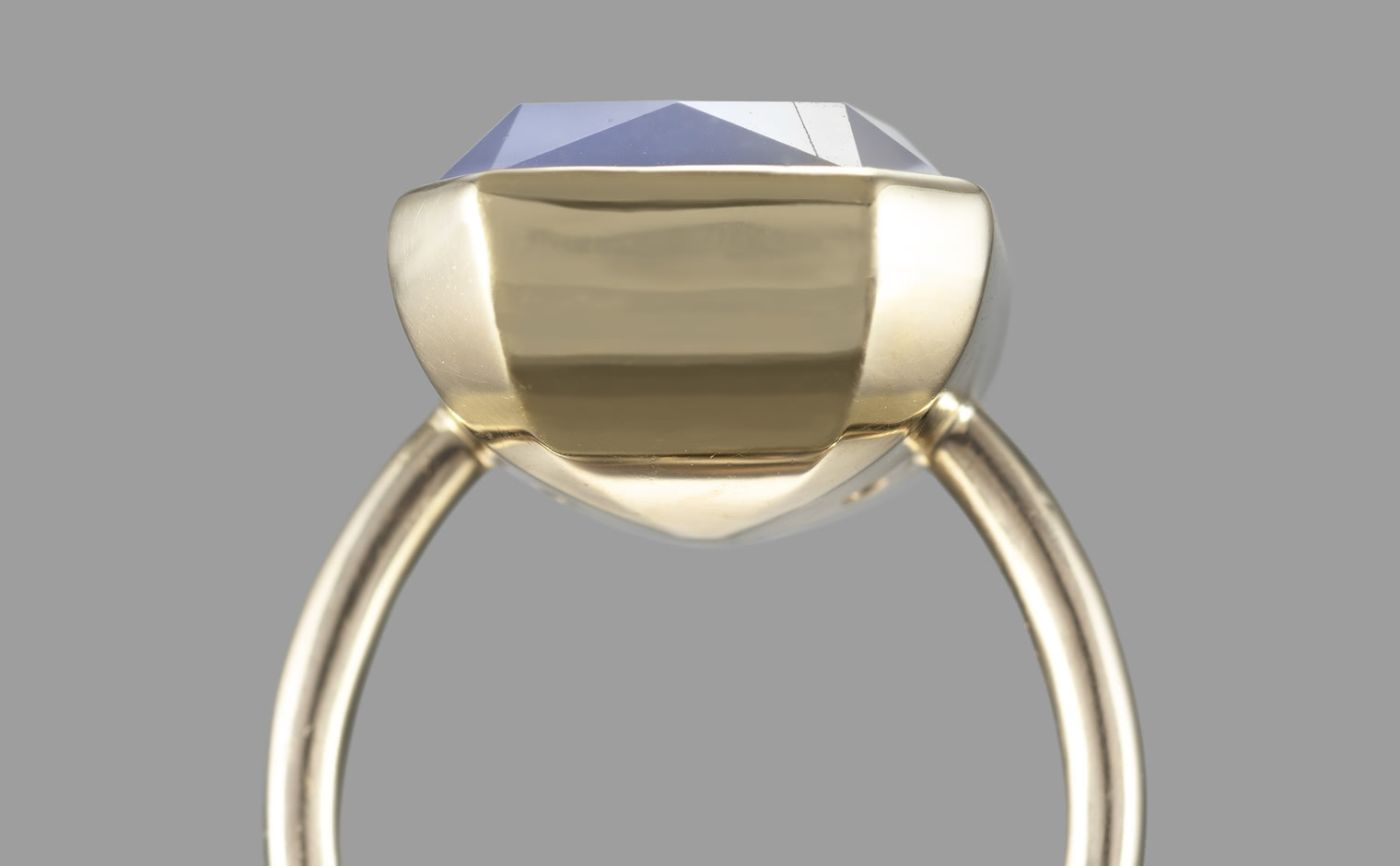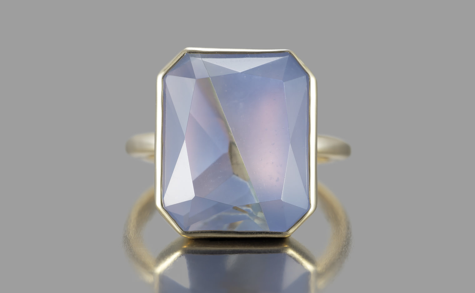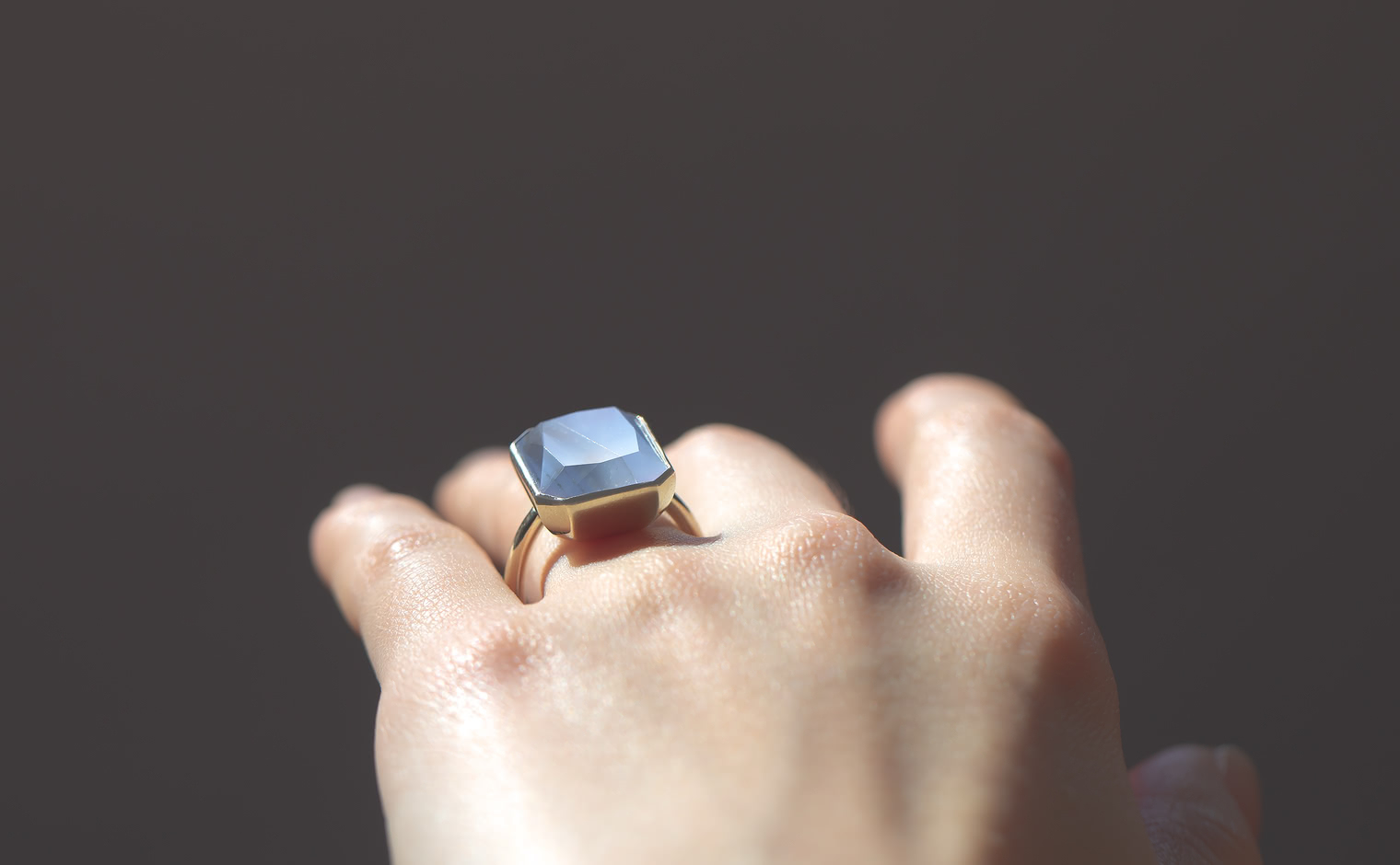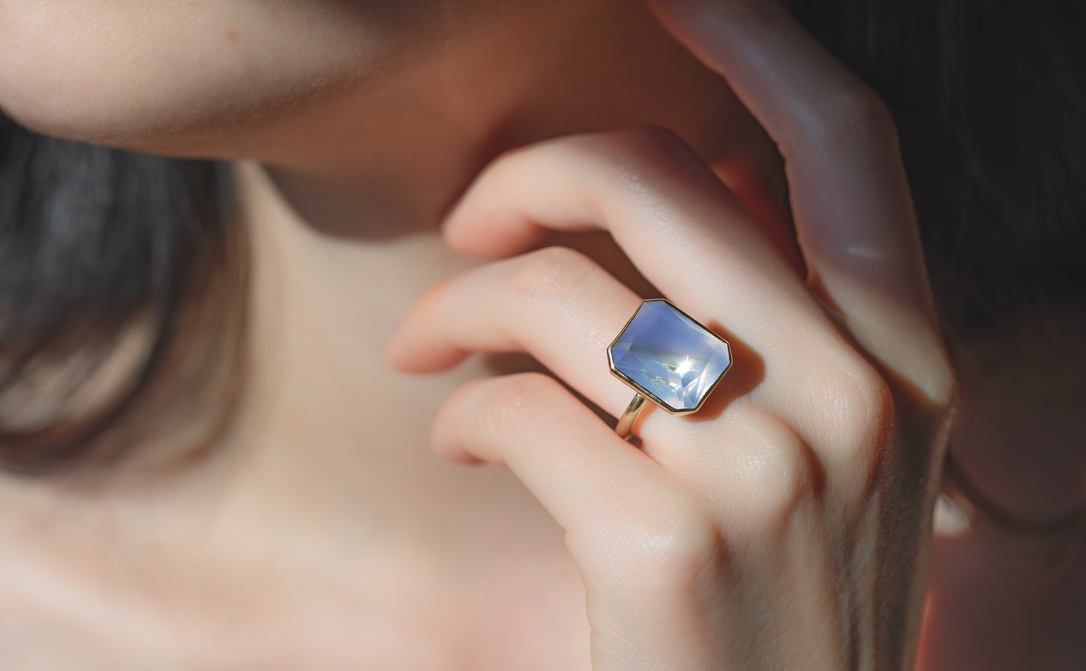 With its periwinkle colored quartz and chalcedony, one clear and one opaque, carefully set on a handcrafted custom metal band, the Twilight Ring creates an enchanting illusion with its two-toned light-capturing that elusive romantic twilight evening perfect for an intimate moment together.