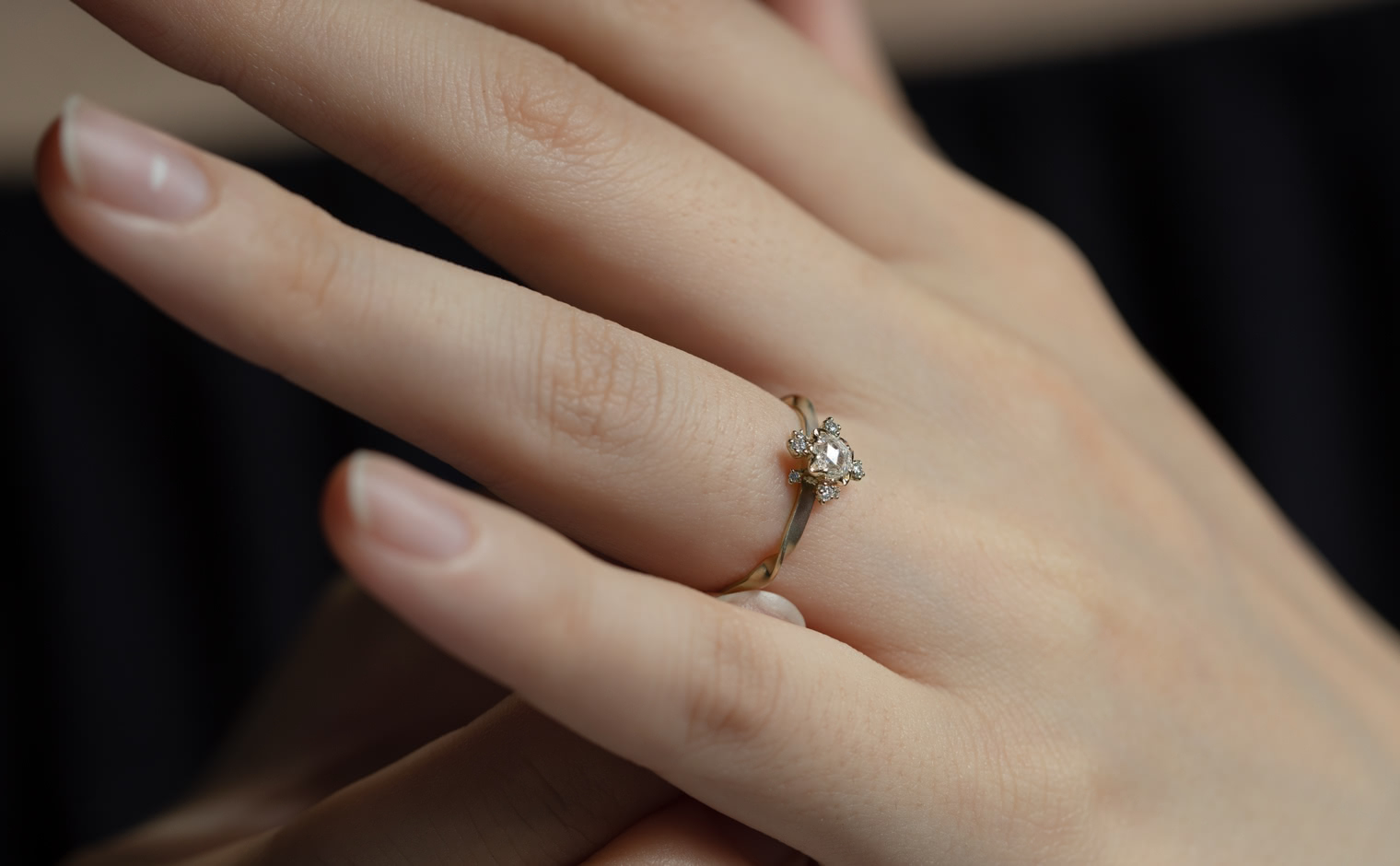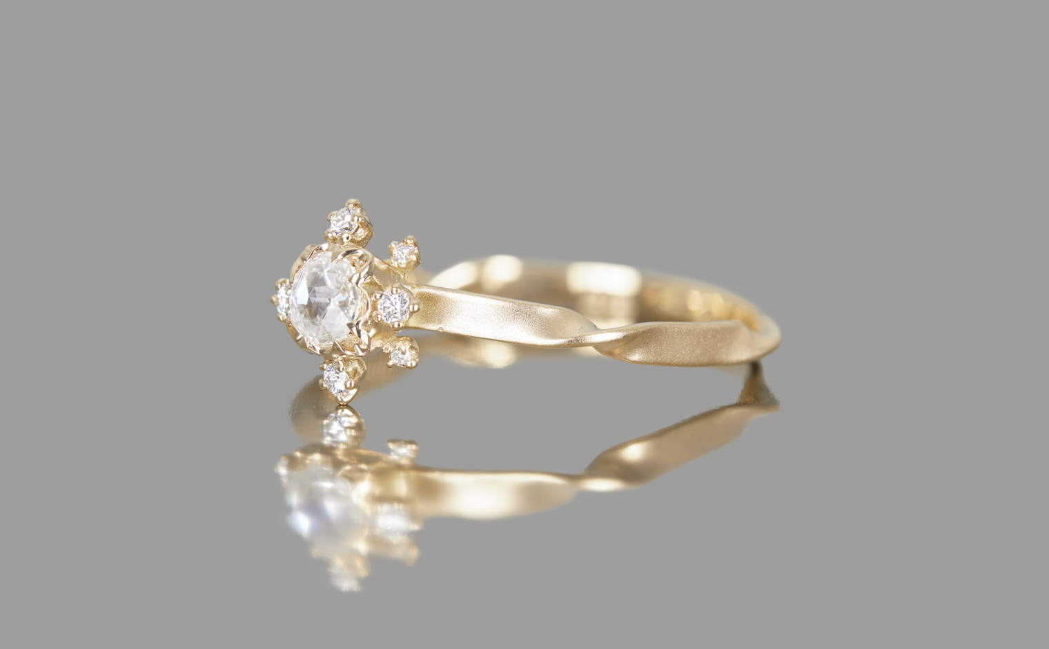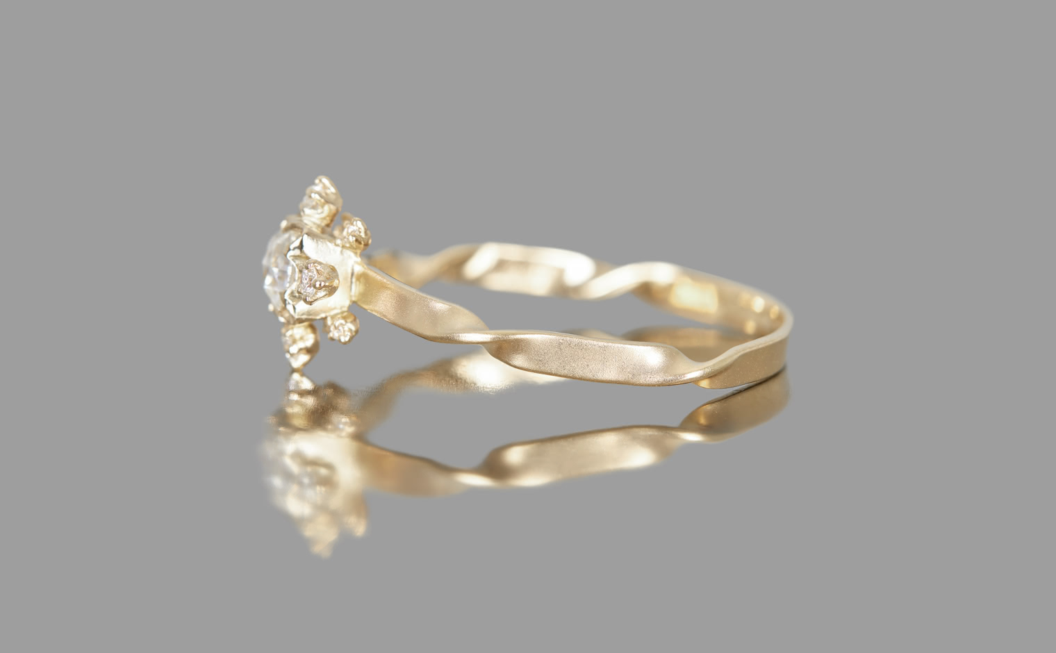 Diamonds in soft radiance, their light dancing in quiet harmony. The Twisting Snowflake Ring–Diamond reflects a delicate beauty, a serene echo of winter’s timeless grace.