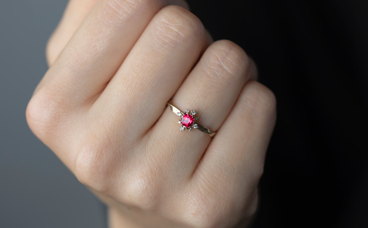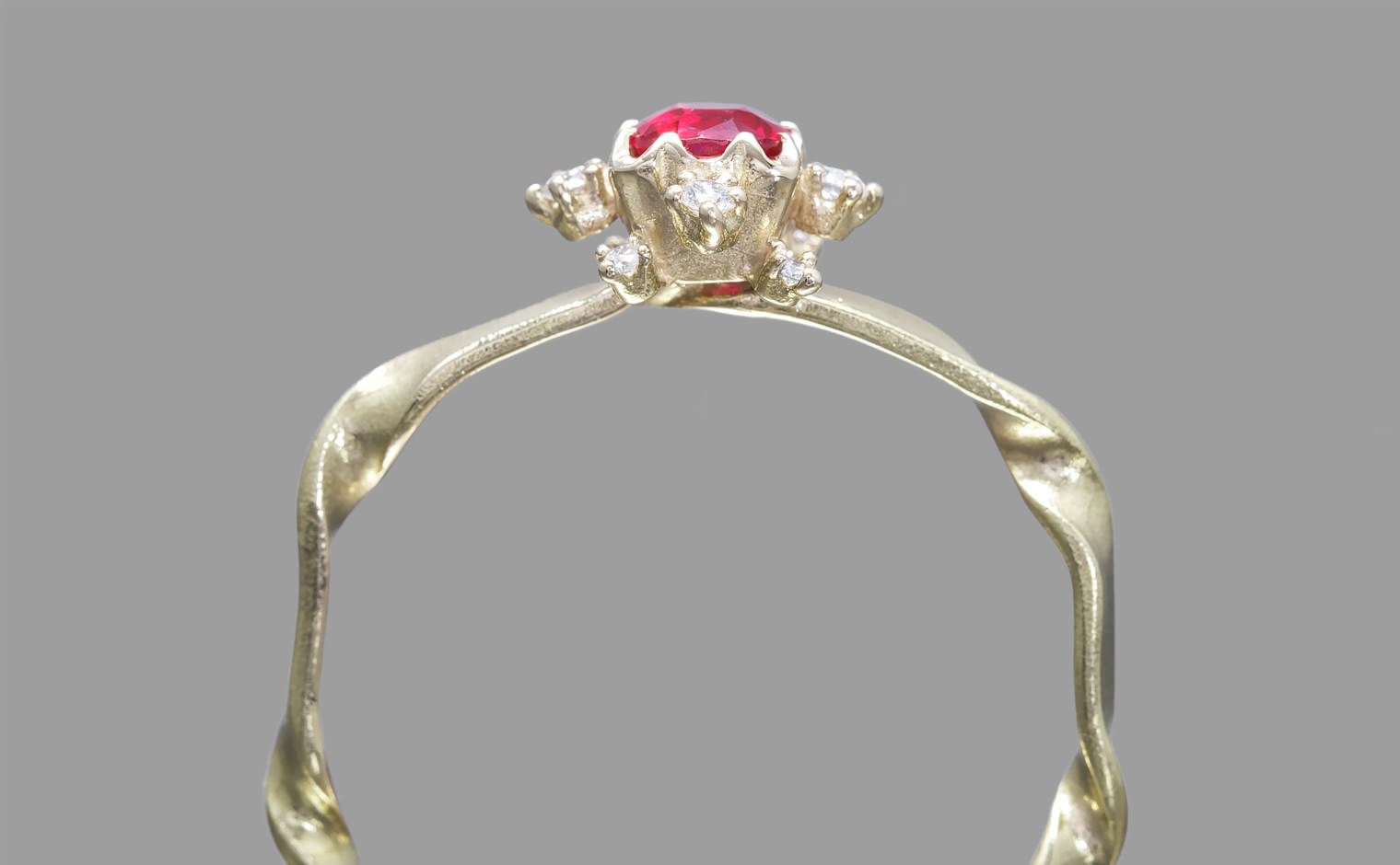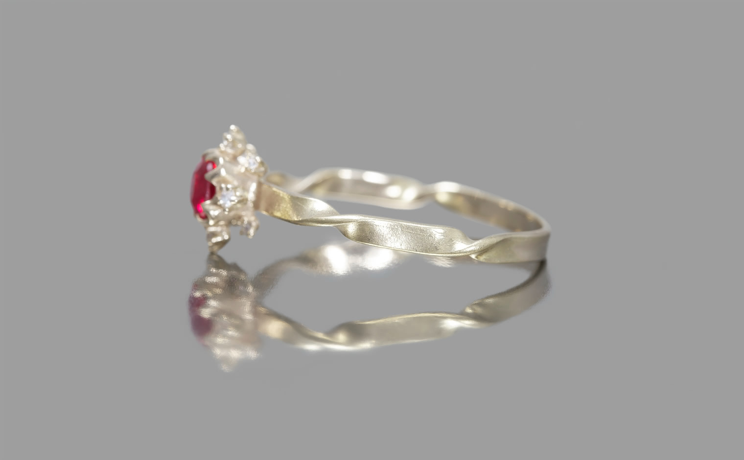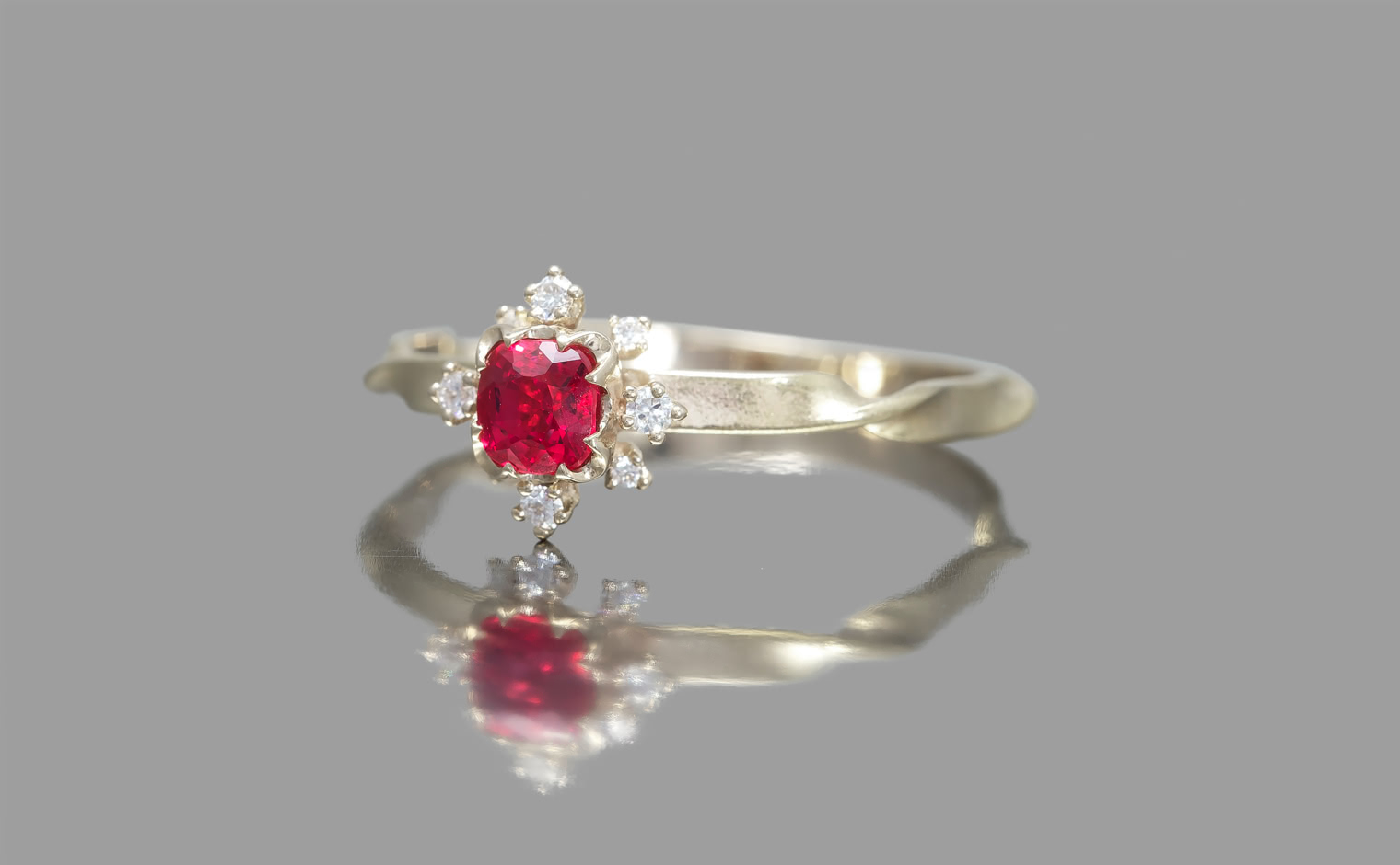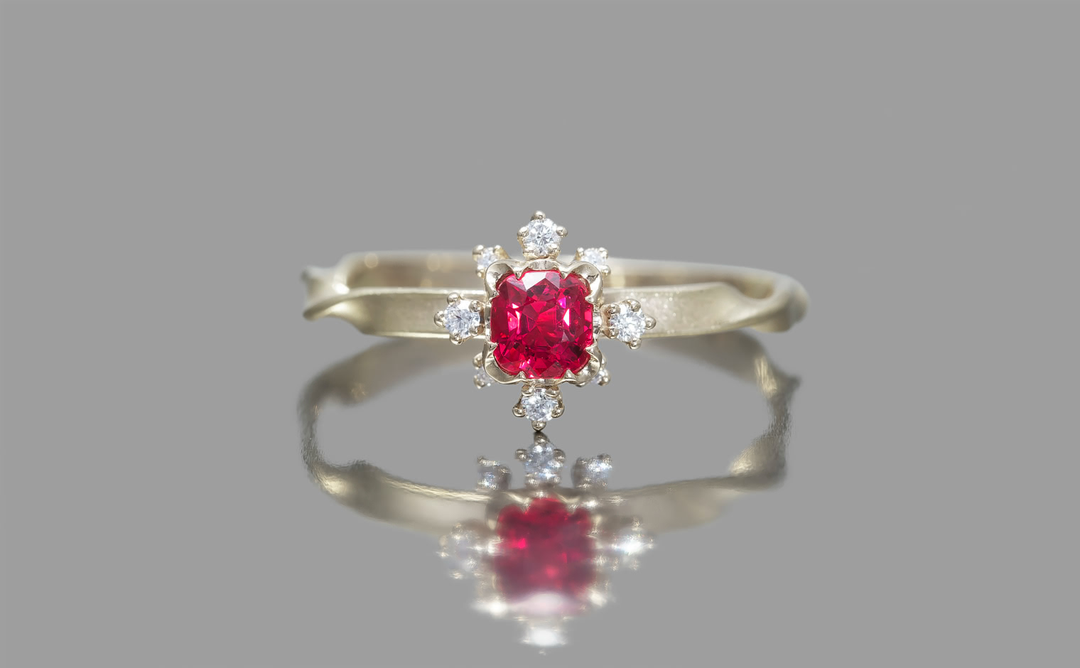 This remarkable red spinel, chosen for its rich depths and eye-catching luster, takes center stage in a covetable ring made just for you. Custom-blended metal of your choice is twisted gently to form a ring with an unforgettable silhouette, and the halo of bright diamonds dance and spread out around the center gem to bring sparkle to your hand, day or night.