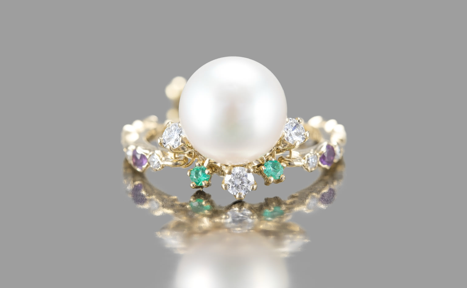 One luminously luxurious pearl surrounded by astonishing white diamonds, striking green emeralds, and delicate violet amethysts, the Aurora Pearl Glide Ring is romantically captivating as the dancing colors of the Northern Lights against the moonlit, starry midnight sky.