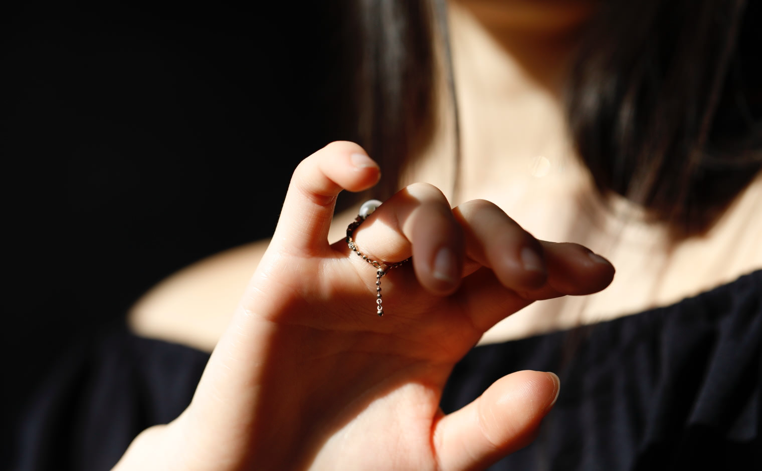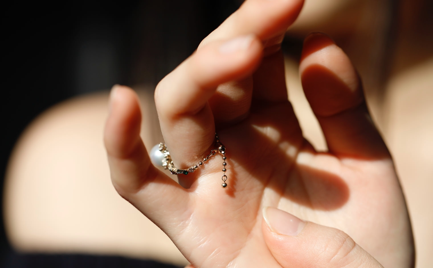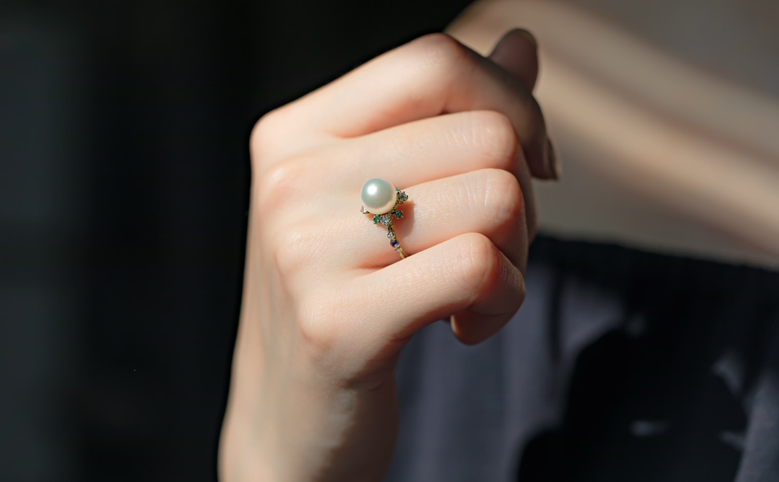 With its precious center Akoya pearl and glimmering gemstones set on a custom-blended milgrain-edged slim band with a uniquely adjustable gliding chain, the Aurora Slider Ring evokes an air of hushed, mystical yet vibrant elegance.