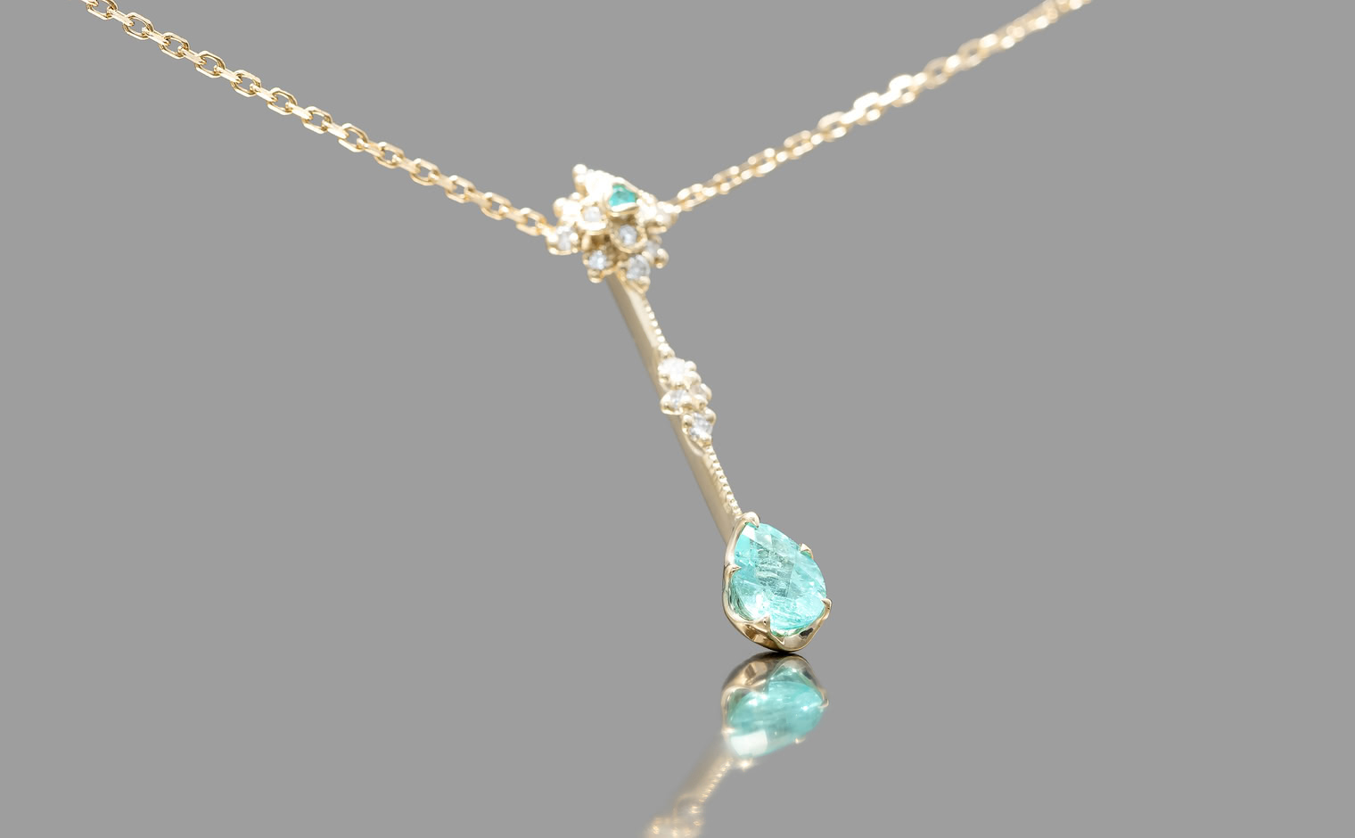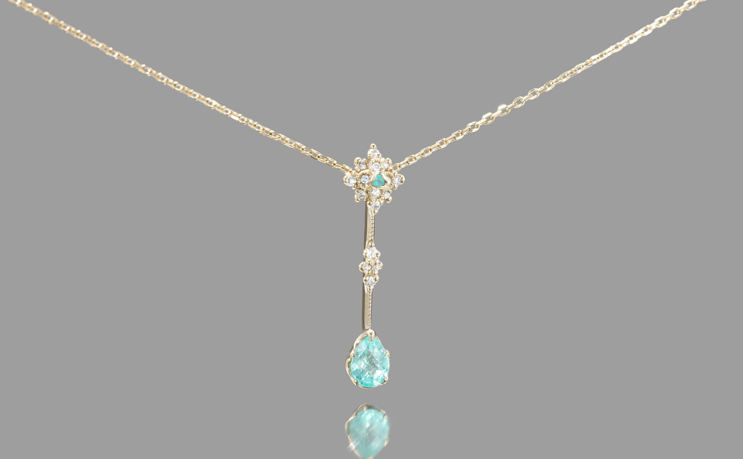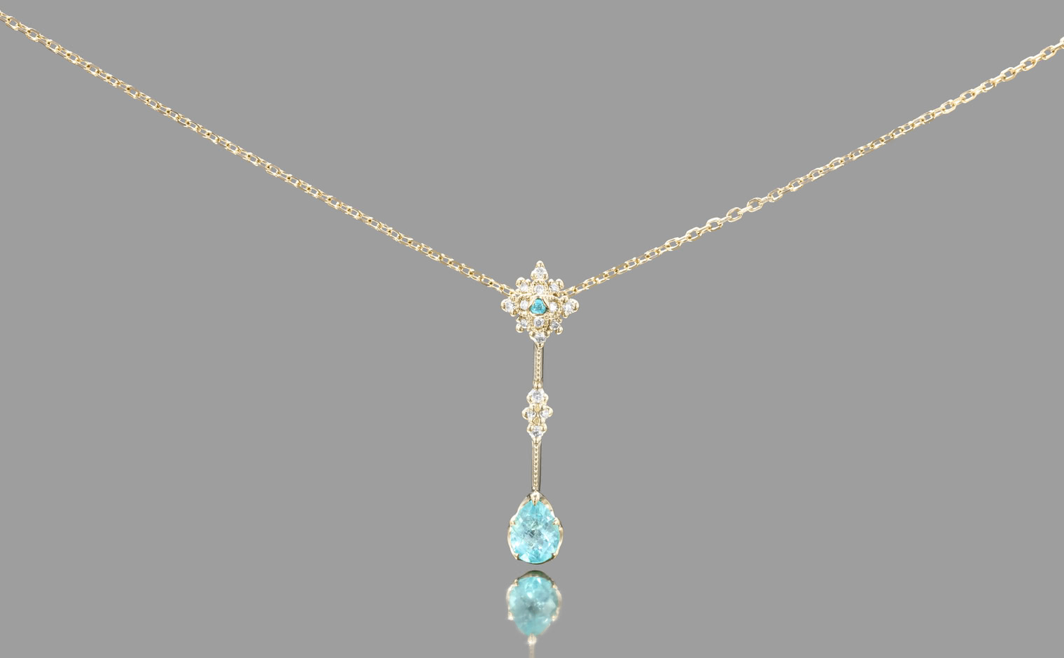 With its center bloom of preciously selected snow-white diamonds capped with one delicate Paraiba gem and a milgrain-finished diamond-accented link bearing the magnificent teardrop-cut turquoise gemstone hanging from a silken chain, the Orchid Drop Necklace-Paraiba is a vision of serene utopia coiled around the softness of your skin.