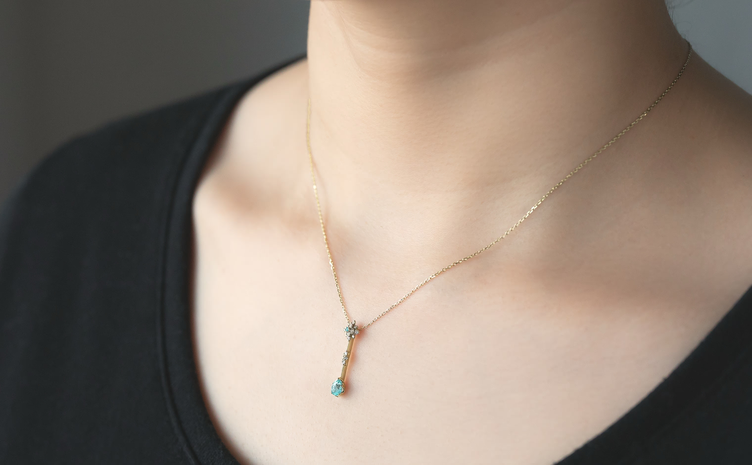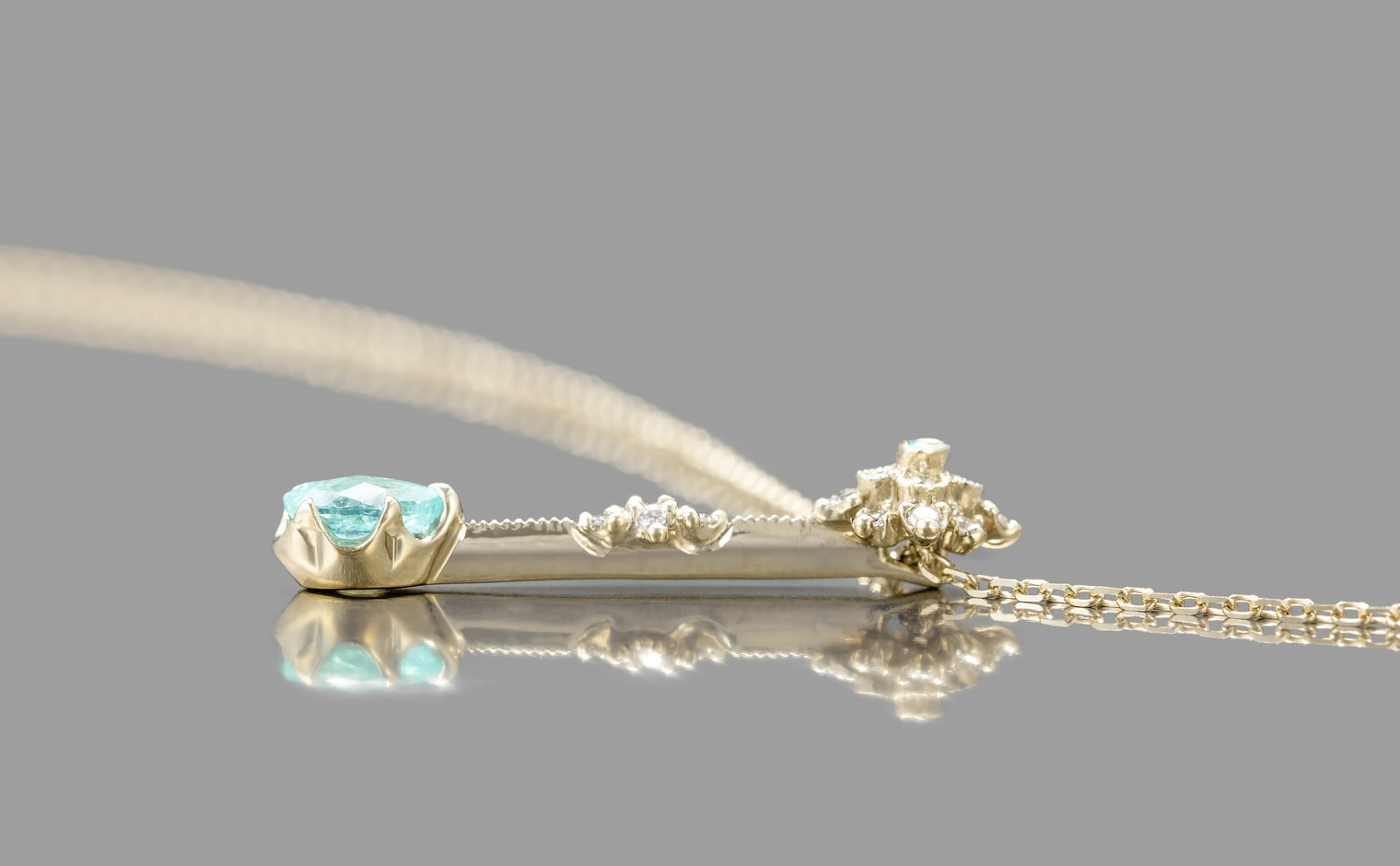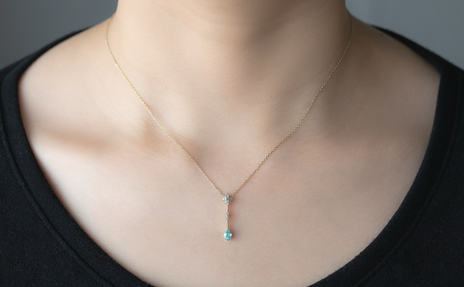 With its center bloom of preciously selected snow-white diamonds capped with one delicate Paraiba gem and a milgrain-finished diamond-accented link bearing the magnificent teardrop-cut turquoise gemstone hanging from a silken chain, the Orchid Drop Necklace-Paraiba is a vision of serene utopia coiled around the softness of your skin.