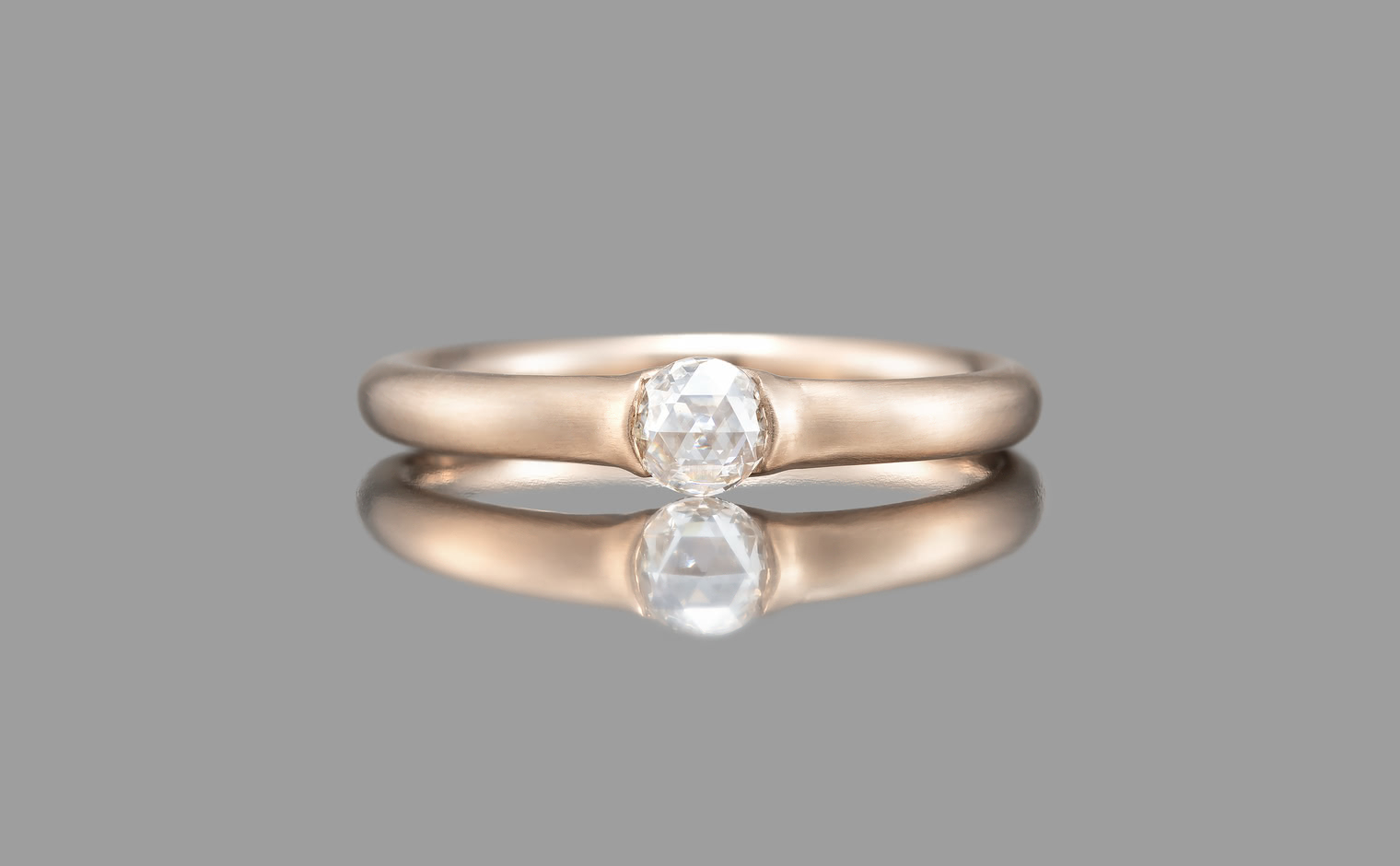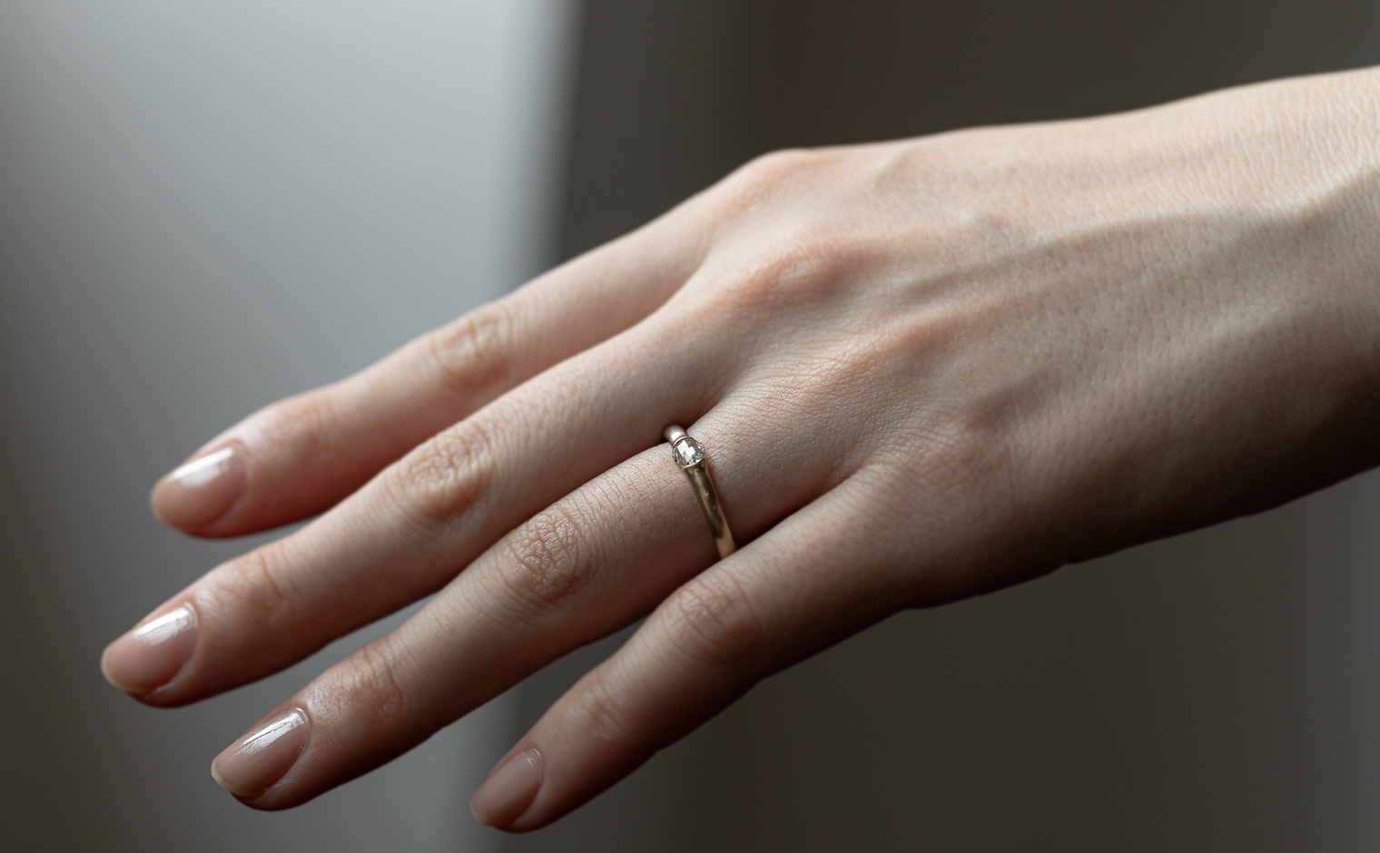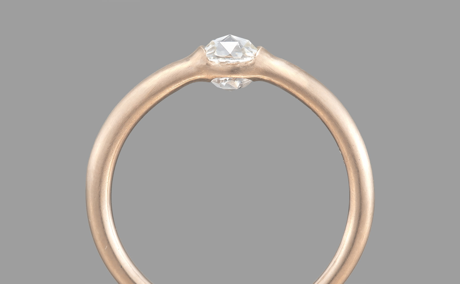 Two rose-cut diamonds set back to back at the center of the band, creating a dimensional diamond bead (0.18 ct. and 0.05 ct.). The foundational Adamas form. From the Brut collection, where raw geometry and architectural form replace ornament.