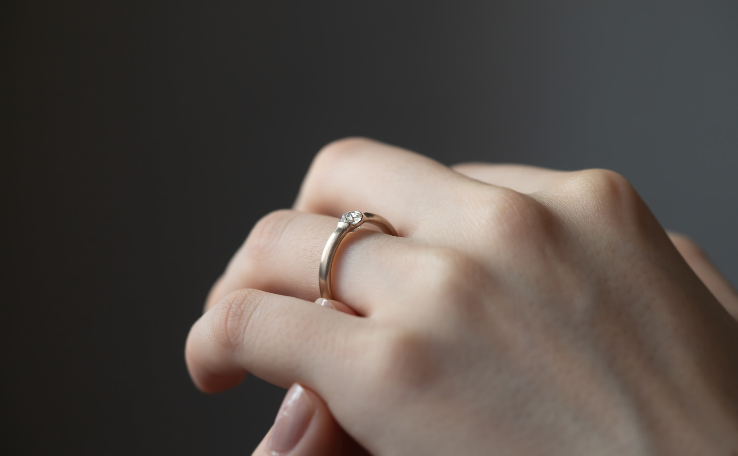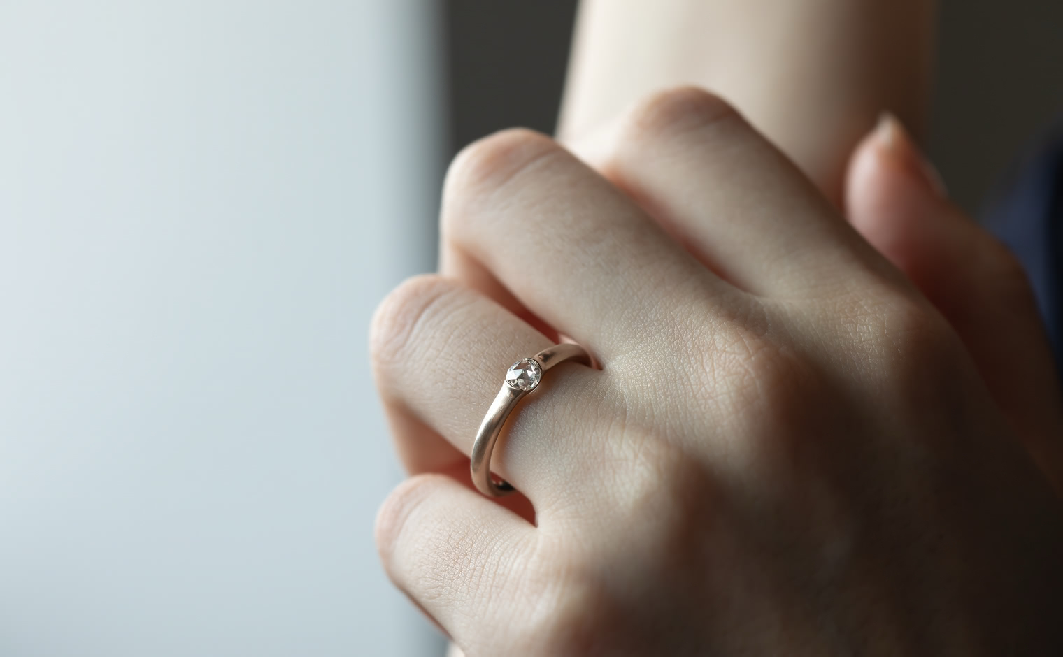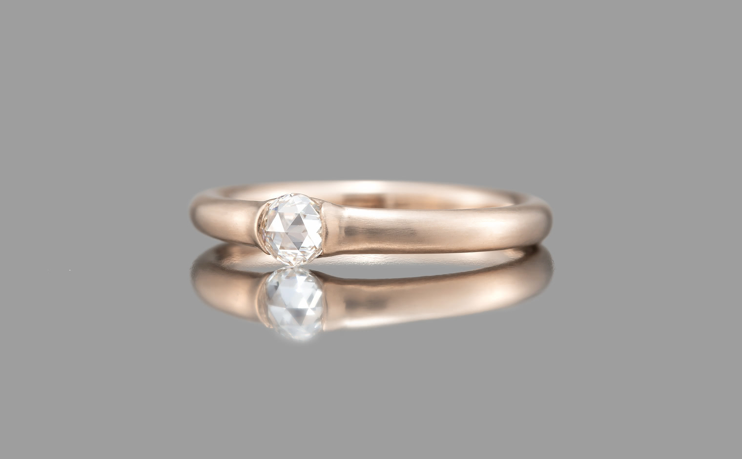 Two rose-cut diamonds set back to back at the center of the band, creating a dimensional diamond bead (0.18 ct. and 0.05 ct.). The foundational Adamas form. From the Brut collection, where raw geometry and architectural form replace ornament.