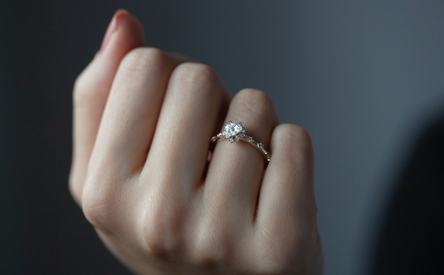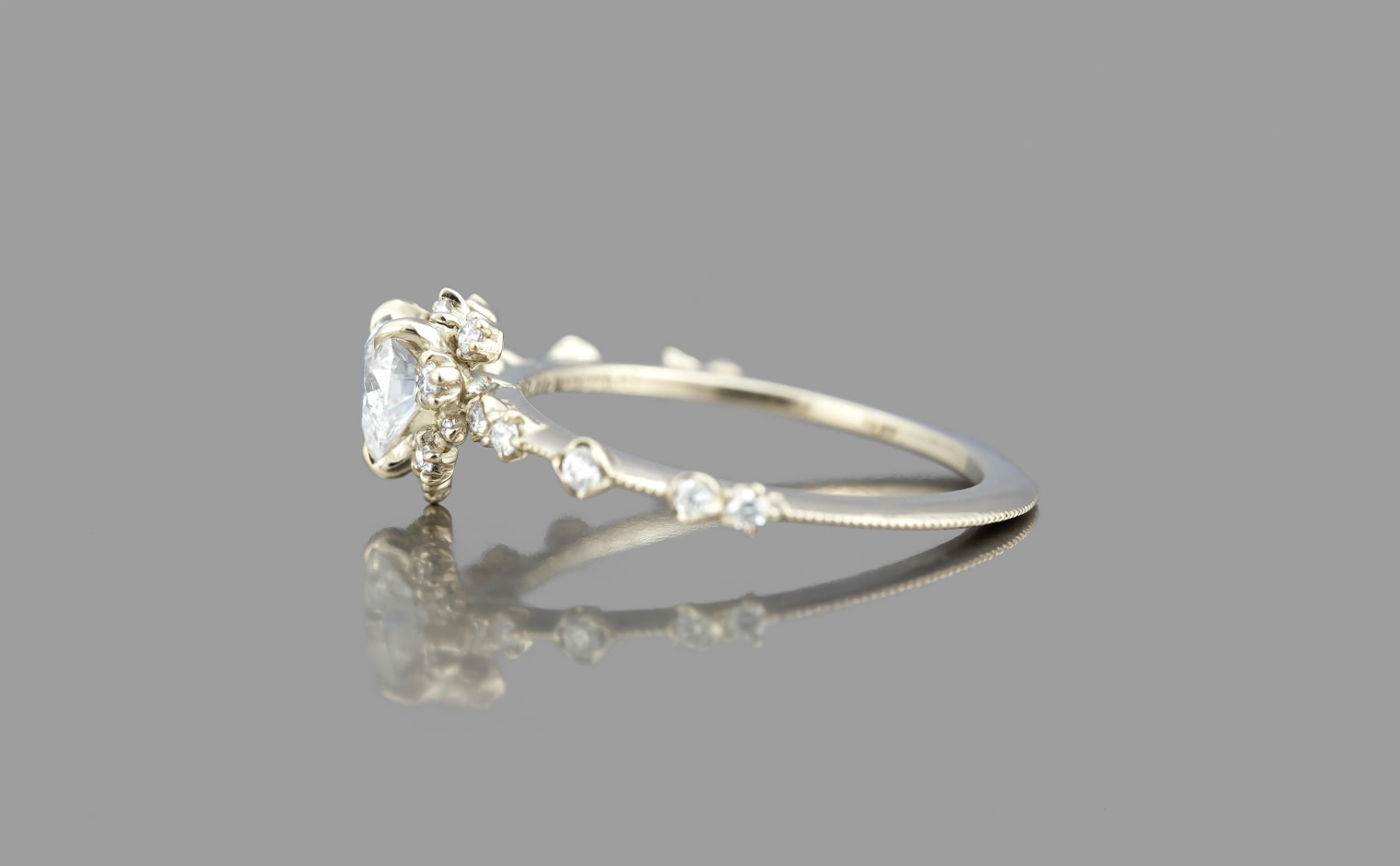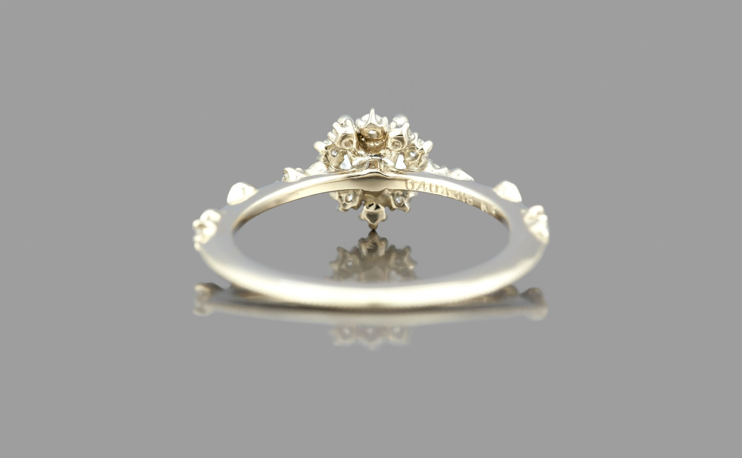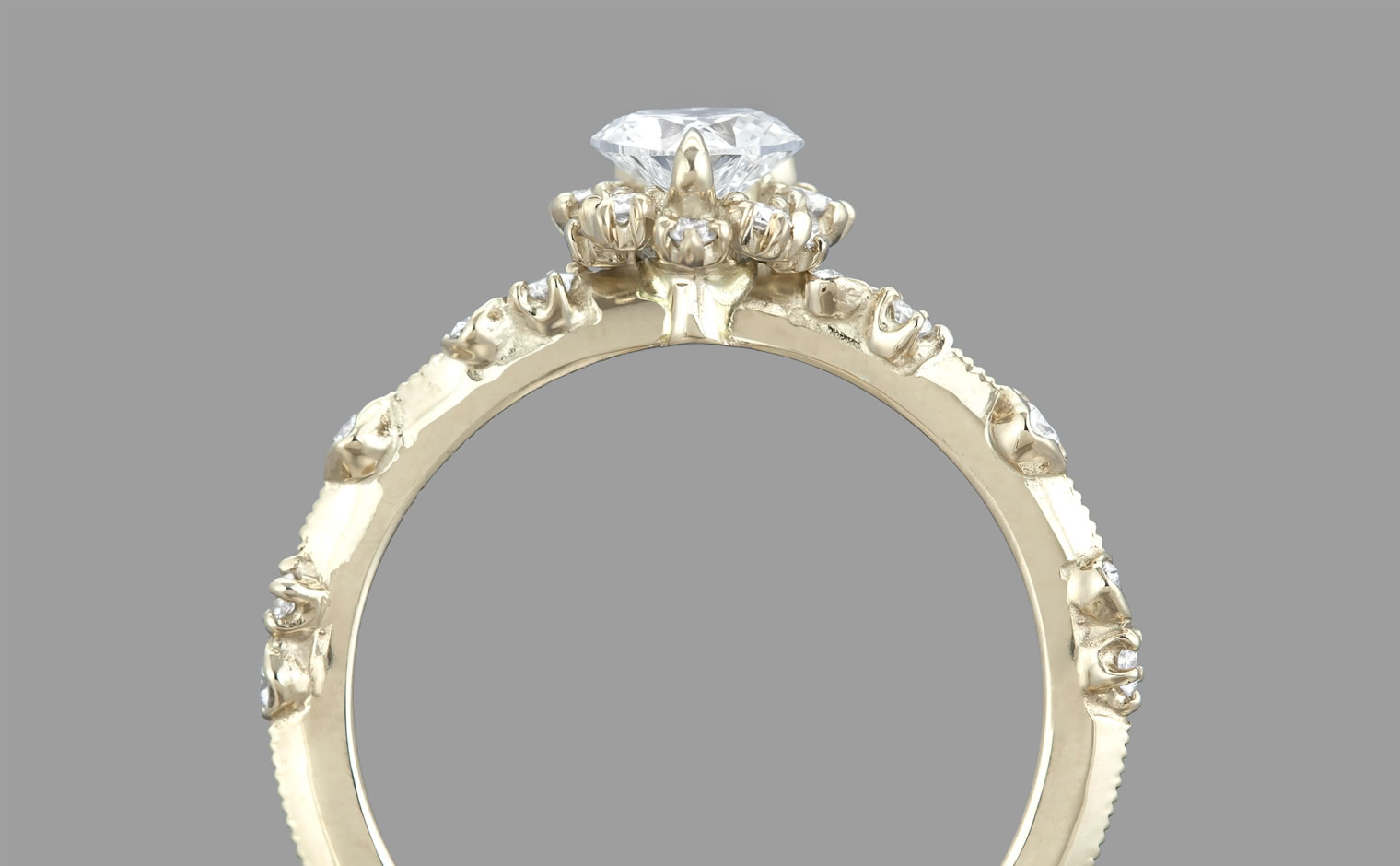 Thin, elegant prongs have been shaped to cradle this diamond, giving it all the center stage it deserves.Drawing the eye even further in, smaller diamonds are set in a hand-created setting that fans out in a gentle halo that gives a presence larger than life.