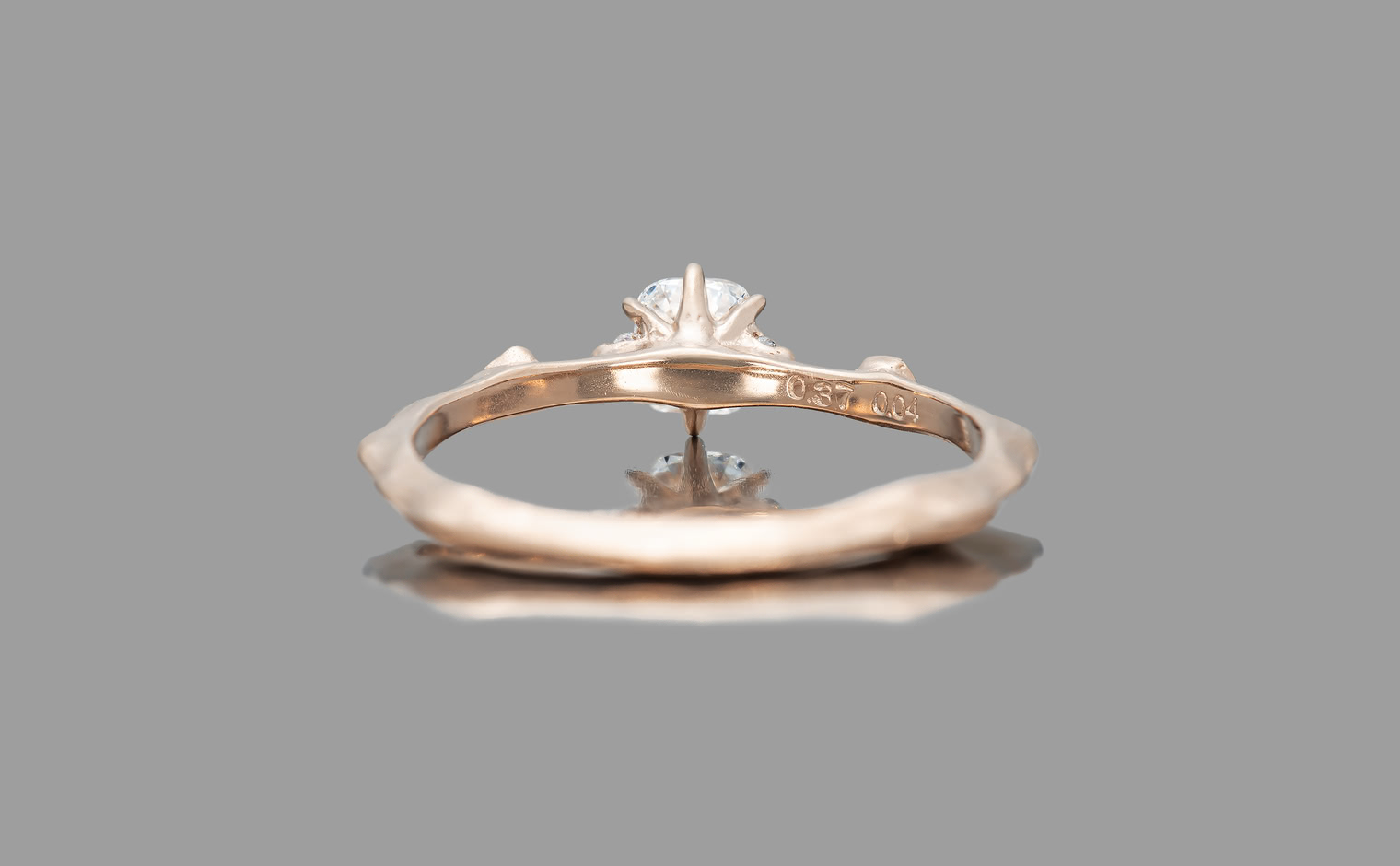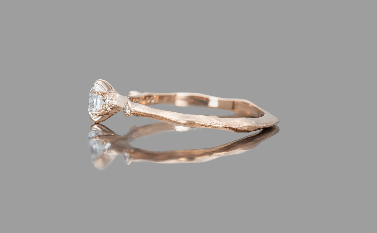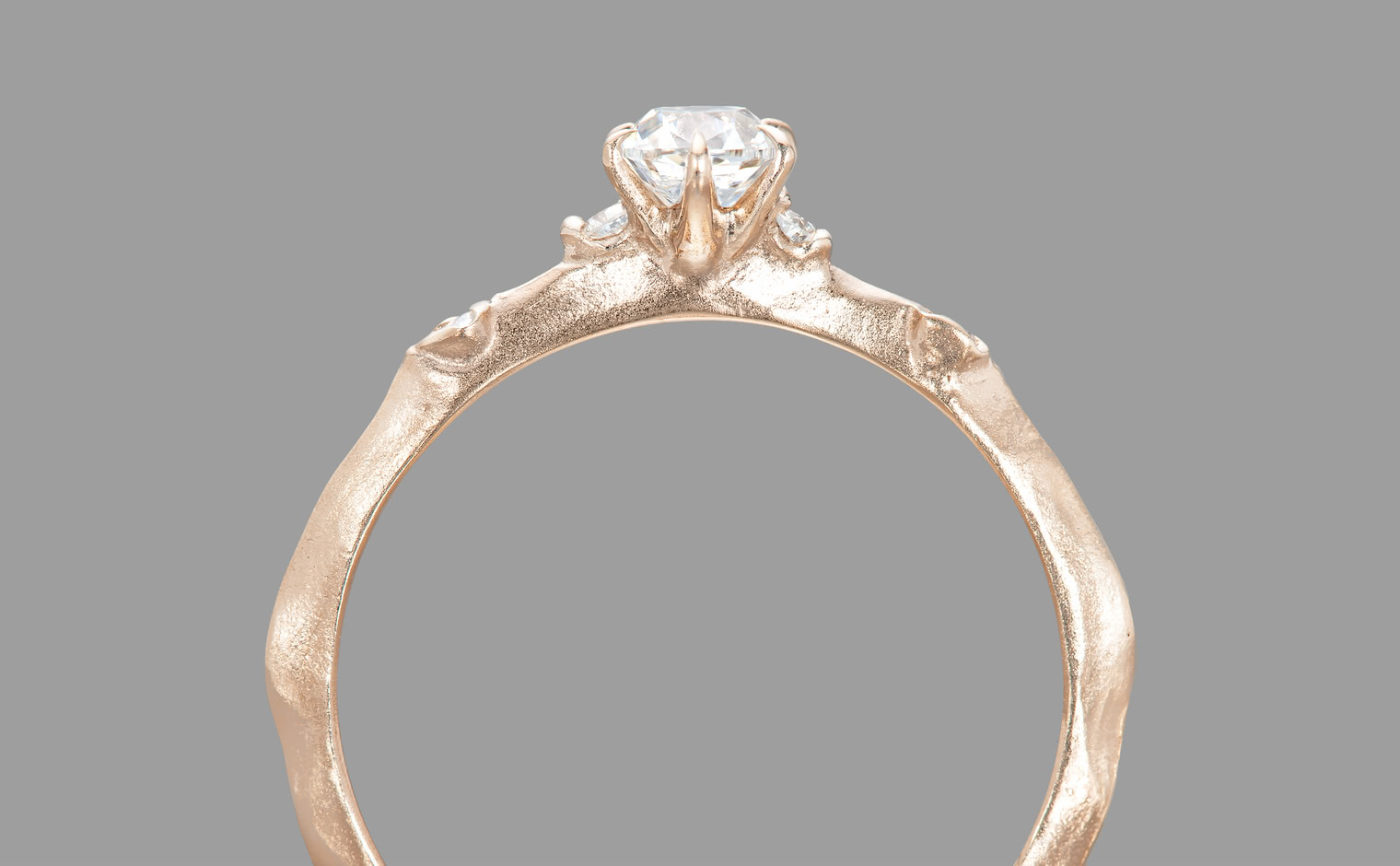 A natural diamond at the center of the Blossom setting, the floral form that anchors the September Eight collection. Petals in gold open around the stone on a branch-style band. From the September Eight collection, where each piece draws from the language of ikebana.
