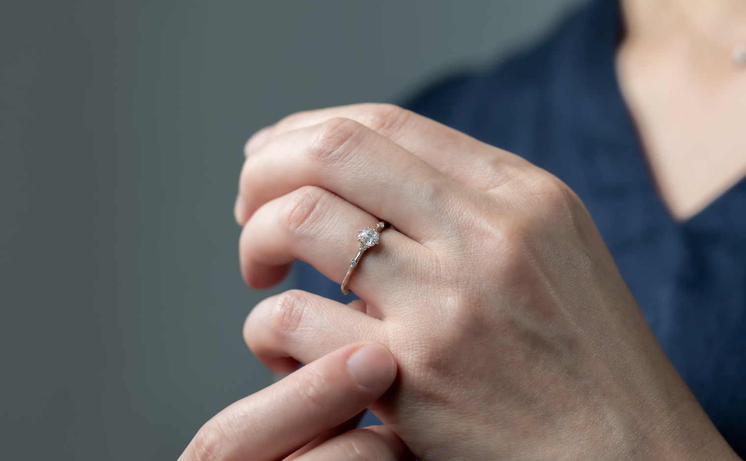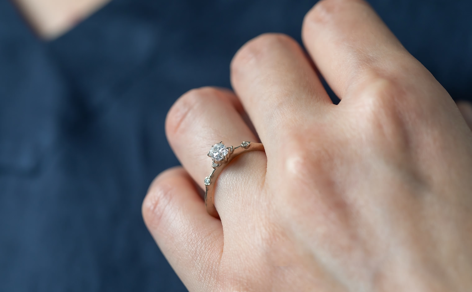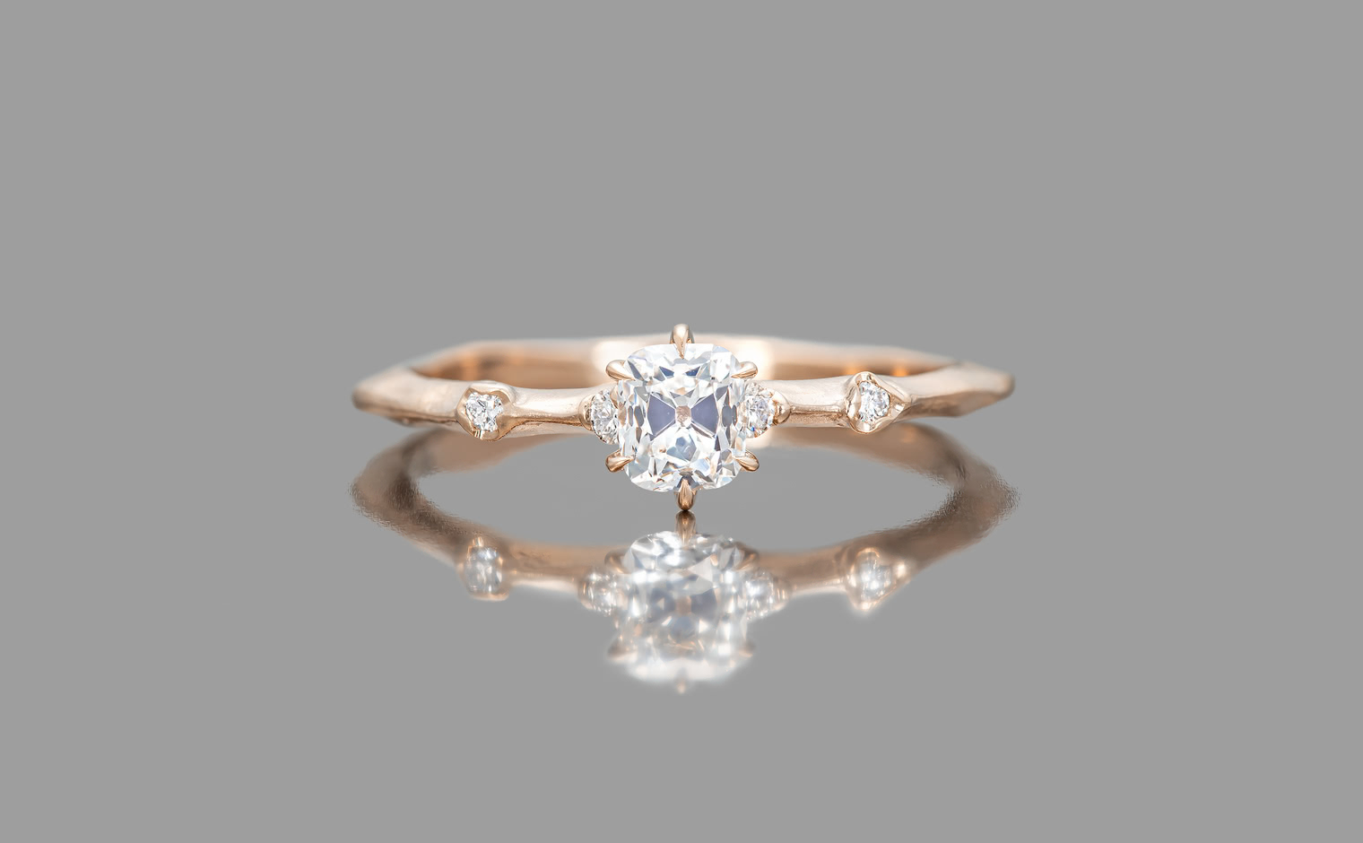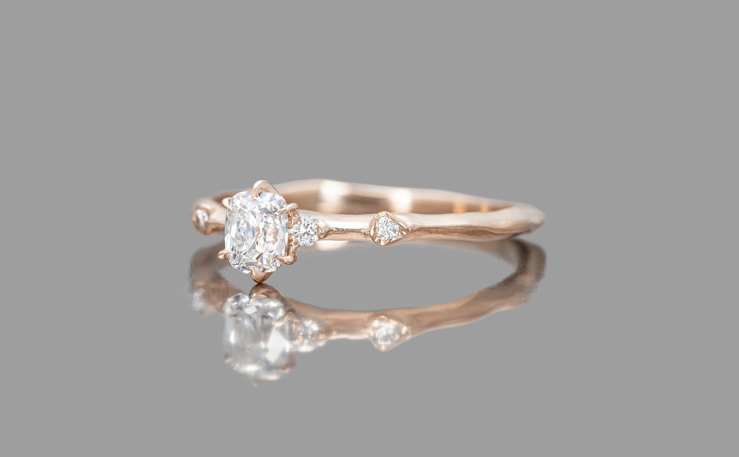 A natural diamond at the center of the Blossom setting, the floral form that anchors the September Eight collection. Petals in gold open around the stone on a branch-style band. From the September Eight collection, where each piece draws from the language of ikebana.