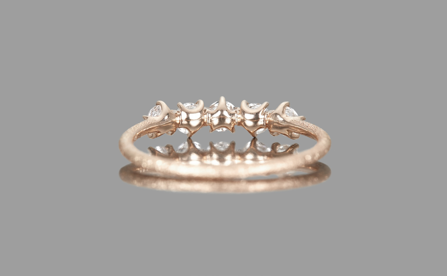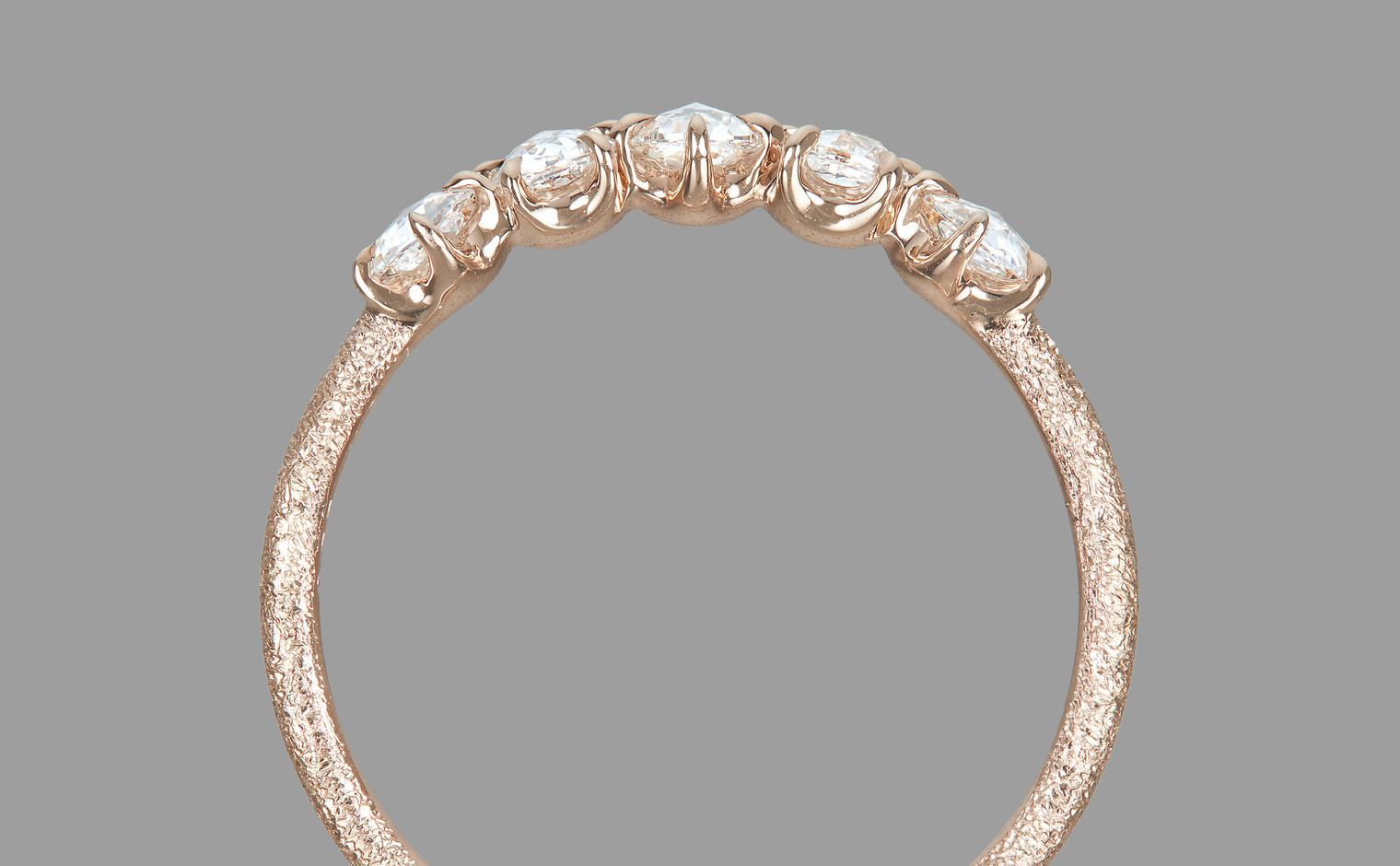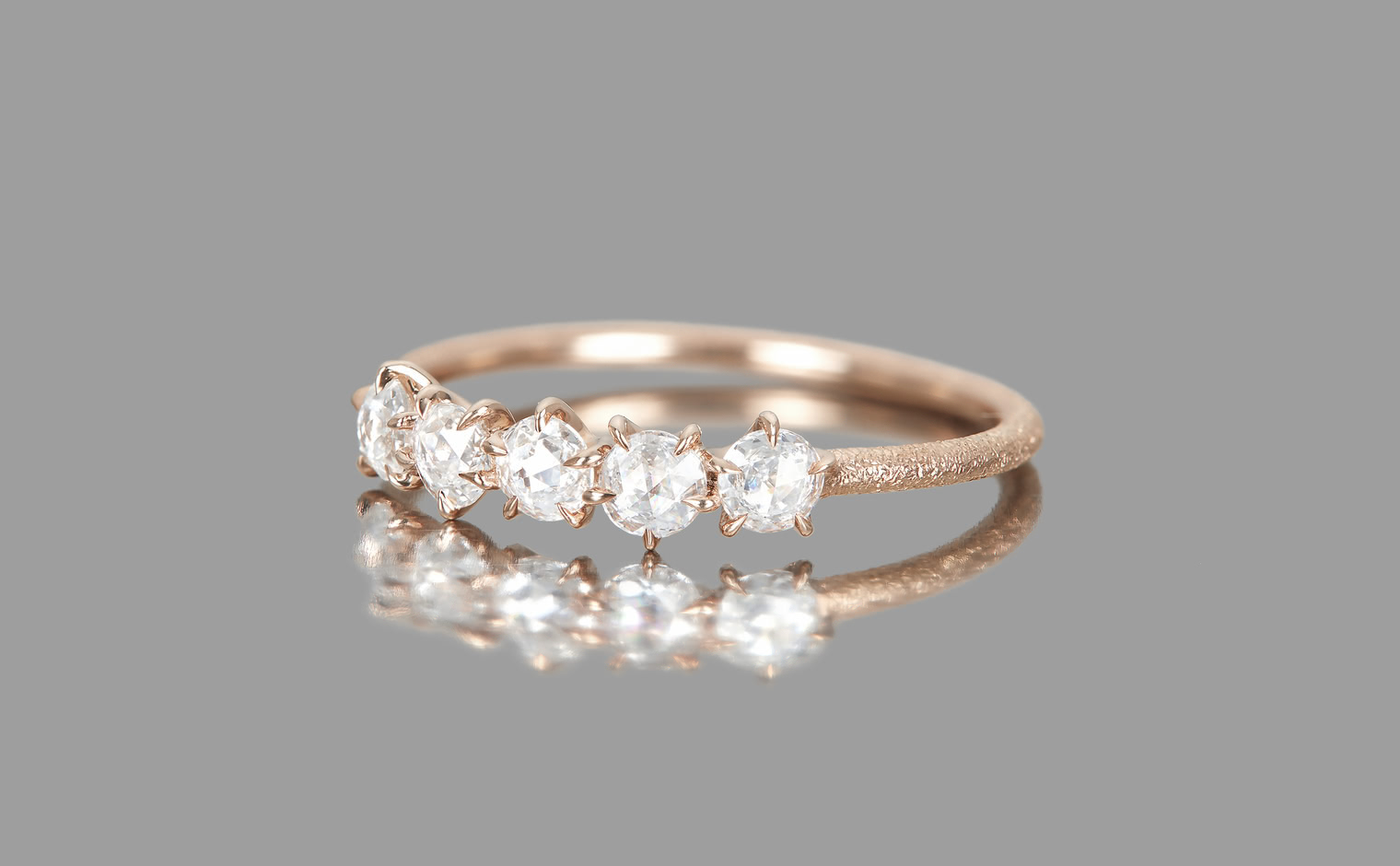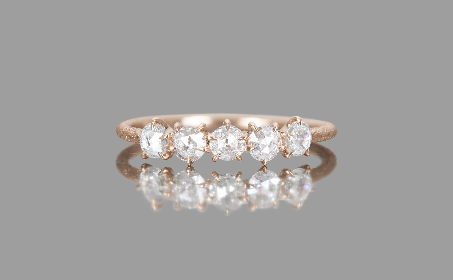Two rose cut diamonds set flat-face-to-flat-face at the center, creating a dimensional diamond bead. Flanked by additional diamonds on a stardust-finished band. From the September Eight collection, where each piece draws from the language of ikebana.