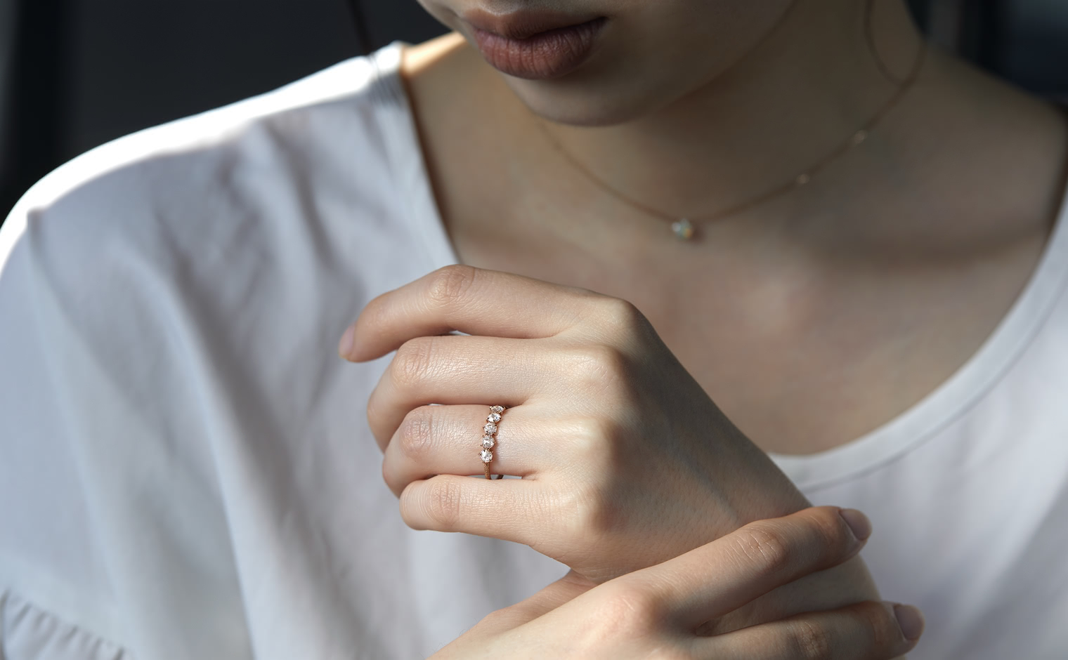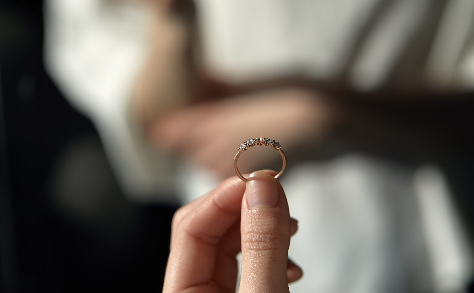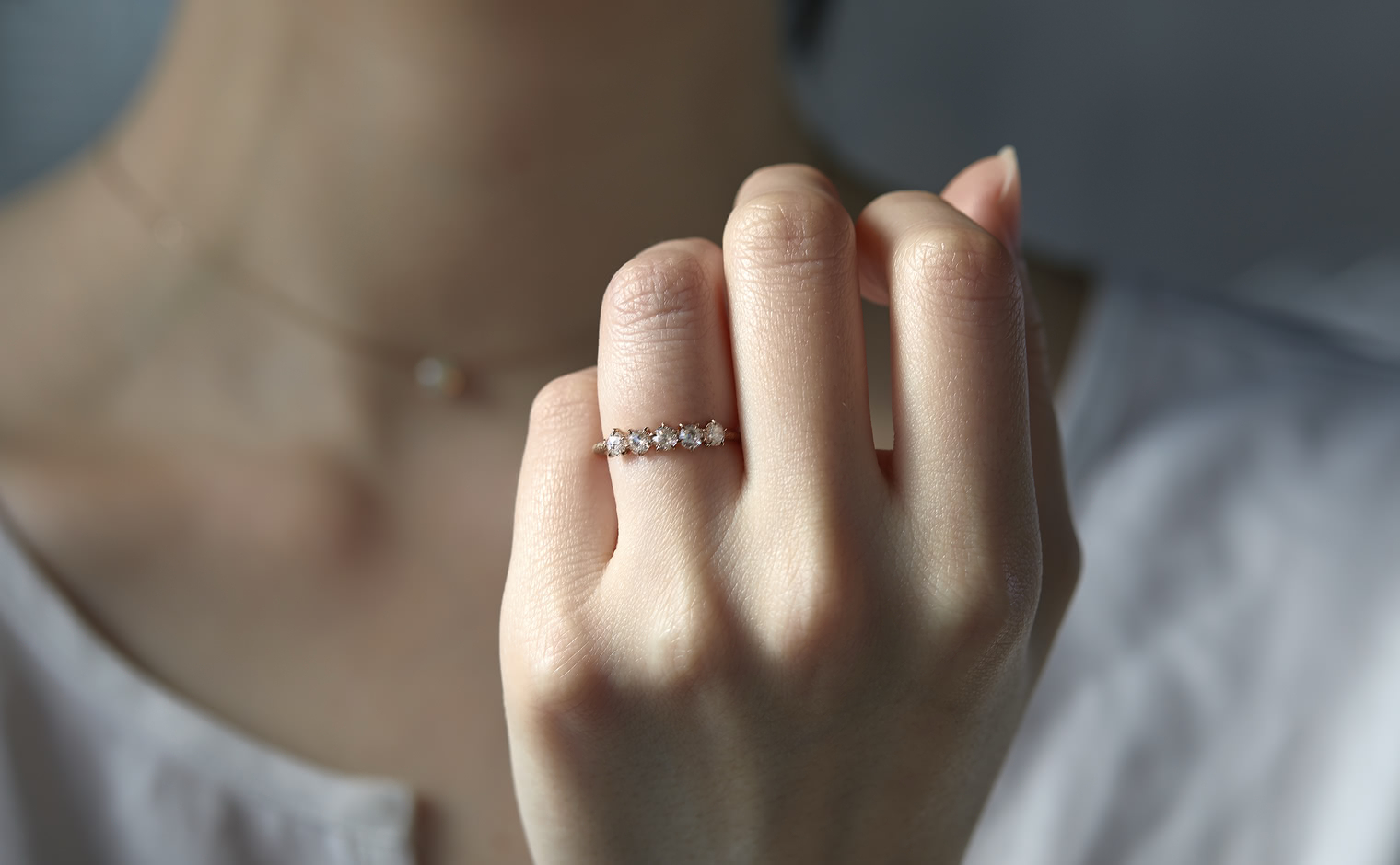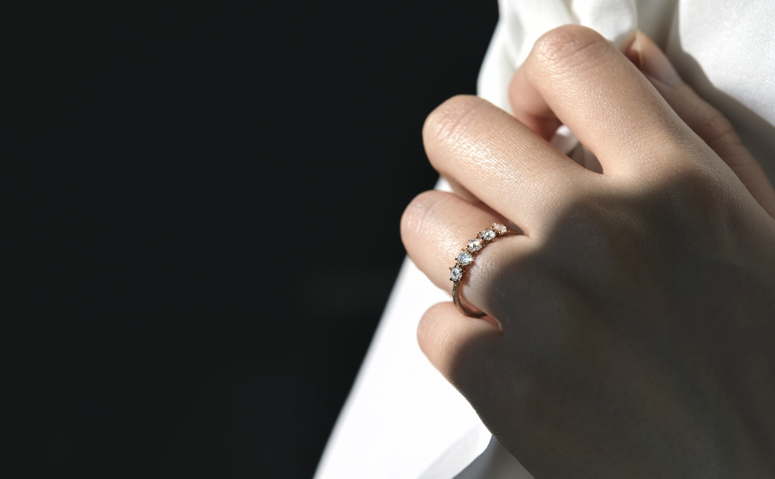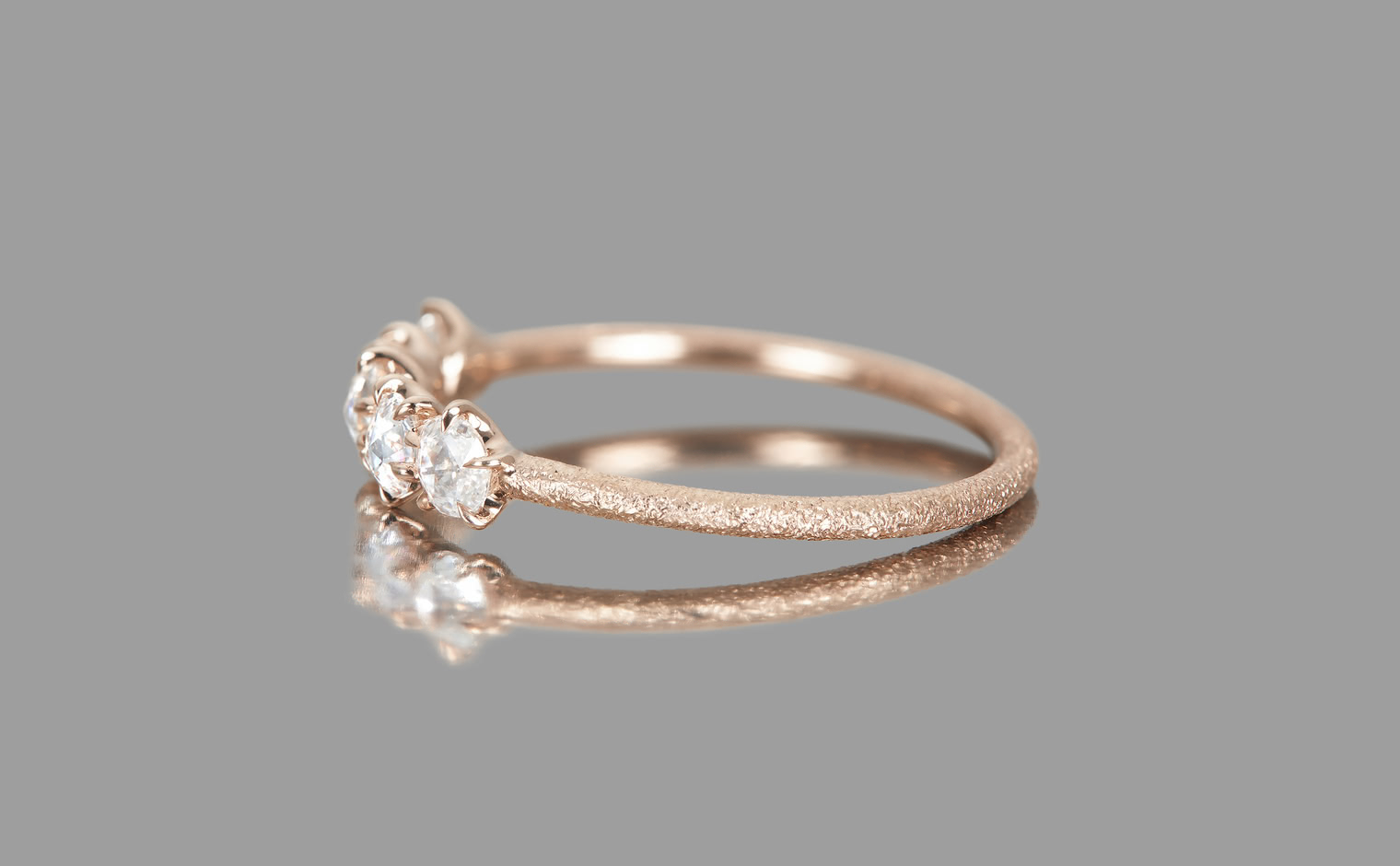Two rose cut diamonds set flat-face-to-flat-face at the center, creating a dimensional diamond bead. Flanked by additional diamonds on a stardust-finished band. From the September Eight collection, where each piece draws from the language of ikebana.