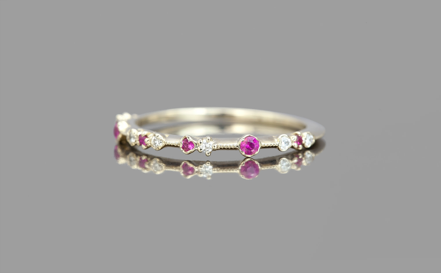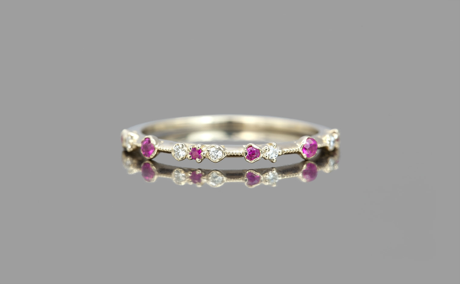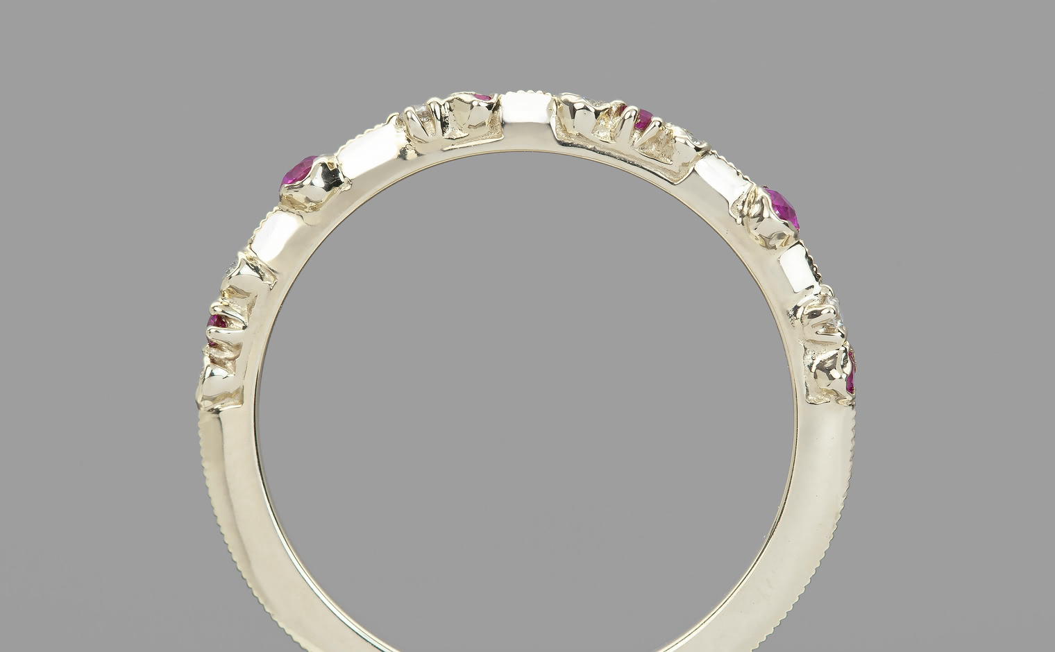 The classic romantic ruby is captured in the perfect ring for every occasion. Deep hues rubies smolder next to brilliantly sparkling white diamonds on a thin band of specifically blended gold.