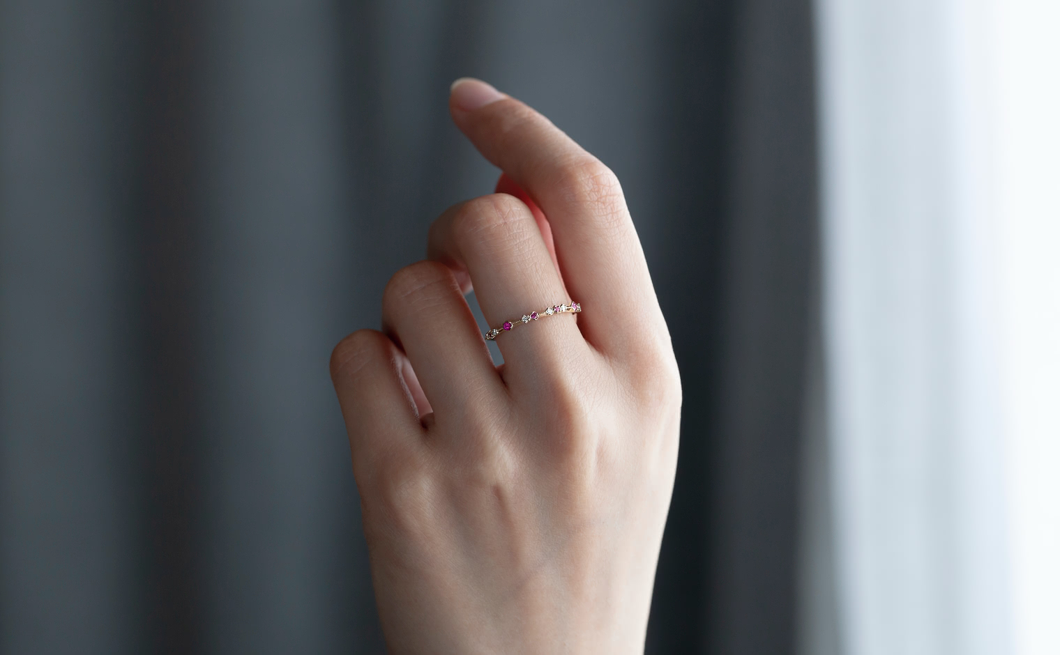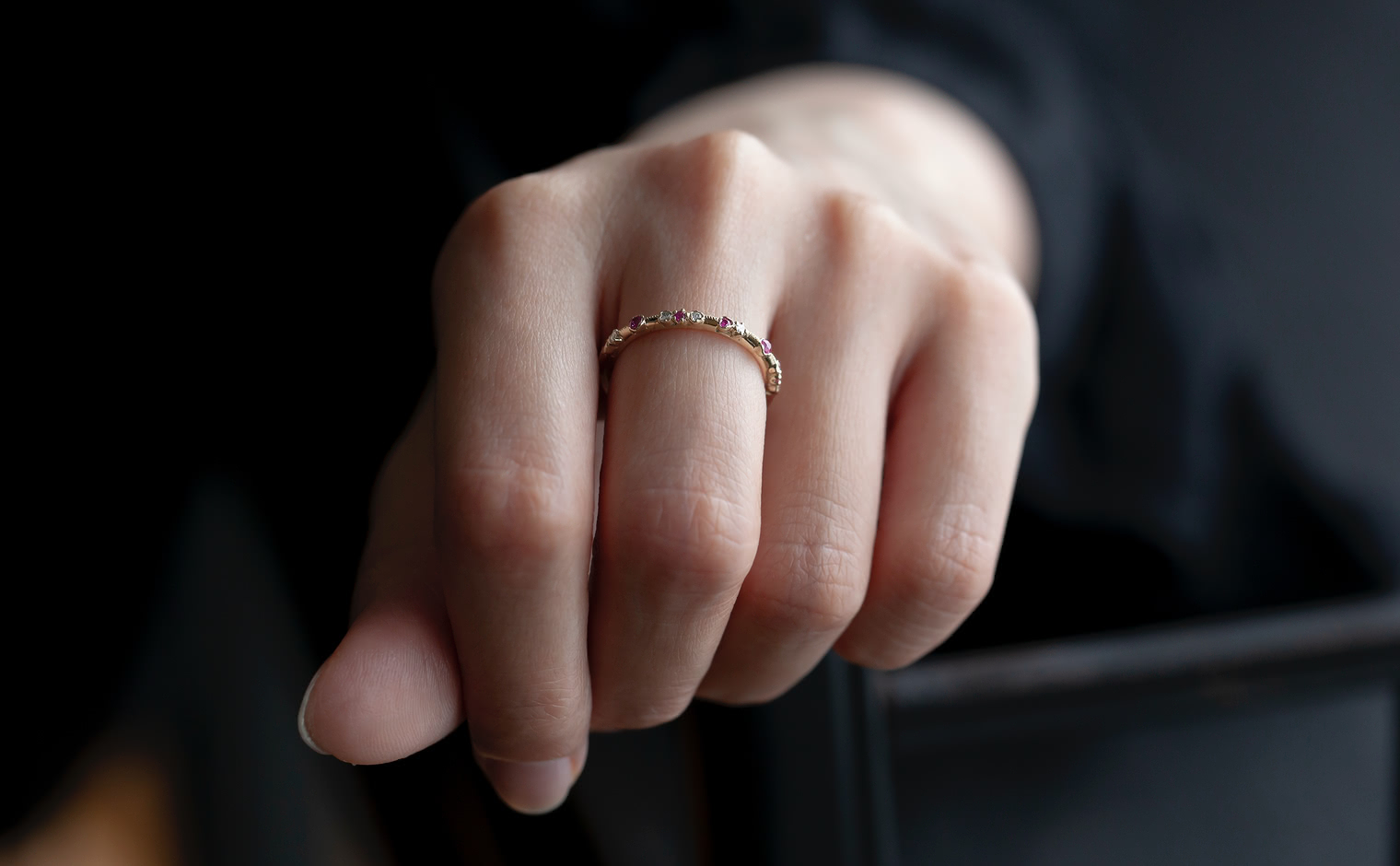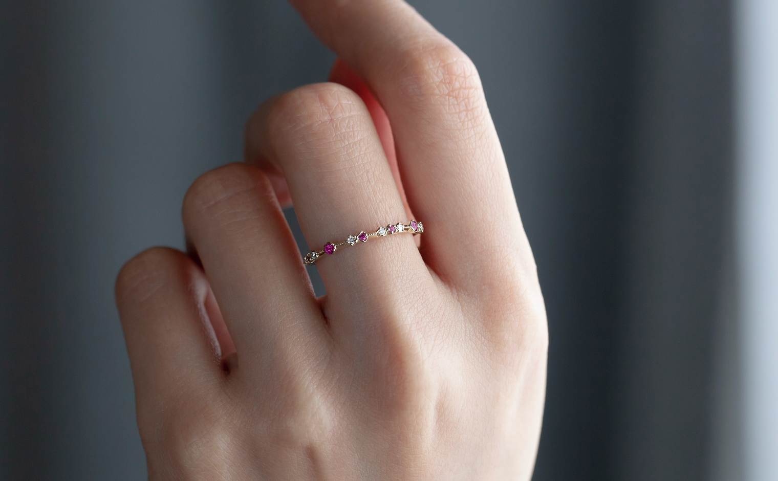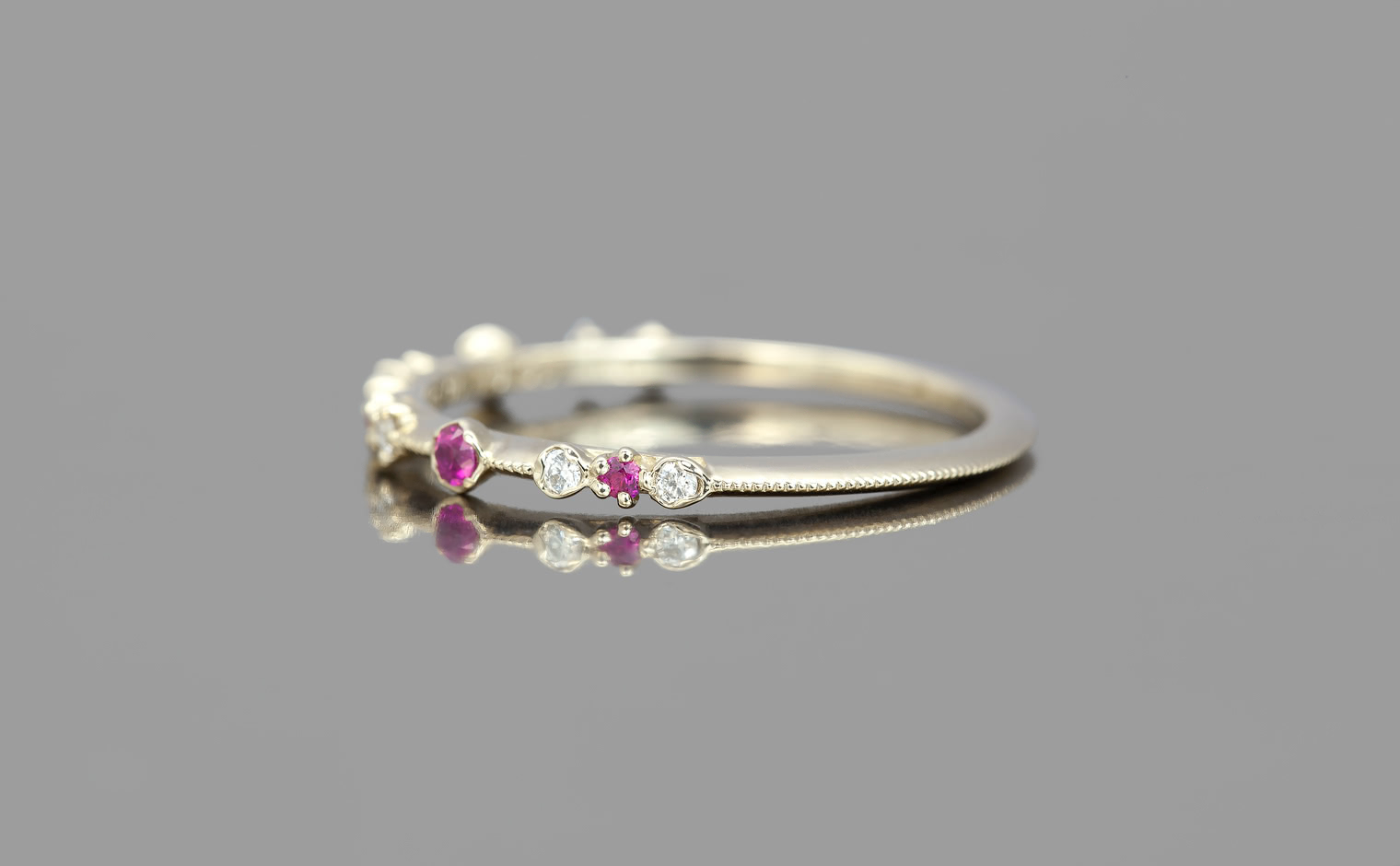 The classic romantic ruby is captured in the perfect ring for every occasion. Deep hues rubies smolder next to brilliantly sparkling white diamonds on a thin band of specifically blended gold.