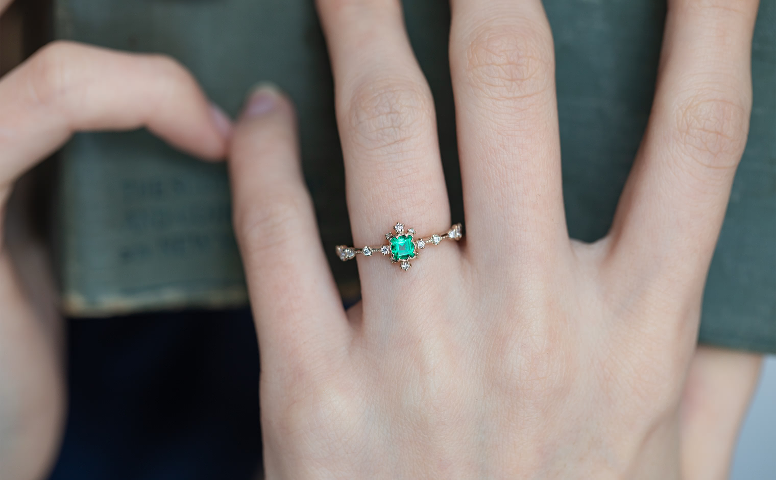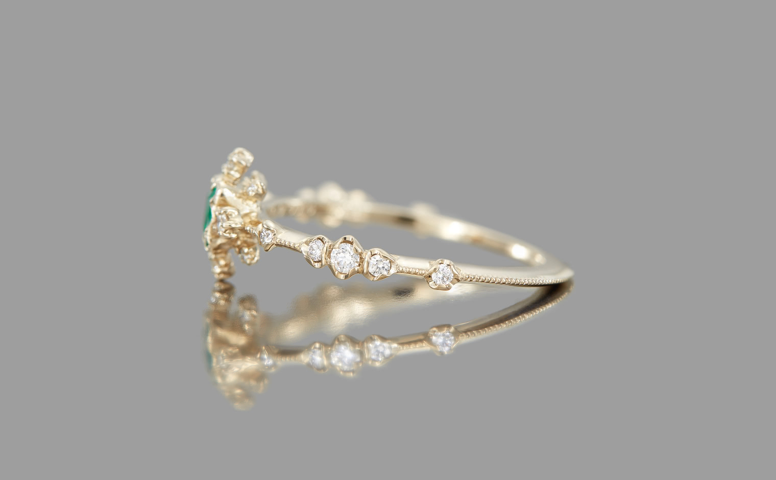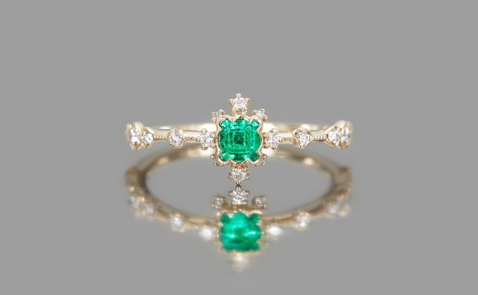 Embark on an out-of-this-world journey with the Snowflake Ring Supreme-Emerald, ever true to your heart. The vivid cushion cut emerald center takes center stage against a brilliant halo of diamonds, with delicate accents embedded on the finely crafted, thin milgrain-applied beige gold band.