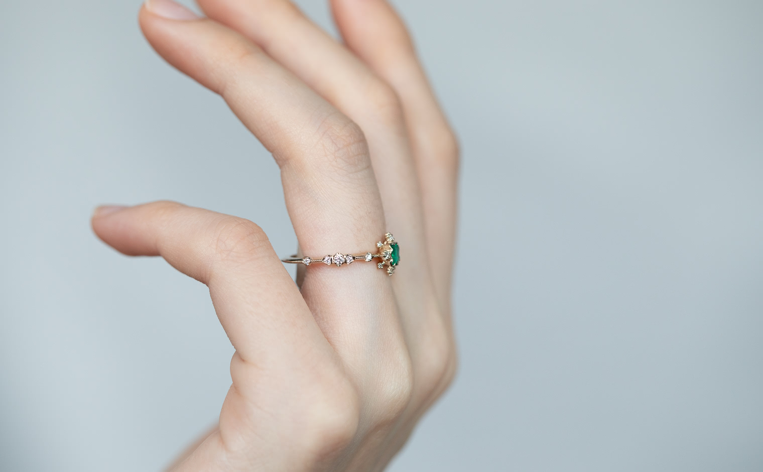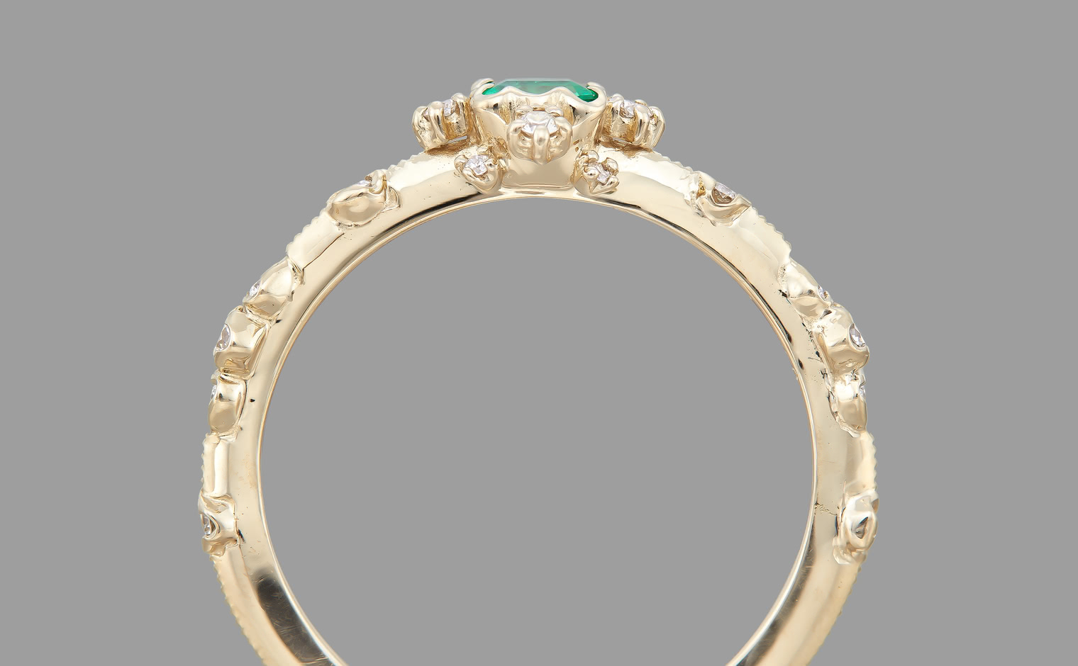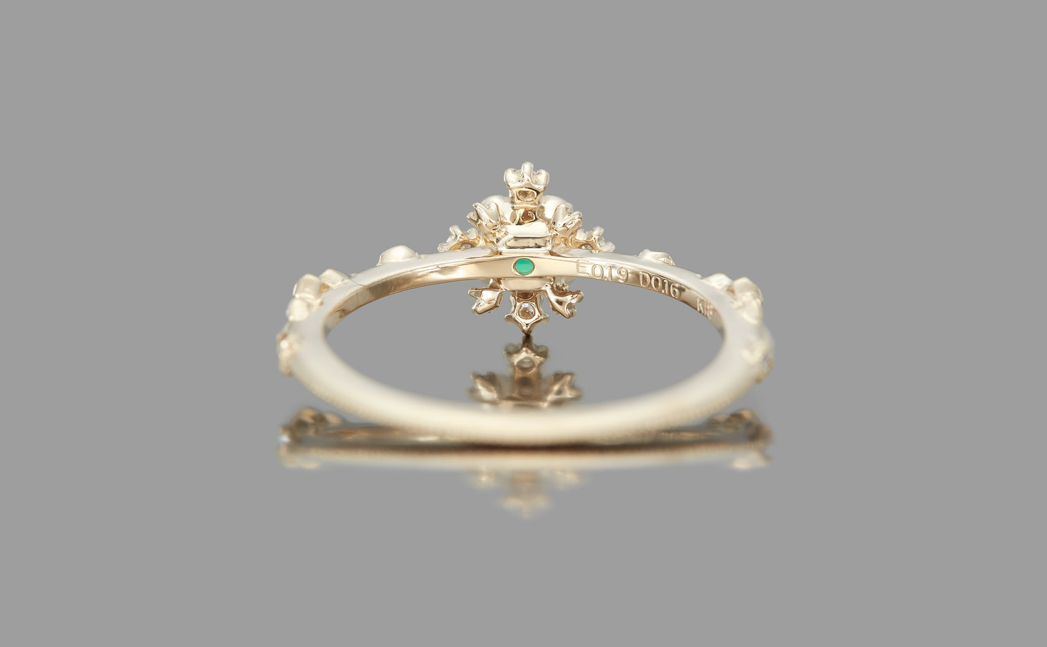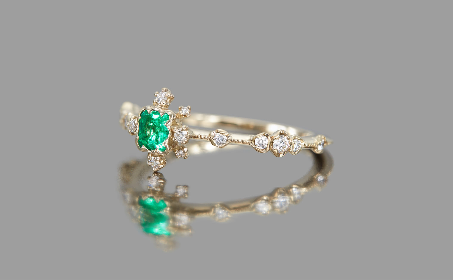 Embark on an out-of-this-world journey with the Snowflake Ring Supreme-Emerald, ever true to your heart. The vivid cushion cut emerald center takes center stage against a brilliant halo of diamonds, with delicate accents embedded on the finely crafted, thin milgrain-applied beige gold band.